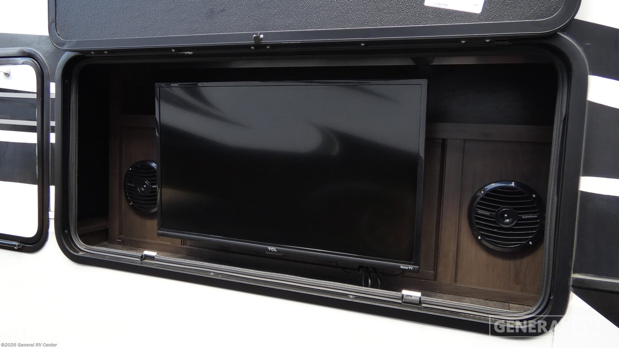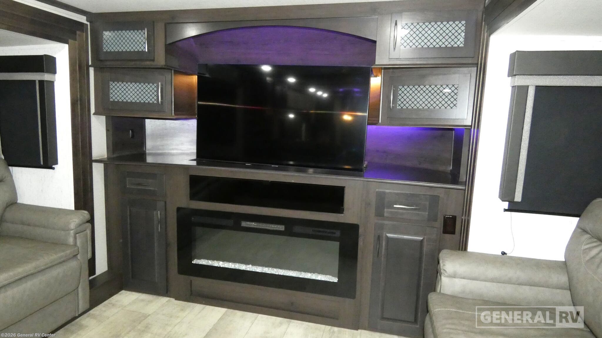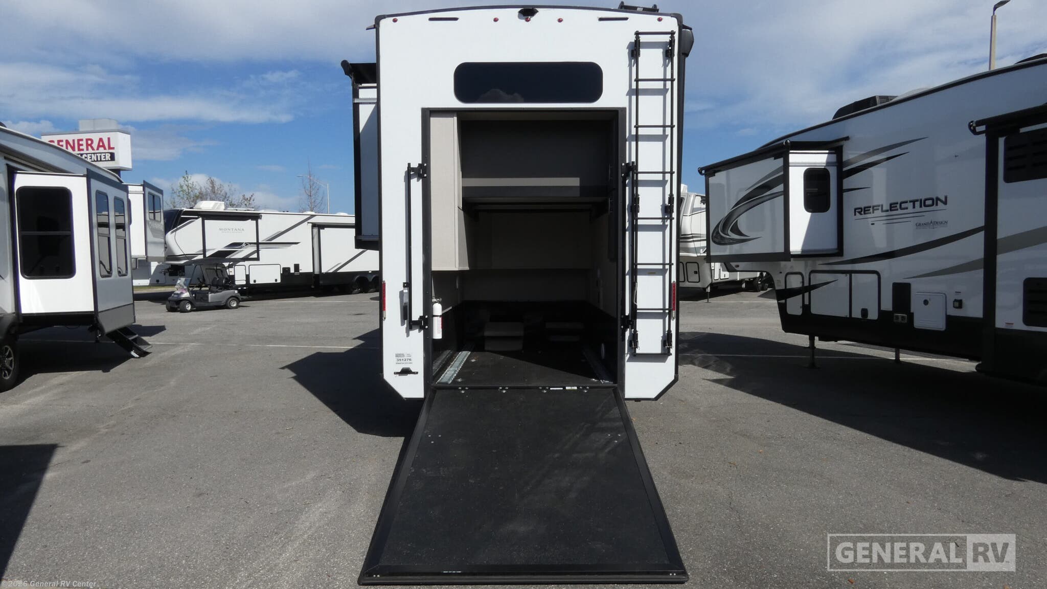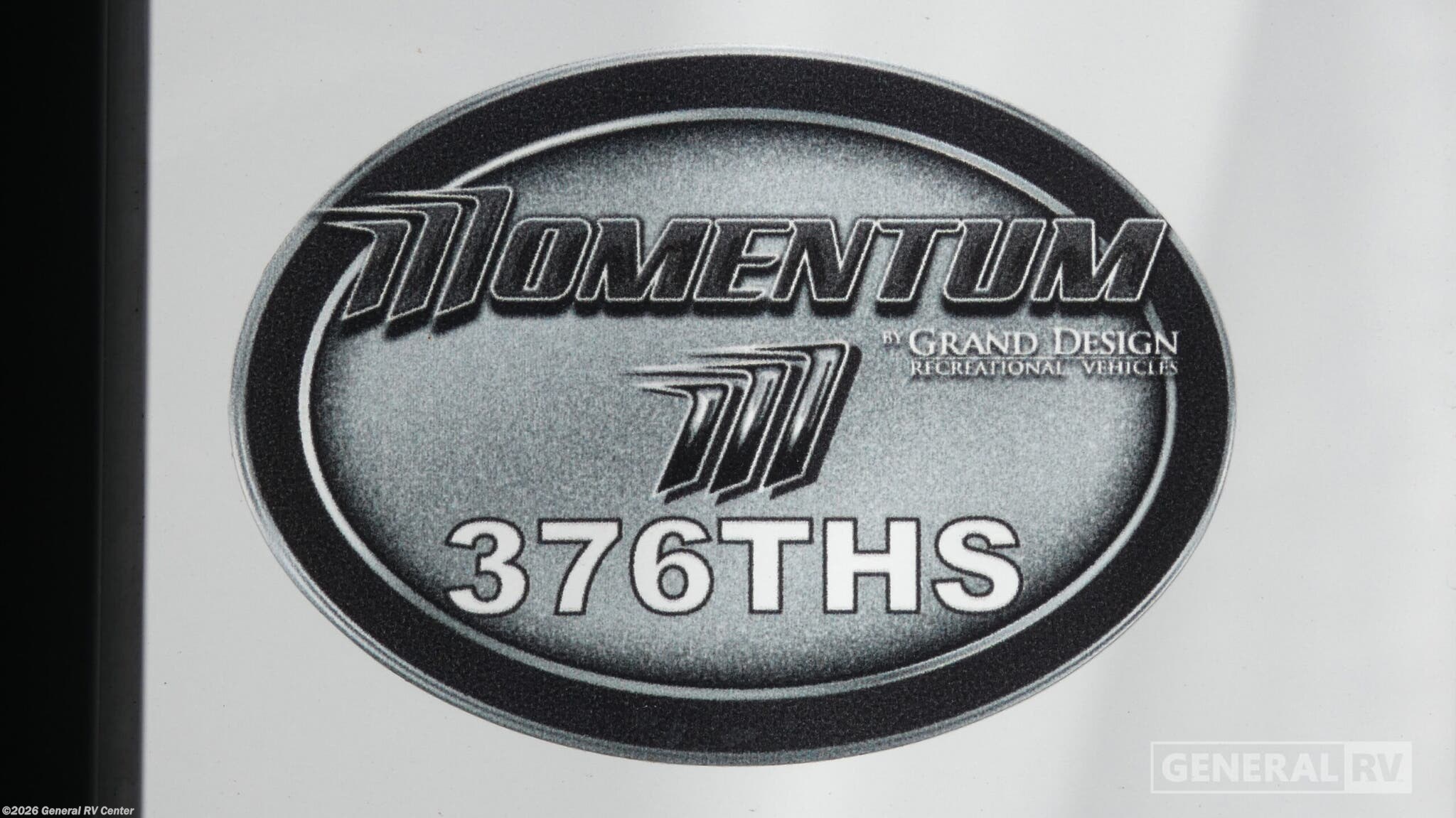 Grand Design Momentum fifth wheel toy hauler 376THS highlights: Below-Floor Garage Separate Living Room Rear Bedroom Theater Seating Kitchen Island Outside Kitchen & TV This unique fifth wheel offers a below-floor garage for your toy(s), an outside kitchen and LED TV, two pass-through compartments and two awnings! The front, separate living area gives you a place to relax with opposing tri-fold sofa slides and theatre seating across from the telescoping LED TV with a fireplace below. The separate kitchen is spacious as well and includes a kitchen island with stools, a hutch and a desk, plus a free standing dinette within a slide out. The pantry even has a prepped space for a washer/dryer option to keep the linens clean. You will enjoy dual access to the full bath, and the rear bedroom provides a walk-around queen bed or choose the king option, plenty of storage and USB charging outlets. The Momentum fifth wheel toy haulers by Grand Design are built for four seasons of travel with your off-road toys and include luxurious accommodations throughout for extreme living! Each is constructed to a superior standard with the thermal roof design, the full-laminated walls, and the triple insulated garage floor. The MORryde CRE3000 suspension system and rubber pin box, plus the upgraded axle hangers provide the performance and smooth towing you desire, while the interior offers luxury such as color changing LED accent lighting, raised panel hardwood cabinet doors with hidden hinges, and a central vacuum system. Each toy hauler also includes four packages, including the Garage Package with Tuff-Ply gas and oil resistant flooring, the Weather-Tek Package with a Stealth AC System, and the Interior Luxury Package with solid surface countertops!