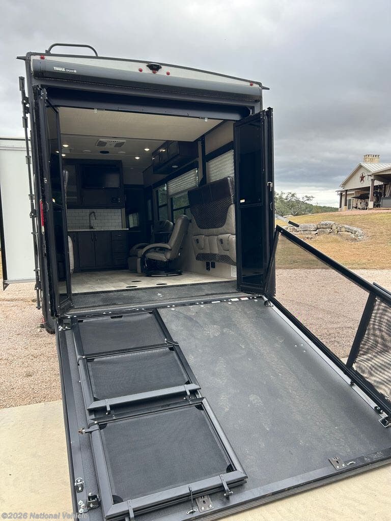 Inside, the 25G layout features two slide-outs that open the living area and garage zone into something inviting and flexible. The front section serves as a full living/kitchen area with residential-style cabinetry, a double-door stainless refrigerator, and modern finishes. The rear garage space is around 13 feet long, has built-in tie-downs to secure ATVs or bikes, and the ramp door that can convert into an outdoor patio zone. Bedrooms and sleeping zones accommodate up to six, and the full walk-in shower and real kitchen set it apart from more spartan toy haulers.