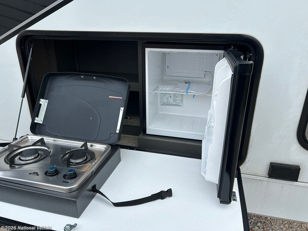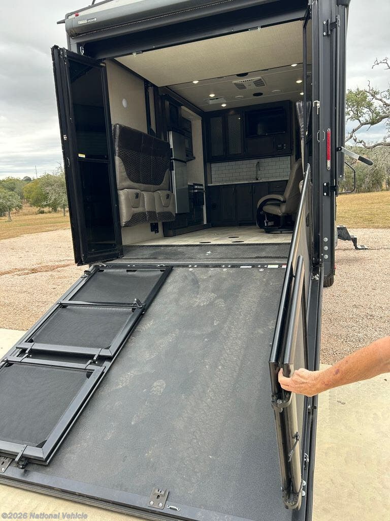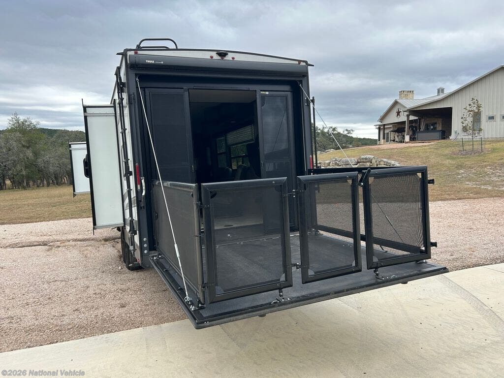 On the exterior and build-quality side, this model boasts a wide-body chassis (101?), insulated and heated under?belly, large fresh water capacity, and a dedicated fuel station (30 gallon) for toys. The exterior also features a 19? power awning with LED lights, frameless tinted windows, and heavy-duty ramp door hardware. It's a trailer that?s equally comfortable for weekend toy hauler runs or full-time use thanks to the combination of rugged cargo space and refined living amenities.
