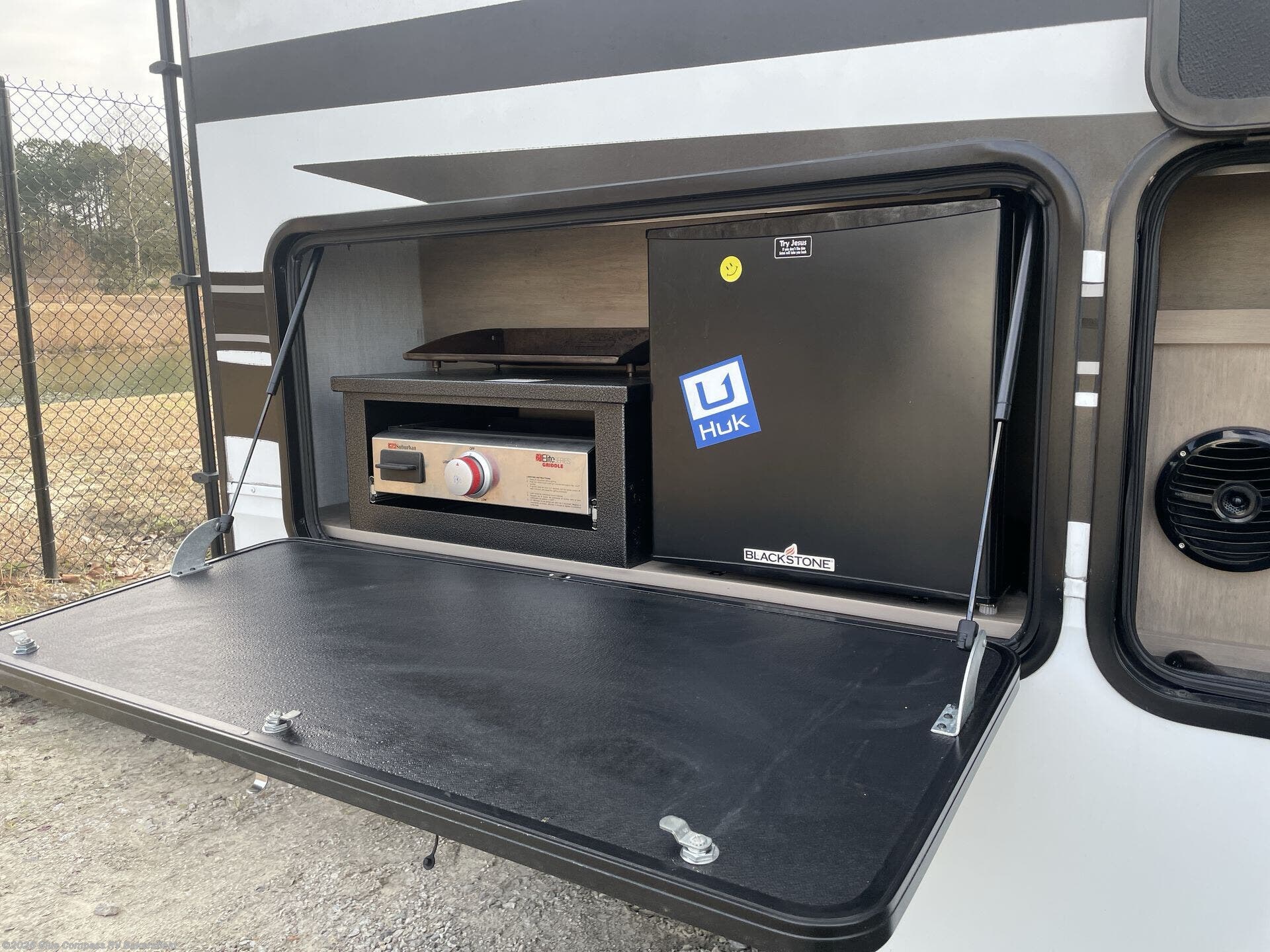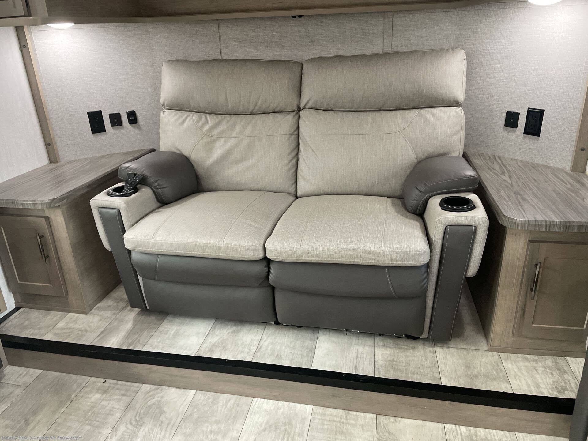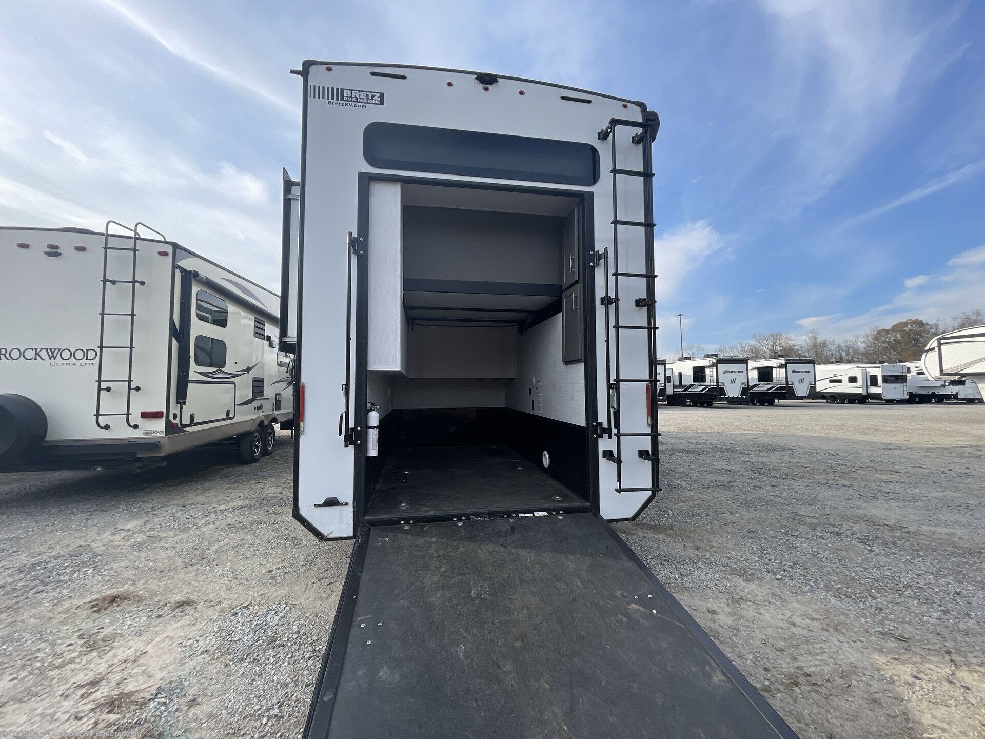 This toy hauler has all the space you need to enjoy a weekend with friends, or a week long family vacation. The fuel station will certainly keep the toys going, and the inside amenities including a full featured kitchen with butler pantry, 18 cu. ft. refrigerator, cooktop and oven, plus microwave and island with bar stools will make mealtime easy. You can easily whip up family favorites to enjoy outside or inside gathered at the free standing dining table with four chairs, and have snacks in the front living area with two 70" tri-fold sofas, plus theater seating or optional lounge chairs instead. The rear master suite is a couple of steps up and features a queen bed or optional king, a slide out wardrobe with drawers beneath, plus easy entry into the full bath with skylight over the shower, and a seat for relaxing after a long day of trail riding. There is a bed lift system that raises the bed to provide up to 77" of headroom space in the garage area below where you can easily load up your favorite ride on toys using the rear ramp door.
