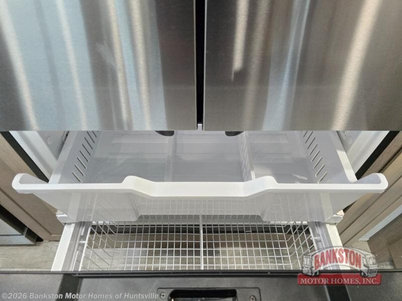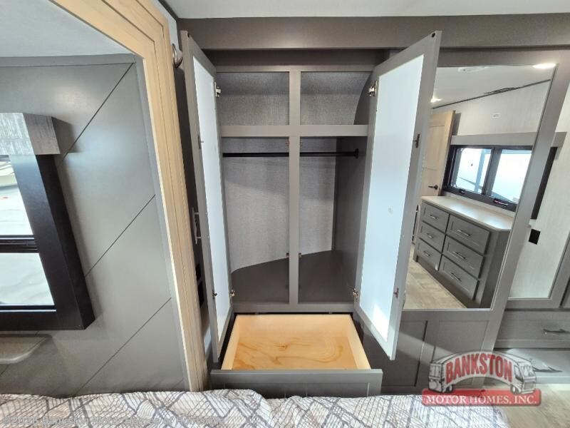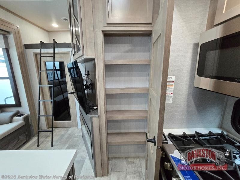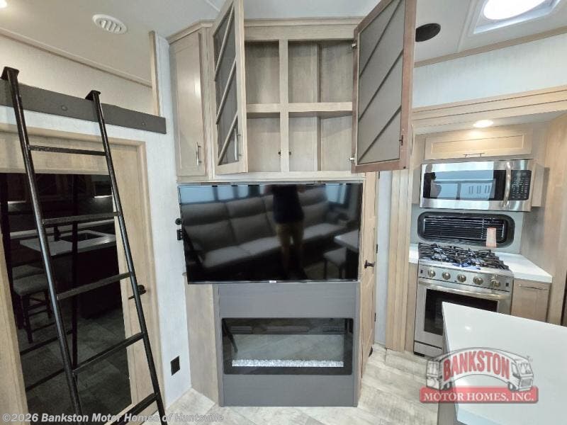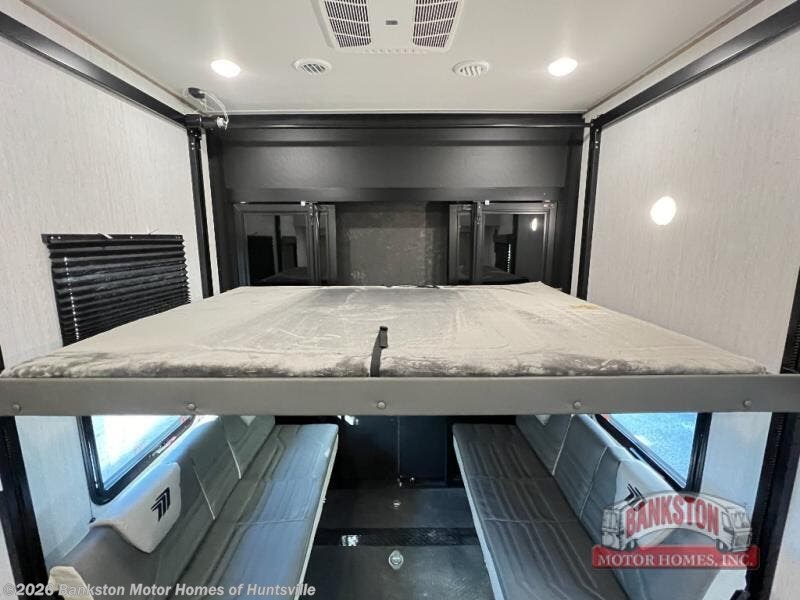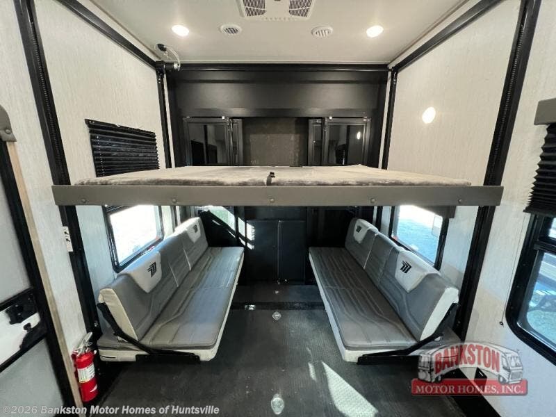 Traveling with friends and family can be comfortable when you have a full double entry bathroom and a half bath available when camping and enjoying the trails on your off-road toys! You will have an 11' garage space that can become a second living/dining area as well as a bedroom if you decide to add the Happi-Jac rollover sofas and a table with a top bed option. There is an overhead loft bed and a four-seat sofa slide for more sleeping space in the main living area. Everyone can watch the LED TV when waiting for dinner, and enjoy the fireplace on those chiller nights. The kitchen island offers a sink to wash dishes, extra counter space for serving meals and two stools to dine at. The cook will love all the upgraded appliances, and the space thanks to the slide. The front bedroom gives you a queen bed slide with a king bed option, lots of clothing space, and a slide top dresser for even more storage.
