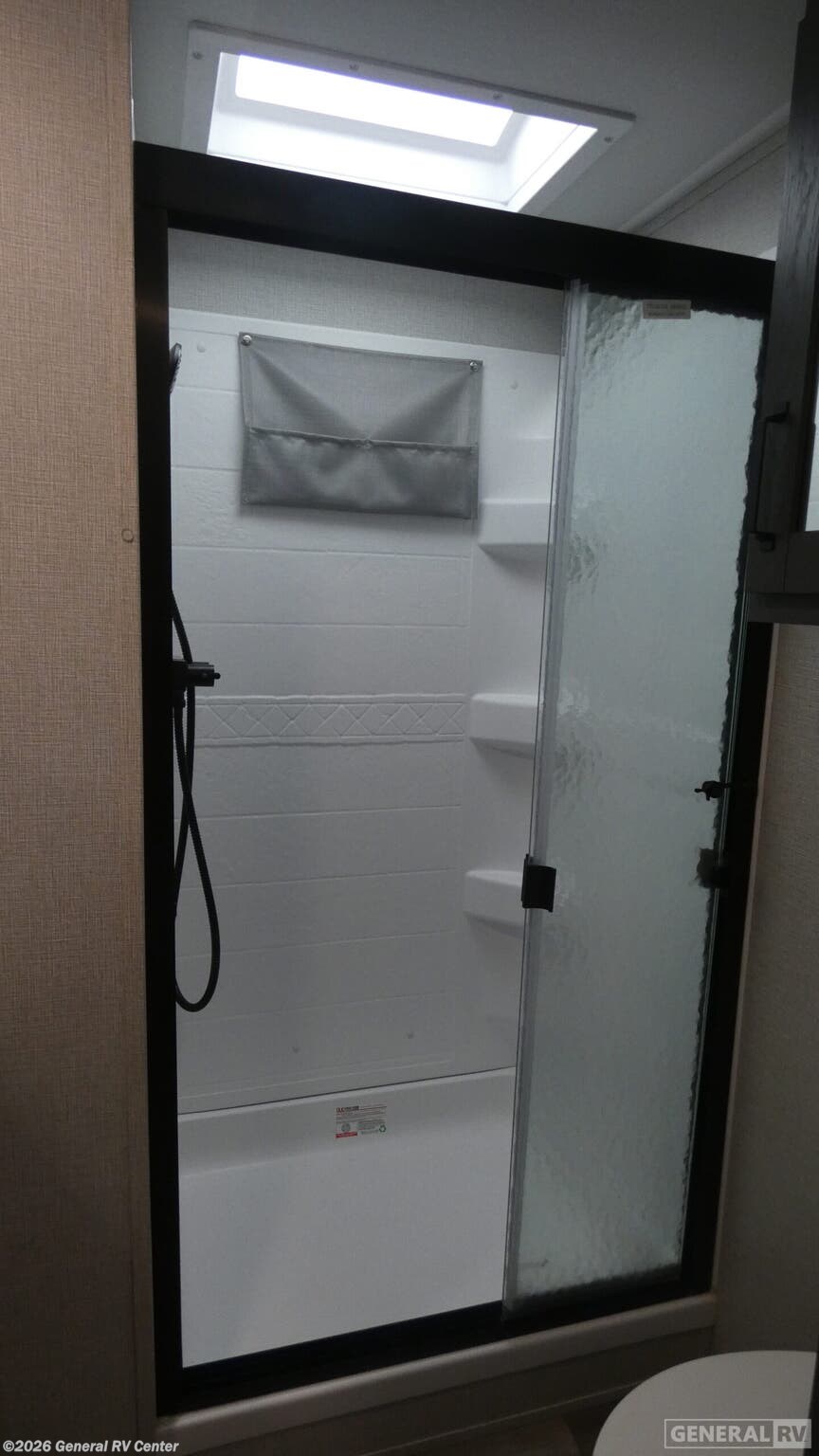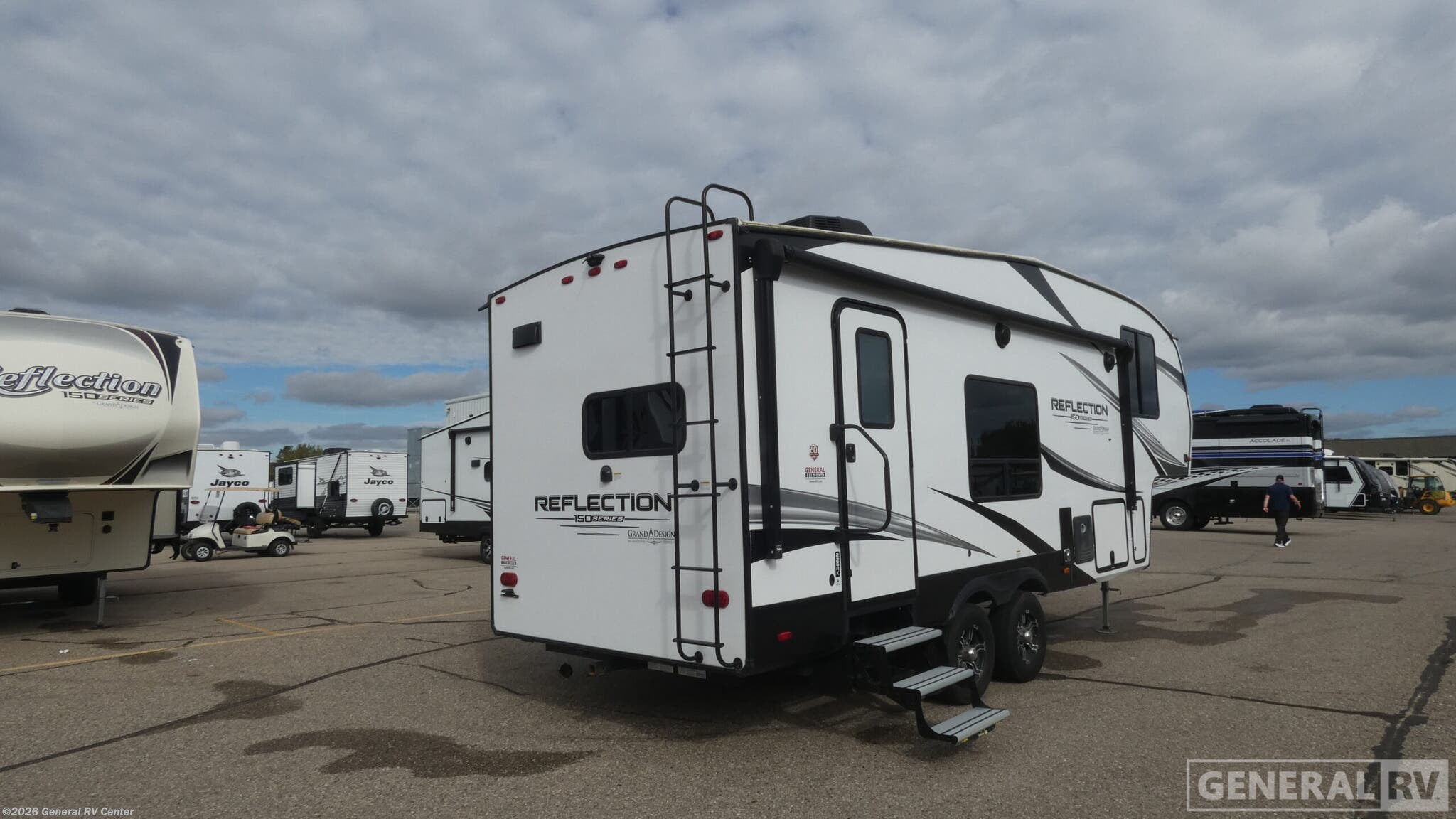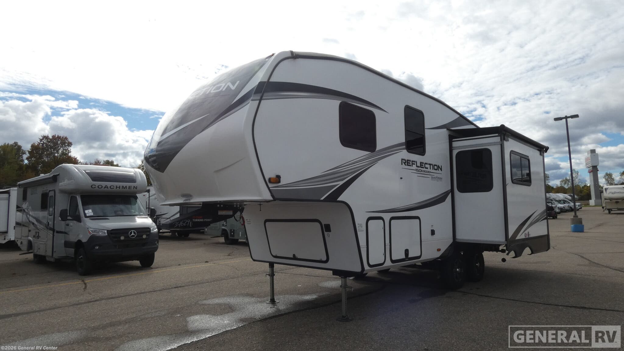 Enjoy a weekend getaway at a campground or off-grid in this fifth wheel! The front private bedroom has a queen bed for you to lay your head on at night and overhead cabinets to keep things out of the way. Inside the full bathroom there is a shower with a skylight for added natural lighting as you get ready each morning. Once you have prepared a delicious home cooked meal at the rear kitchen, head to the booth dinette for a comfortable place to enjoy it. What better way to wind down your nights than to relax on the 70" theatre seating and watch your favorite movie on the 40" LED HDTV. With any Reflection 150 Series fifth wheel by Grand Design, there is more available payload capacity and a broader range of half-ton trucks capable of towing this fifth wheel, and no slider hitch is needed thanks to the 90-degree turning radius which makes them short bed friendly and easier to tow. The mandatory Ultimate Power package provides a "One-Touch" automatic leveling system and a detachable power cord with LED light for easy setup, plus motion sensor pass-through lighting and entry lighting, and the Tire Linc TPMS will help you stay safe on the road. The interior offers residential luxury from the cabinetry and premium congoleum flooring, plus the booth dinette to the residential-style window treatment. Make your refined decision today!