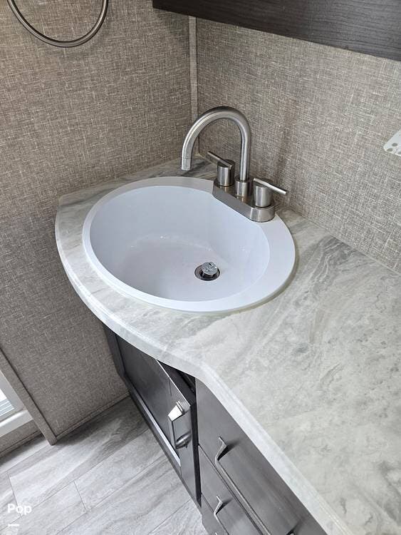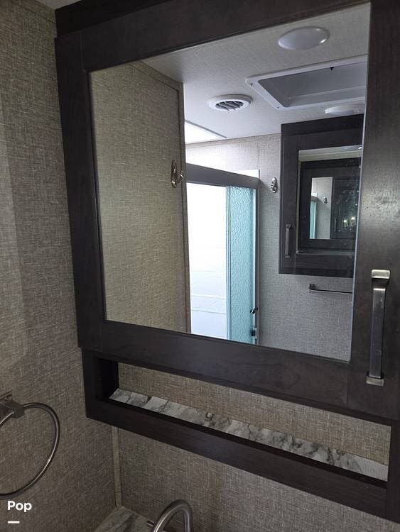 The bathroom is equipped with a vanity sink, a medicine cabinet above, a shower, and a toilet. The RV is also equipped with an On-Demand Hot Water heater!!