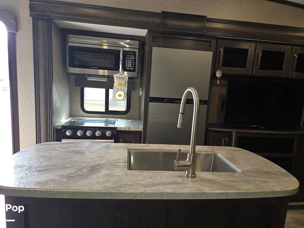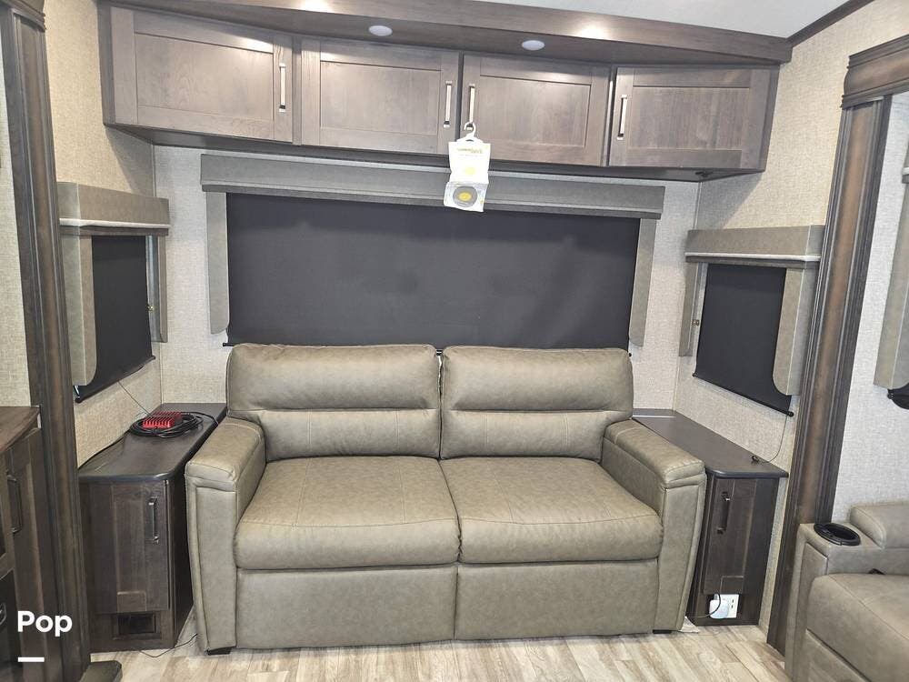 On the exterior, you can relax under the large power awning and enjoy the exterior kitchen and exterior TV.