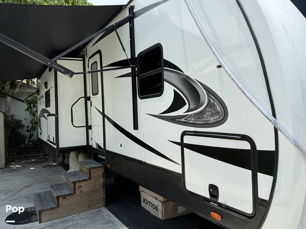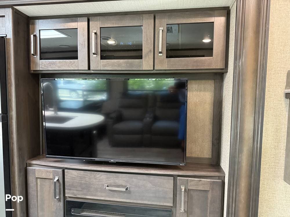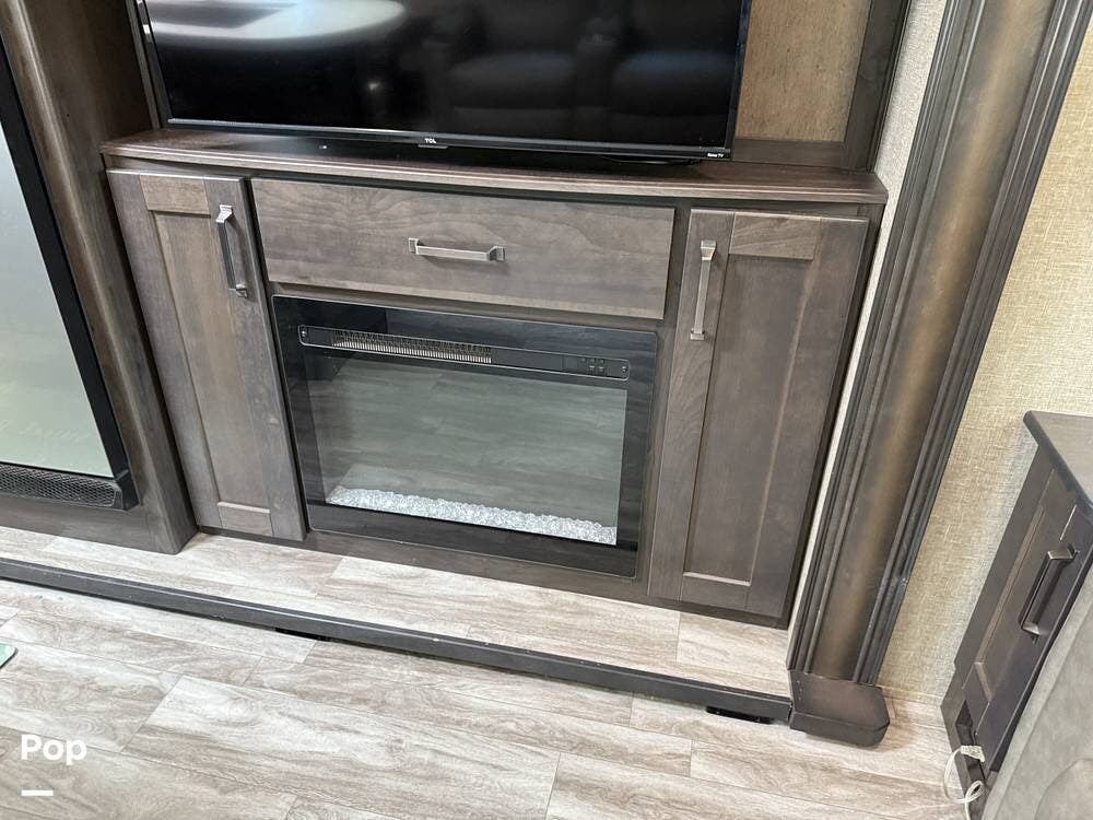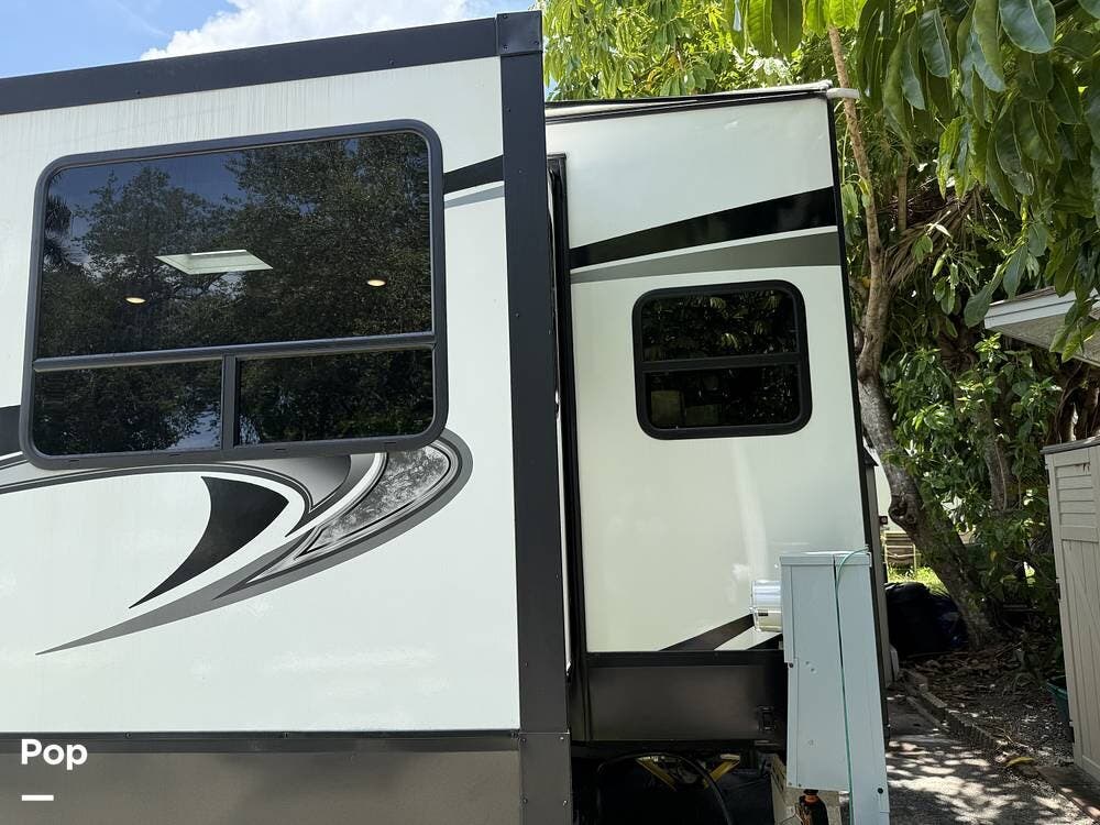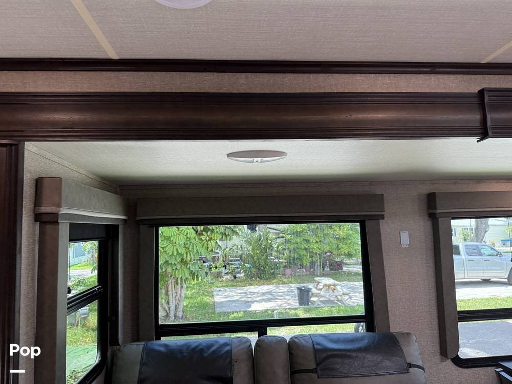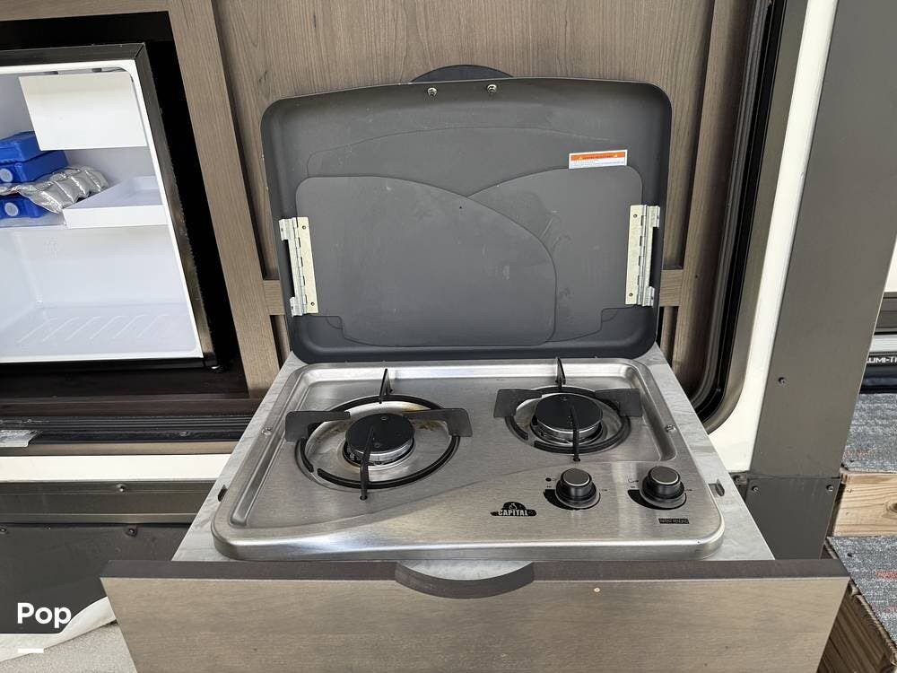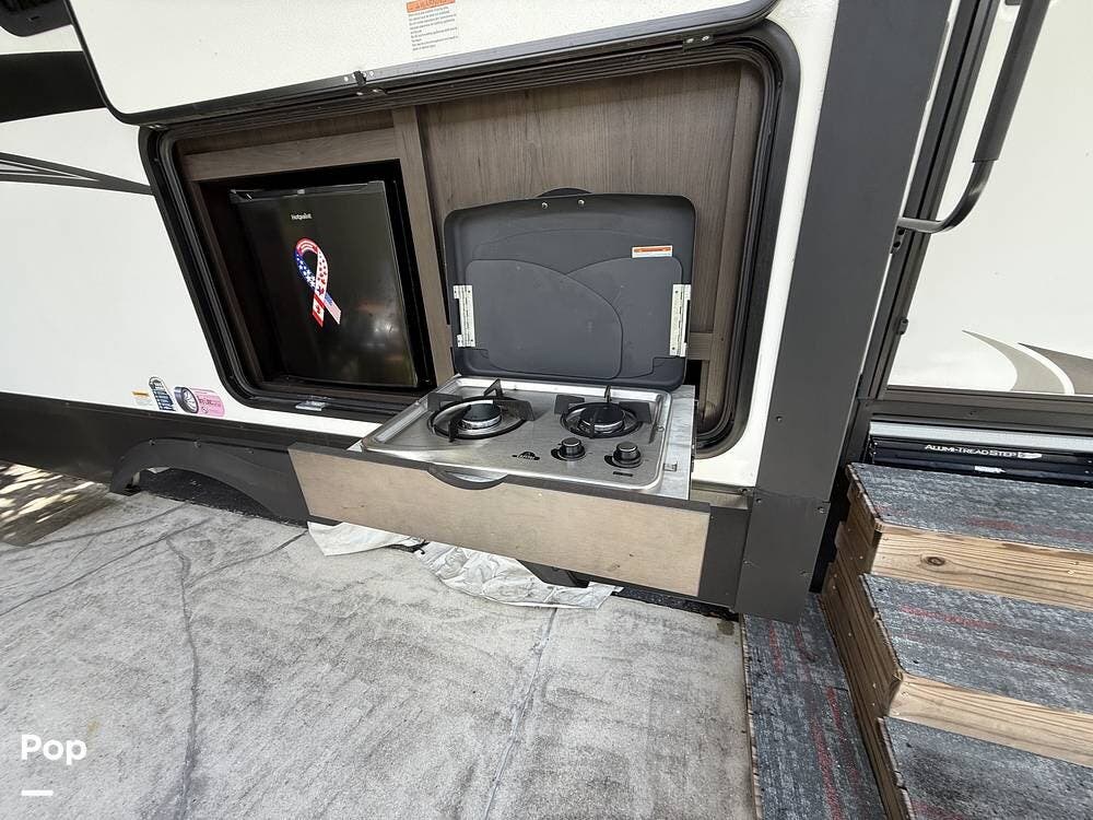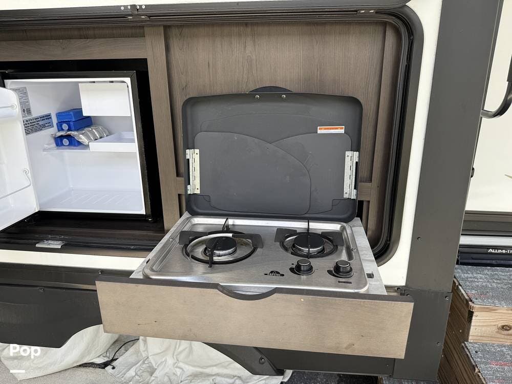 Outside, this model really stands out. A 21' power awning with LED lighting, outdoor speakers, TV hookup, and a complete exterior kitchen with mini fridge and cooktop make outdoor living a breeze.
