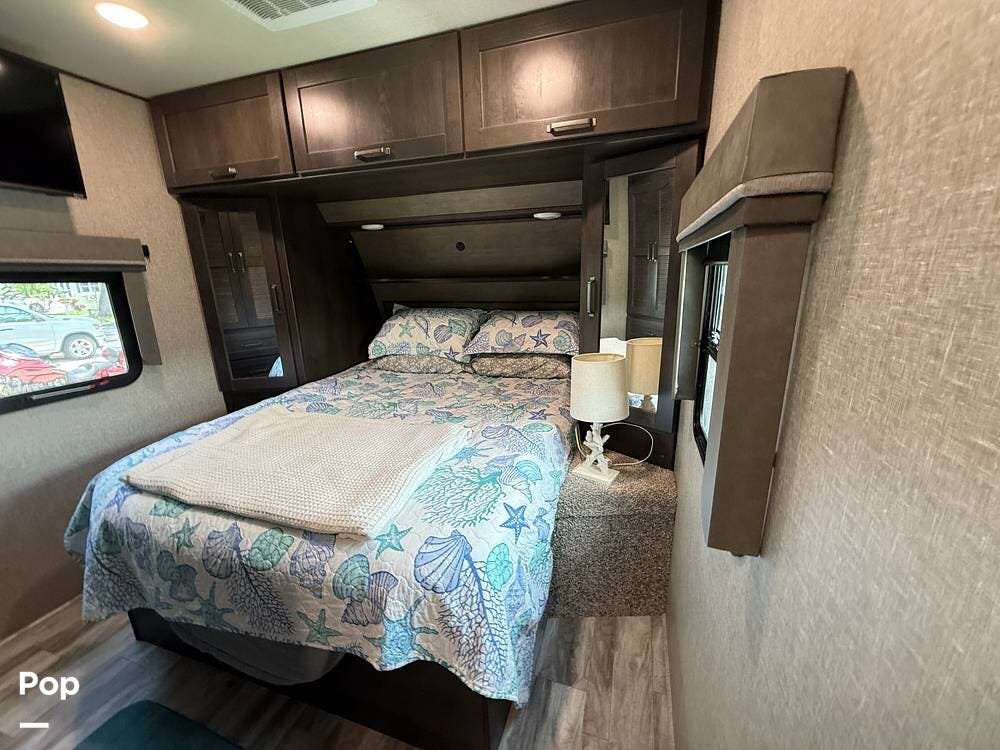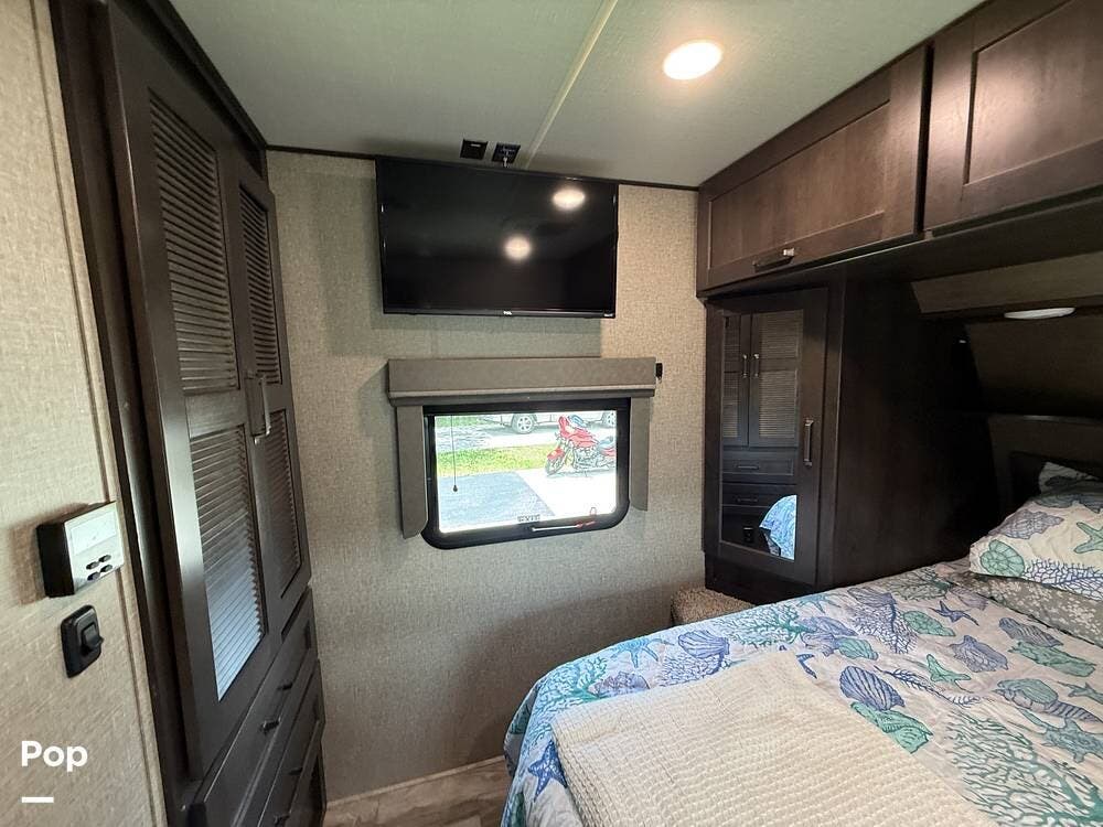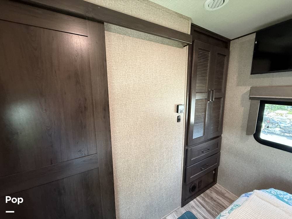 In the front of the trailer, the master suite offers a serene escape. A queen bed with under-bed storage is surrounded by mirrored wardrobes, nightstands, and overhead cabinets. An additional closet comes prepped for washer/dryer installation, offering the potential for extended or even full-time stays. It's a restful space, finished with soft lighting and quality materials for a truly residential feel.