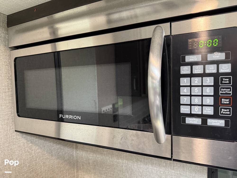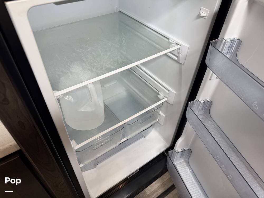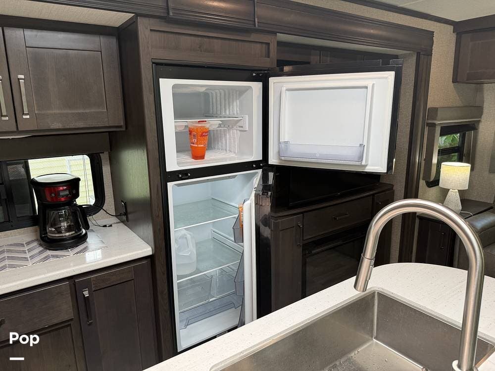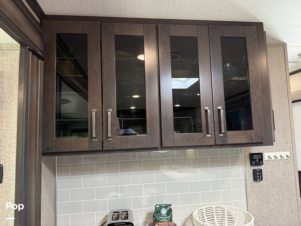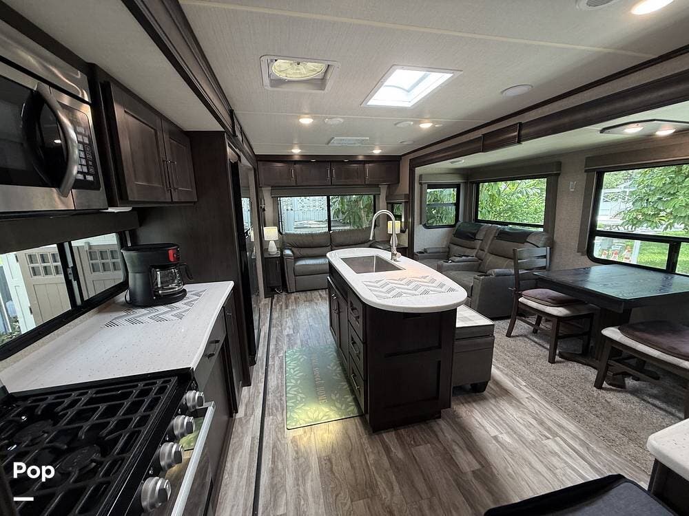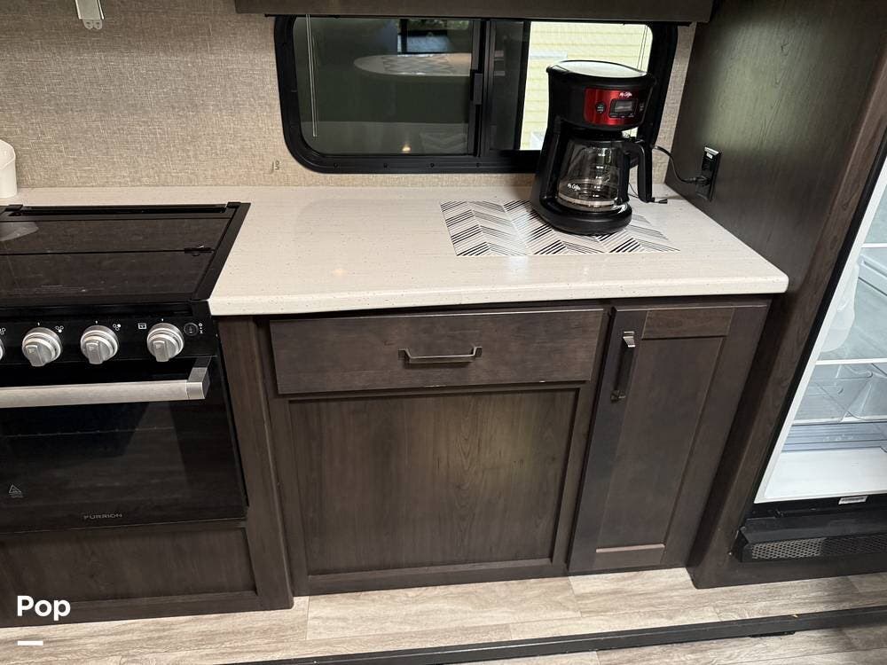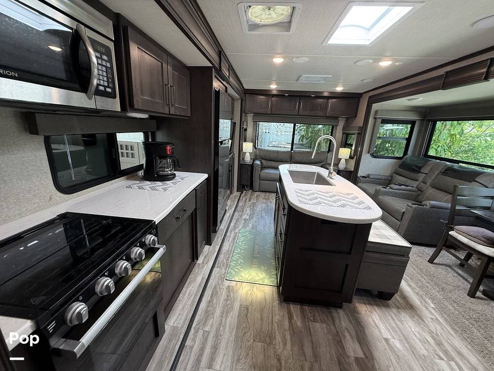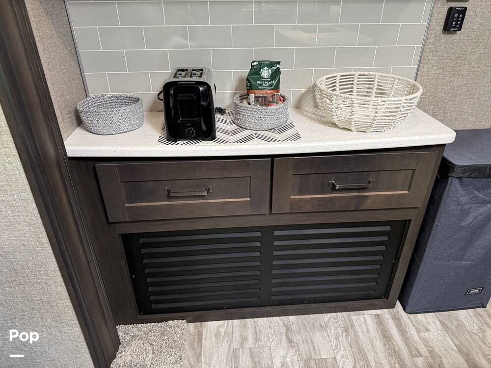 The kitchen is a chef's dream, with a central island that adds prep space and elegance. You'll find solid-surface countertops, a stainless farmhouse sink with pull-down sprayer, and a three-burner cooktop with oven and glass cover. A microwave and oversized refrigerator ensures you're fully equipped whether you're preparing a gourmet dinner or a quick snack. Ample pantry storage, large drawers, and overhead cabinets make it easy to stay organized on the road.
