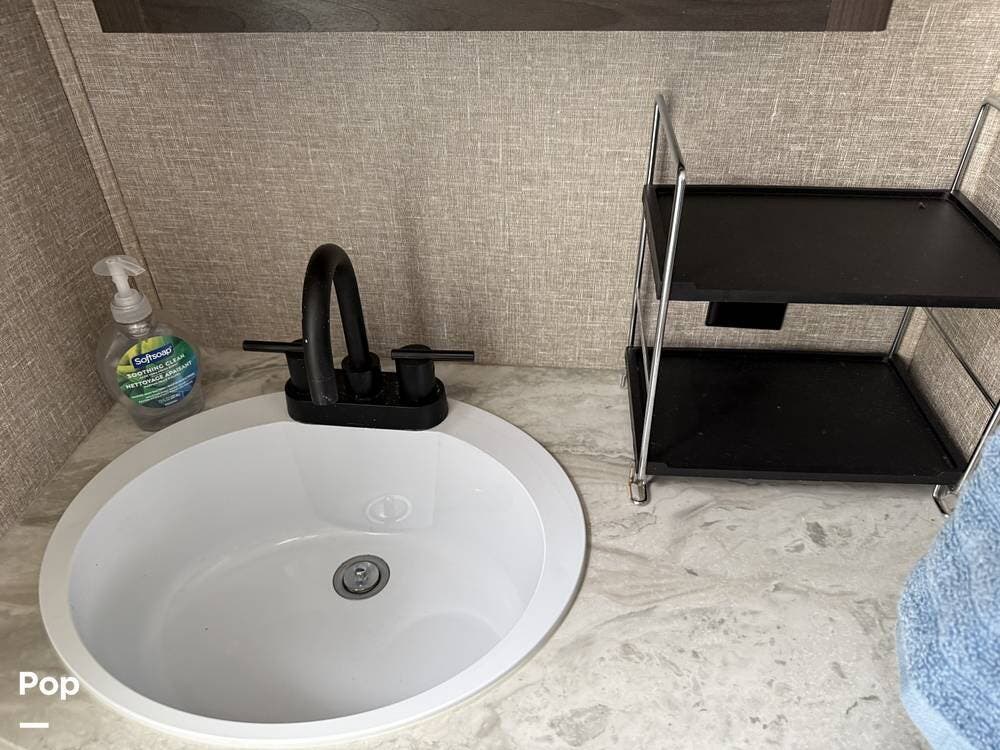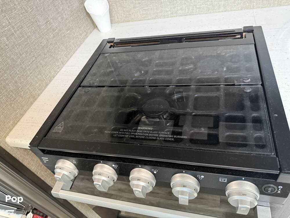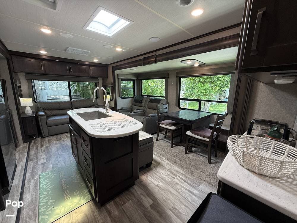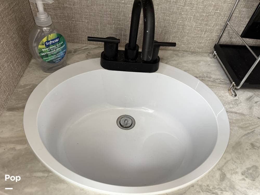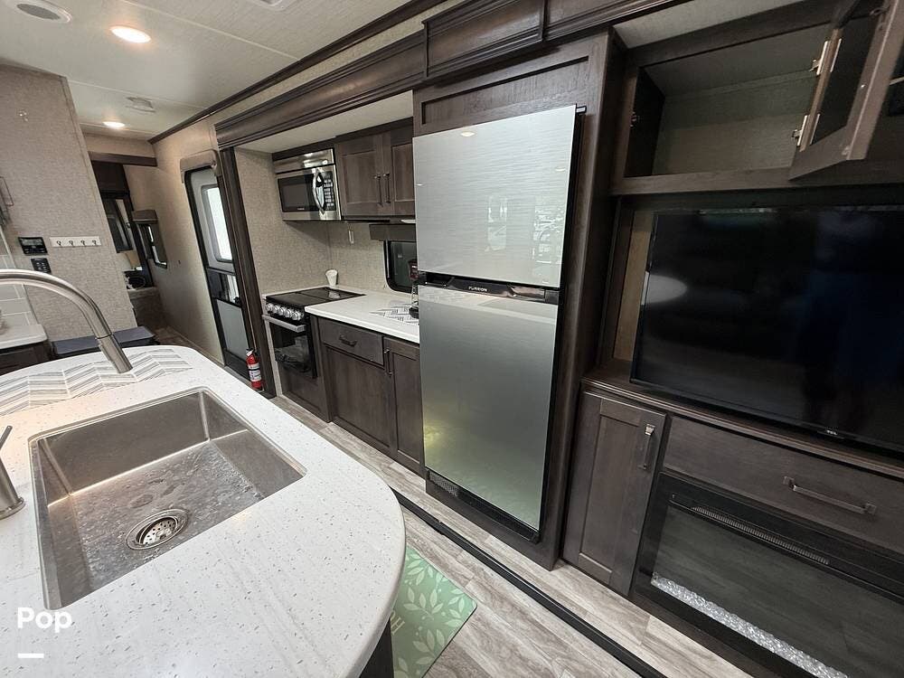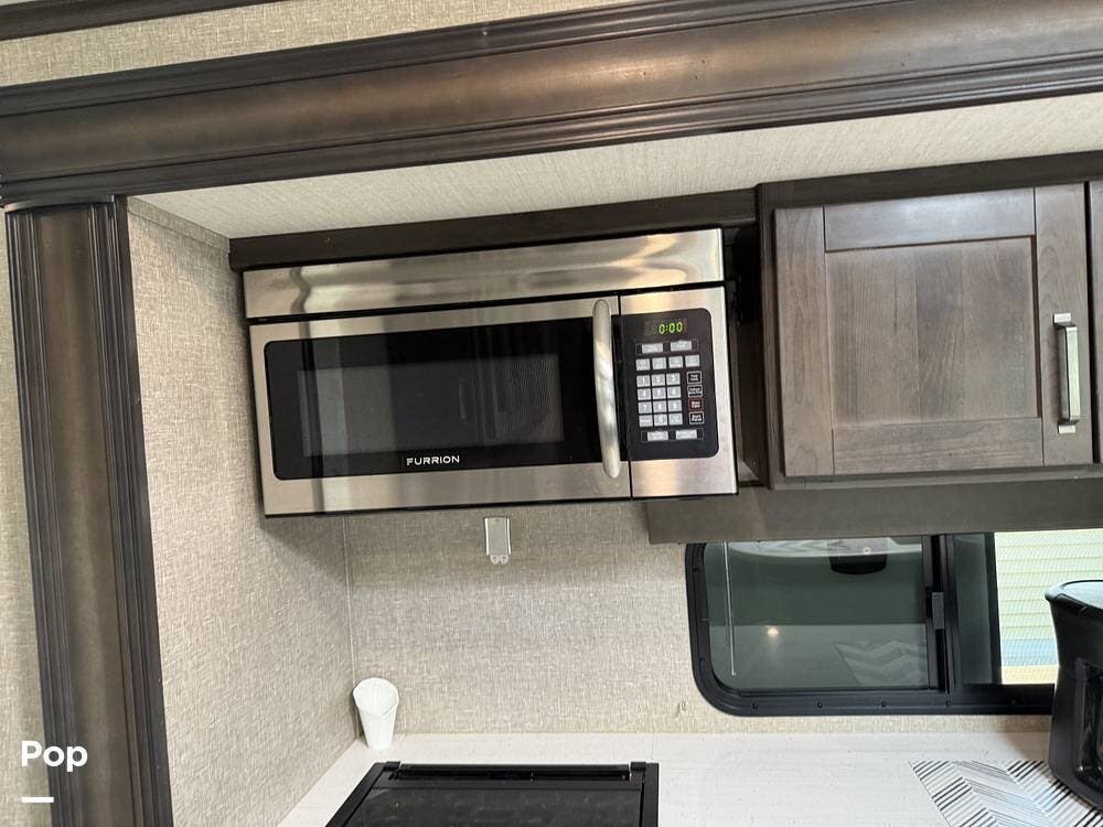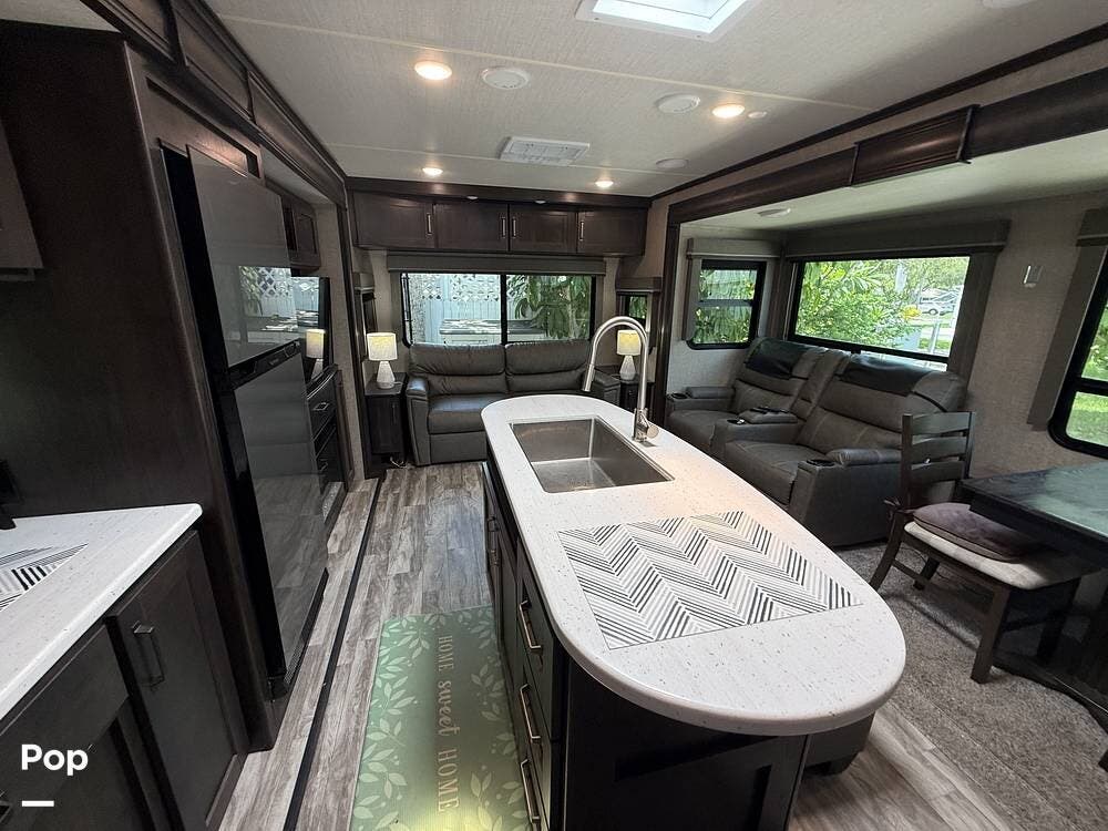 The kitchen is a chef's dream, with a central island that adds prep space and elegance. You'll find solid-surface countertops, a stainless farmhouse sink with pull-down sprayer, and a three-burner cooktop with oven and glass cover. A microwave and oversized refrigerator ensures you're fully equipped whether you're preparing a gourmet dinner or a quick snack. Ample pantry storage, large drawers, and overhead cabinets make it easy to stay organized on the road.