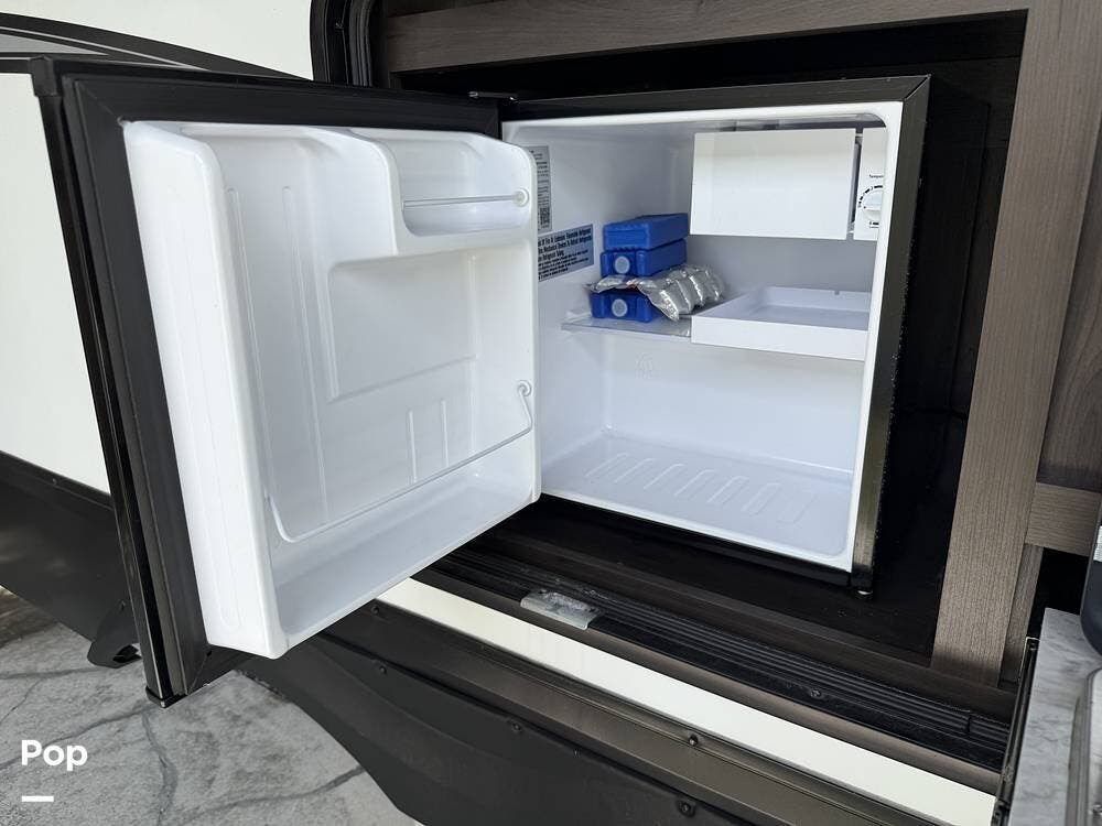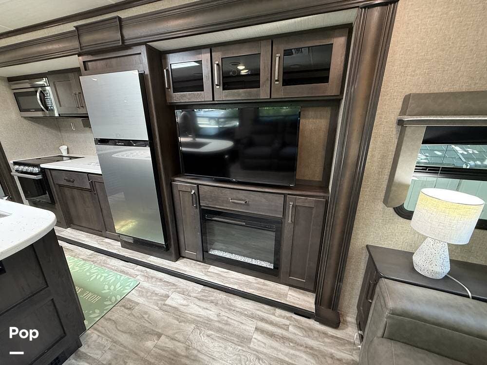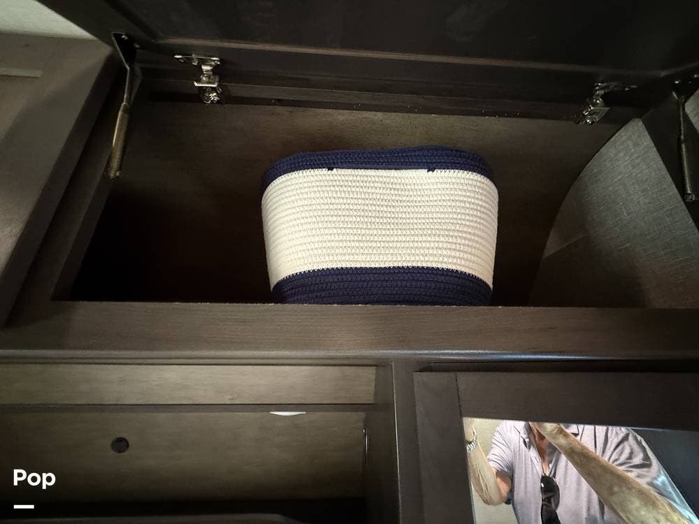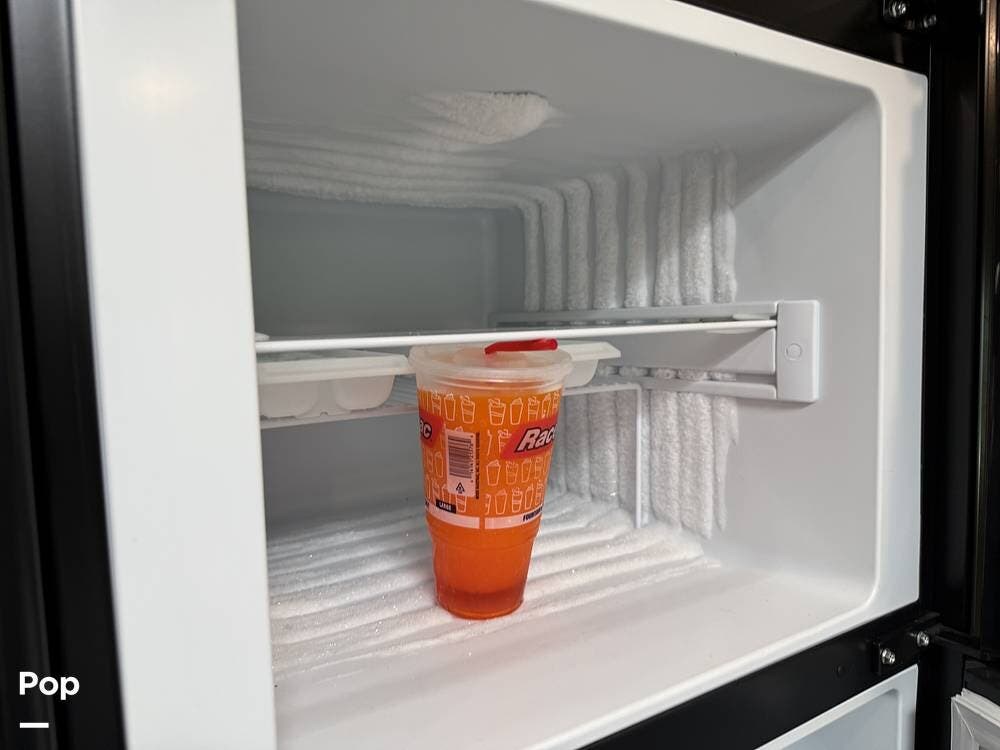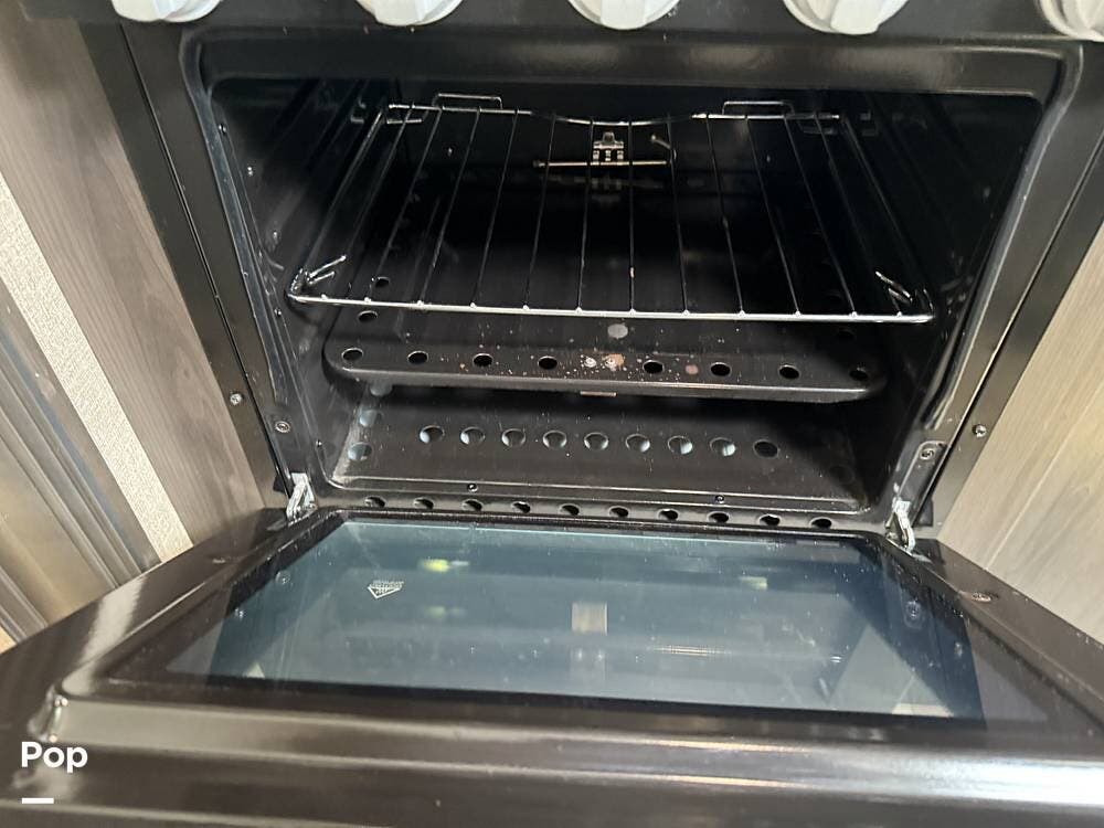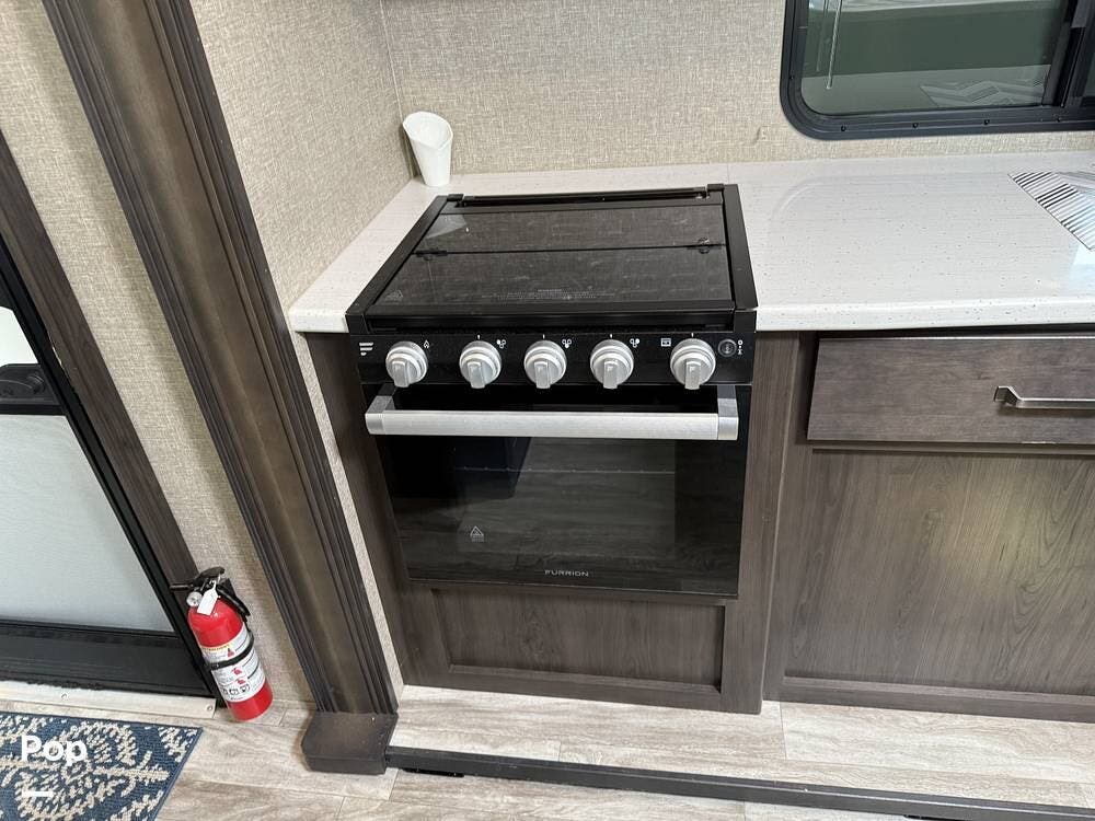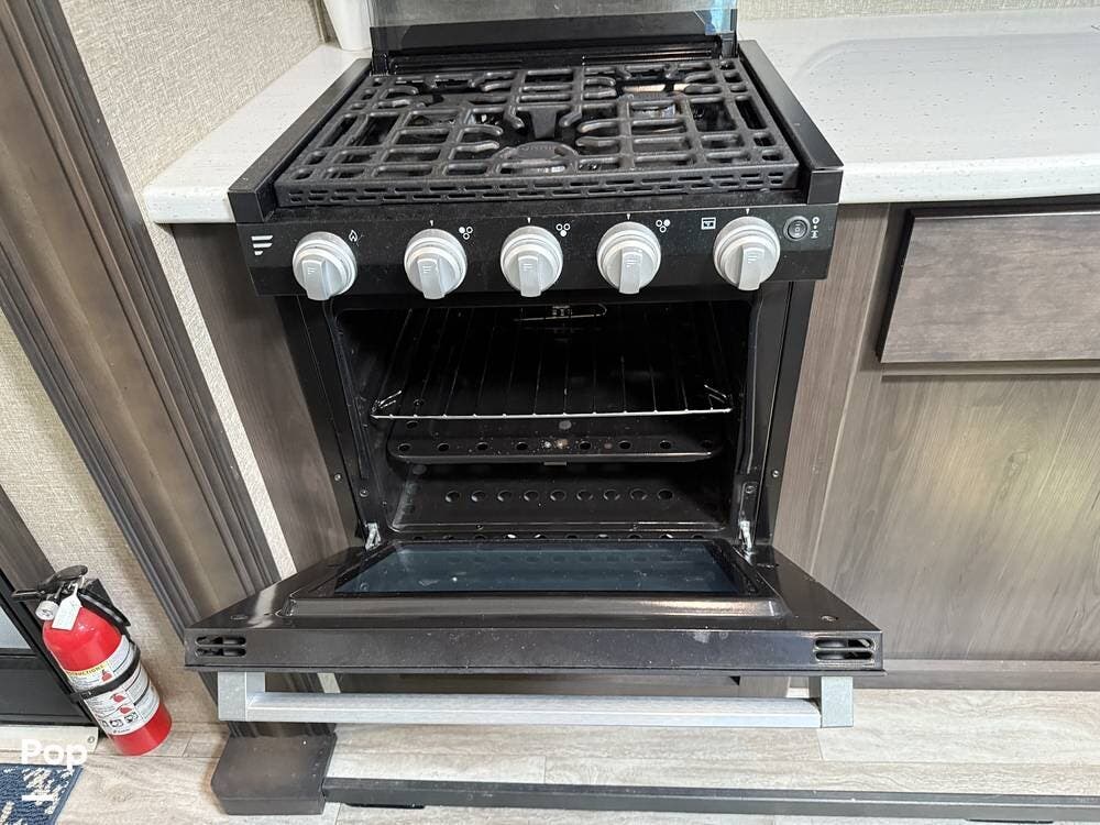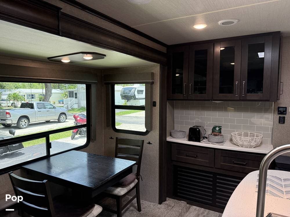 The kitchen is a chef's dream, with a central island that adds prep space and elegance. You'll find solid-surface countertops, a stainless farmhouse sink with pull-down sprayer, and a three-burner cooktop with oven and glass cover. A microwave and oversized refrigerator ensures you're fully equipped whether you're preparing a gourmet dinner or a quick snack. Ample pantry storage, large drawers, and overhead cabinets make it easy to stay organized on the road.