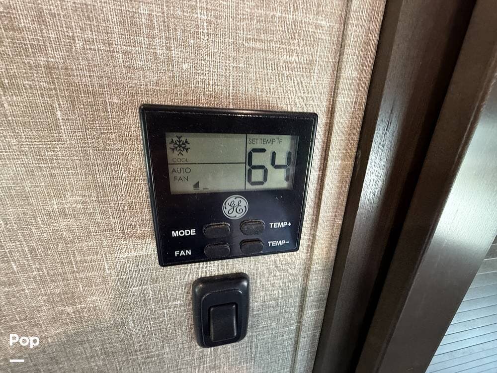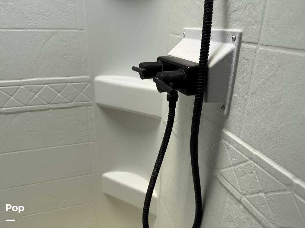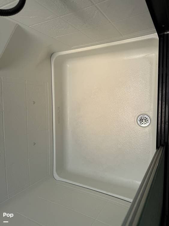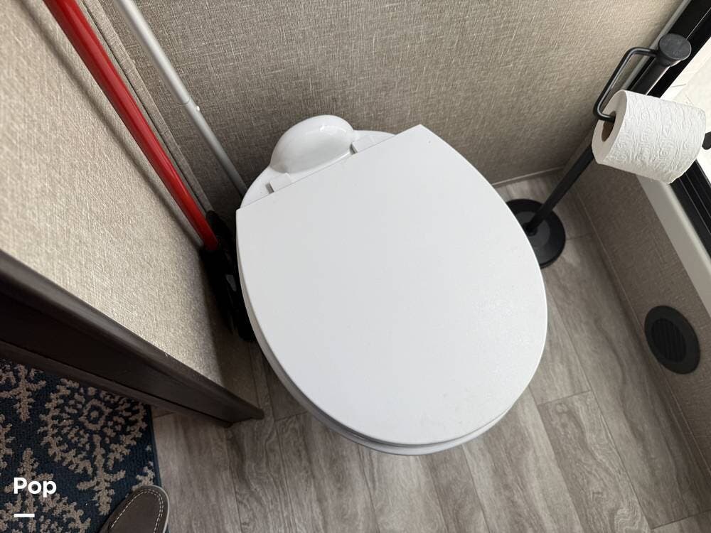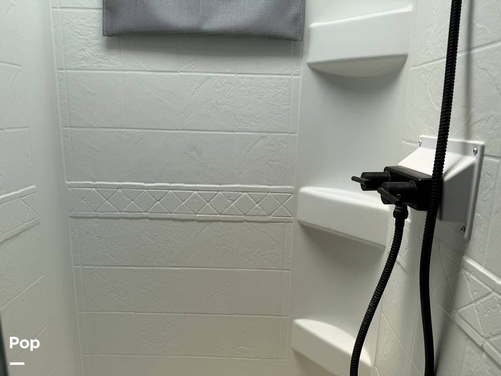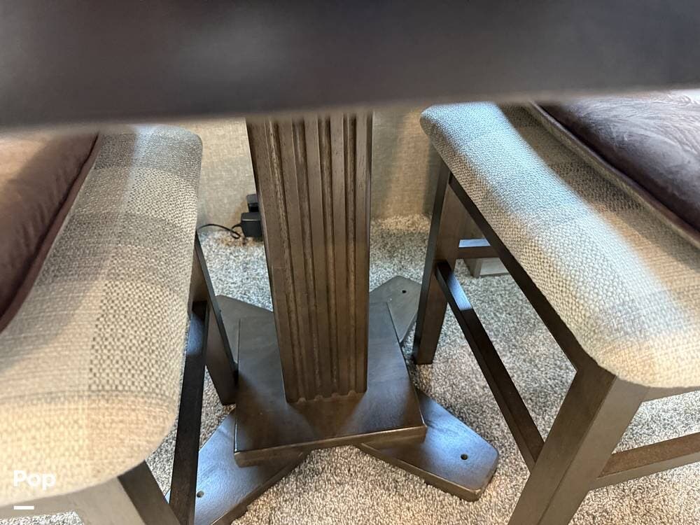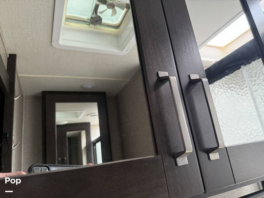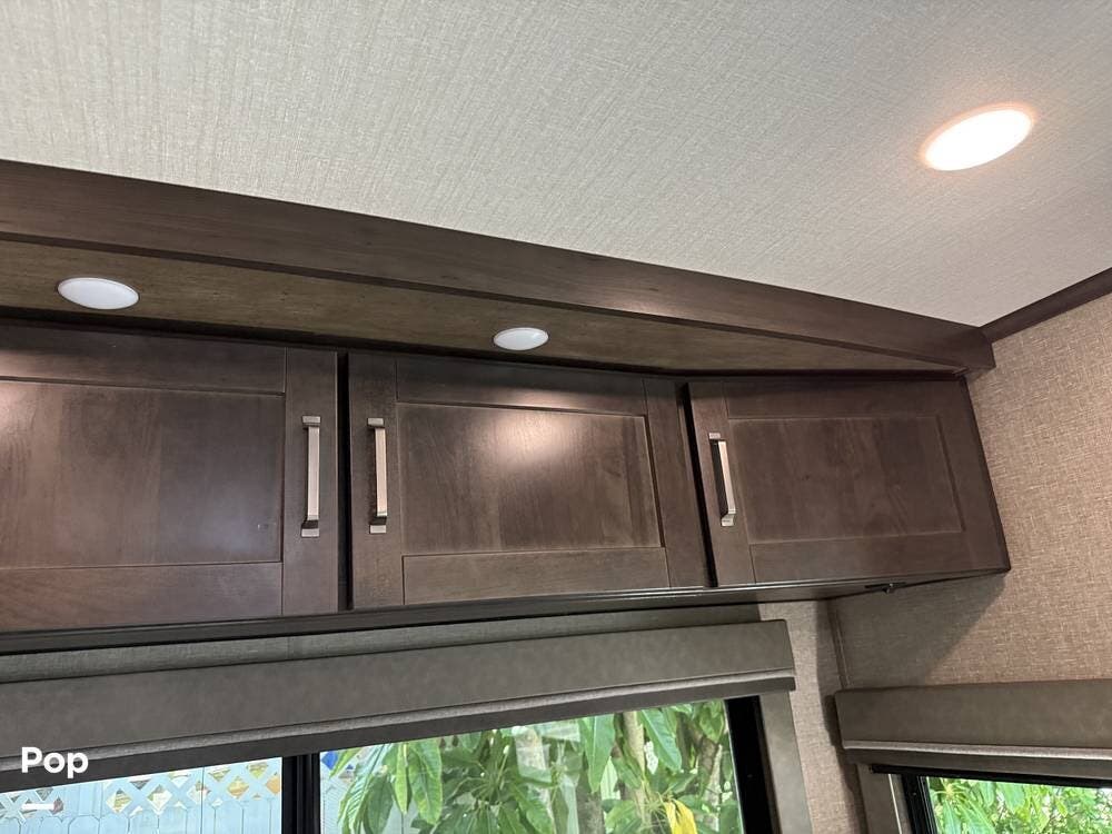 The kitchen is a chef's dream, with a central island that adds prep space and elegance. You'll find solid-surface countertops, a stainless farmhouse sink with pull-down sprayer, and a three-burner cooktop with oven and glass cover. A microwave and oversized refrigerator ensures you're fully equipped whether you're preparing a gourmet dinner or a quick snack. Ample pantry storage, large drawers, and overhead cabinets make it easy to stay organized on the road.