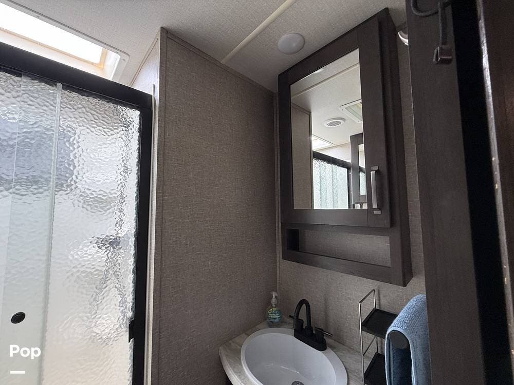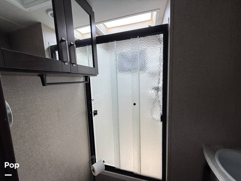 The spacious bathroom features a large shower with glass doors and a skylight, a porcelain foot-flush toilet, generous vanity space, and a mirrored medicine cabinet. Like the rest of the coach, it's designed to deliver both form and function with high-quality finishes and clever storage.