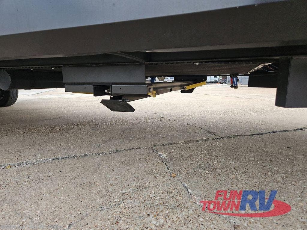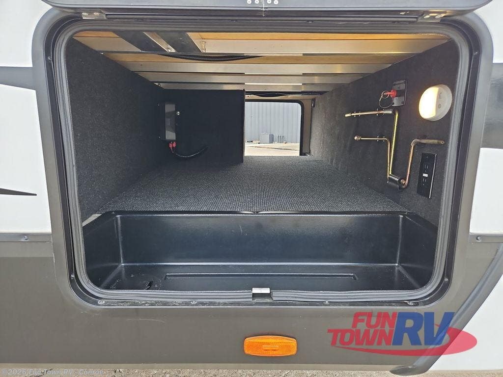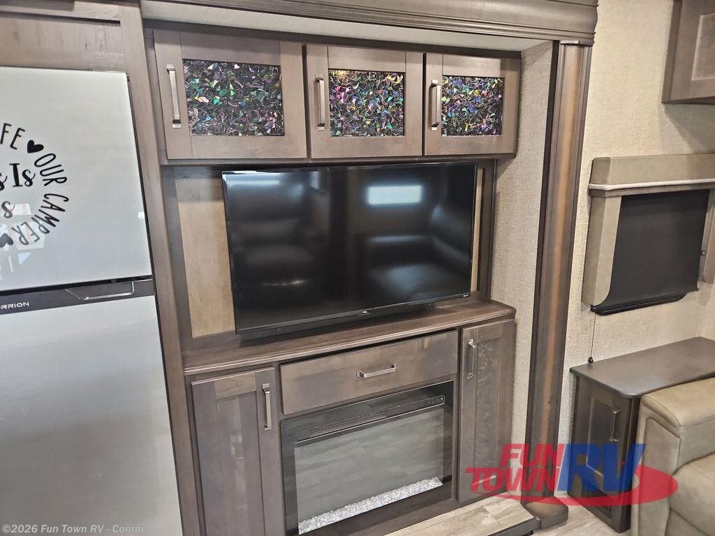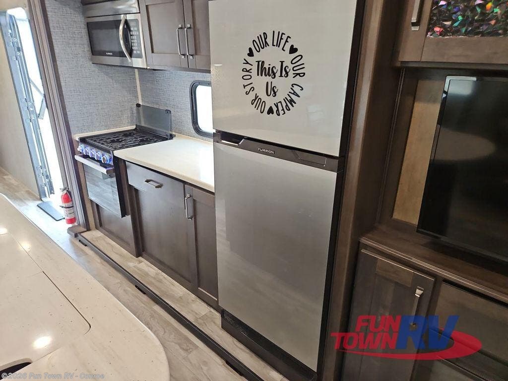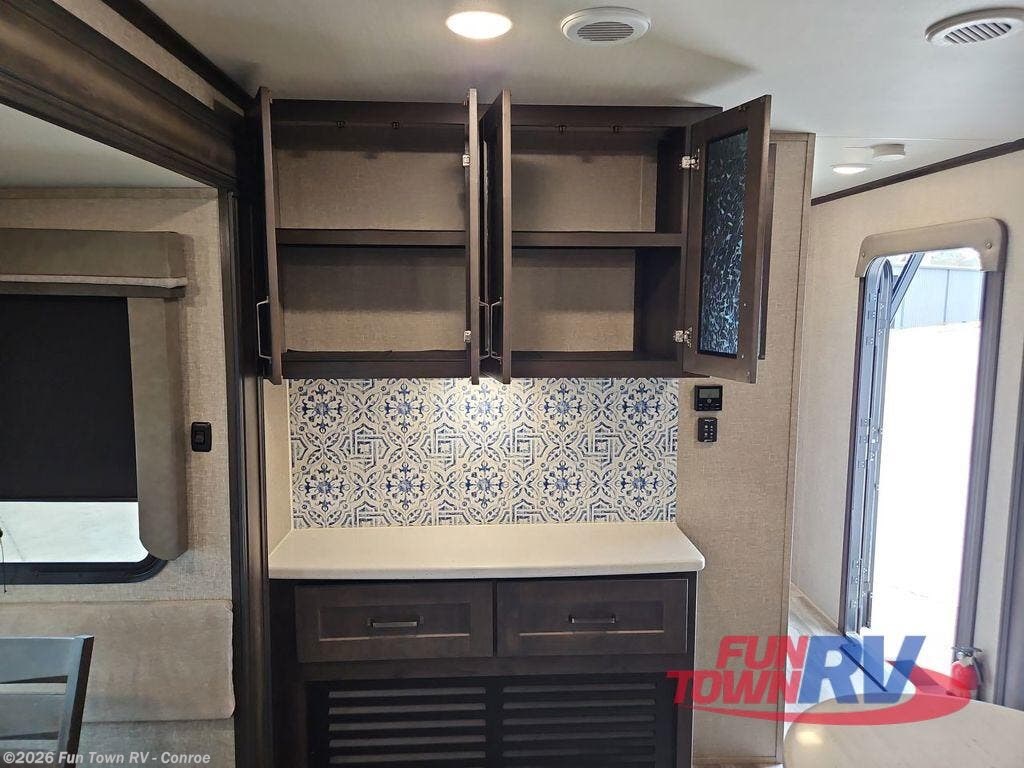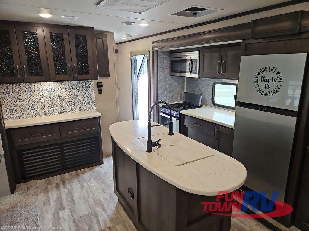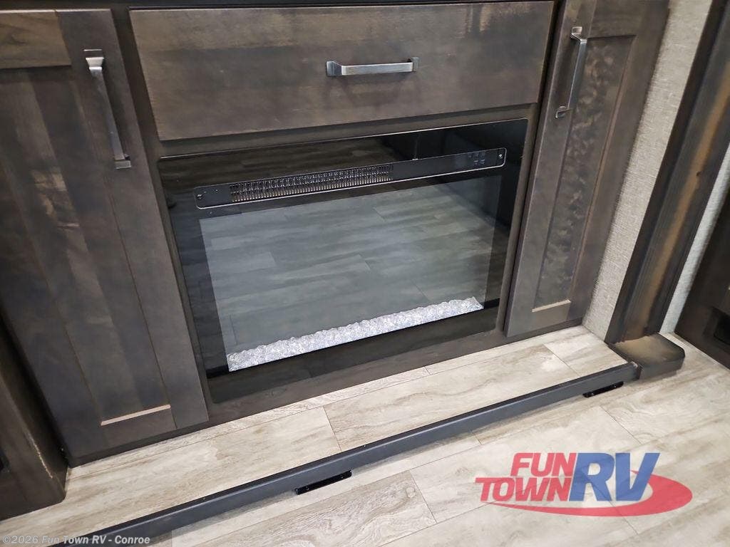 Whether you travel to explore or relax, this trailer will give you the choice depending where you park it! The outside kitchen provides another place to make meals when you want to be in the outdoors, and the inside kitchen amenities offer a gourmet kitchen including a 10 cu. ft. refrigerator, an island, and a hutch. You and your guests will find theatre seating with cupholders, a booth dinette or choose a free standing dinette option, and a tri-fold sofa to sit on and visit while you watch the 40" LED HDTV with fireplace below. The full bathroom includes a space saving sliding door and linen storage, and the bedroom gives you a front walk-around queen bed with storage for your clothes on each side, plus there is an additional wardrobe with drawers and the option to add a washer/dryer to the prepped space.