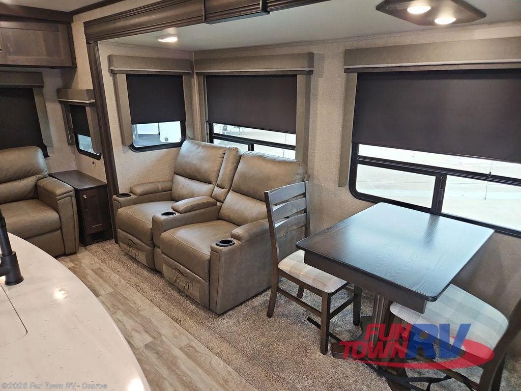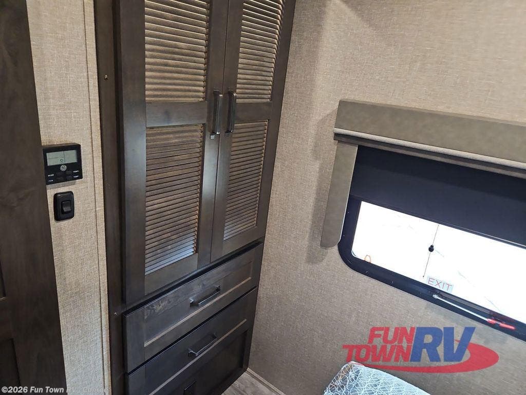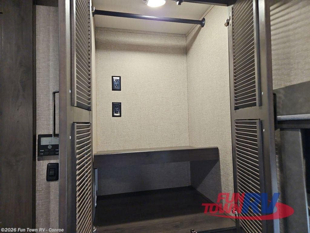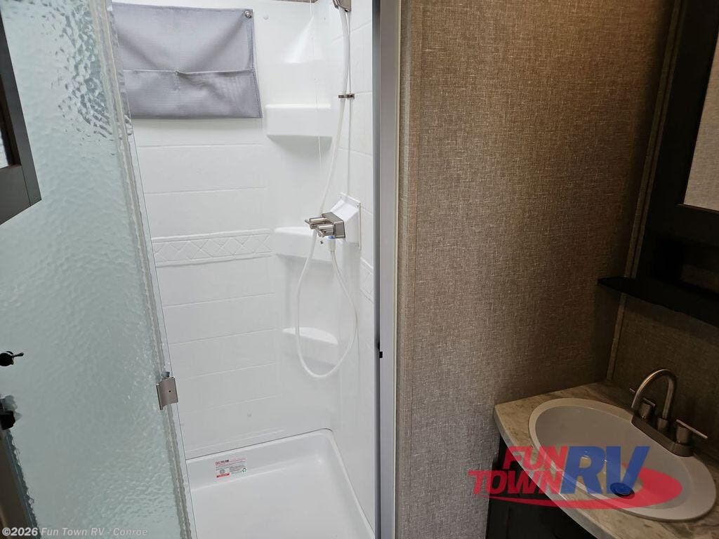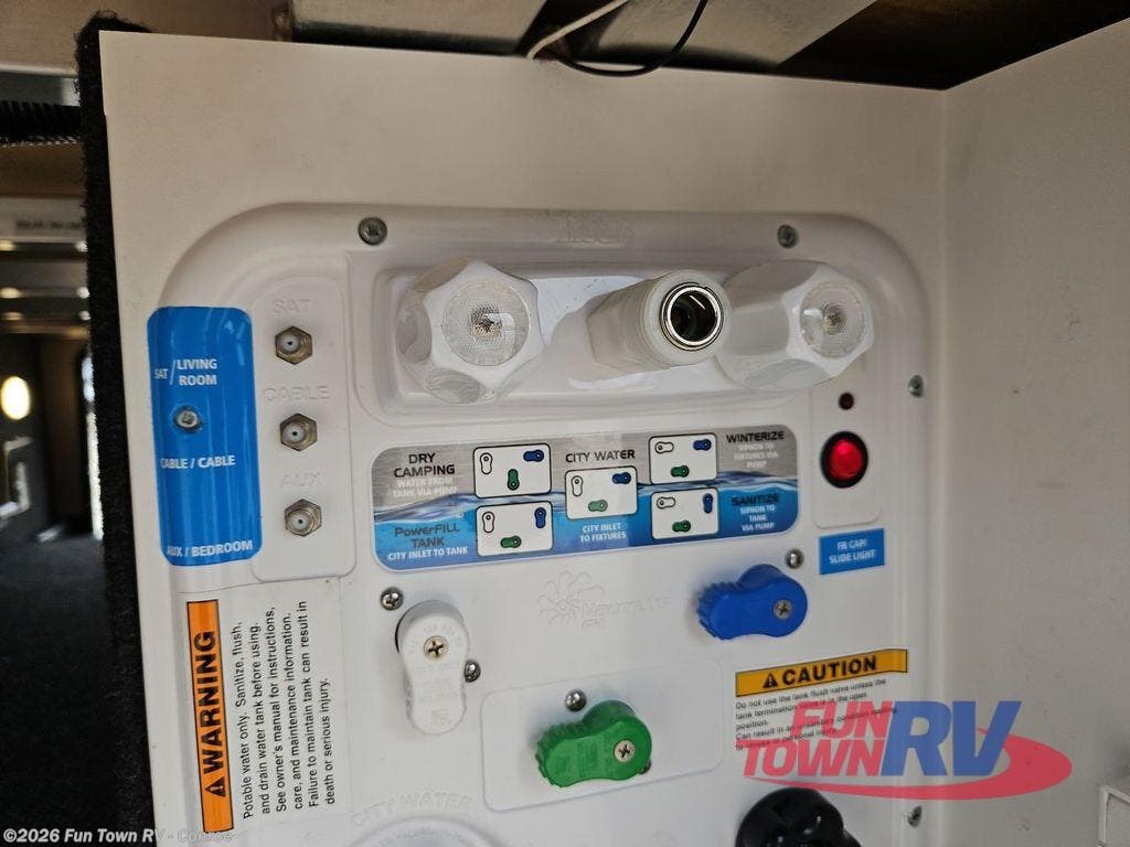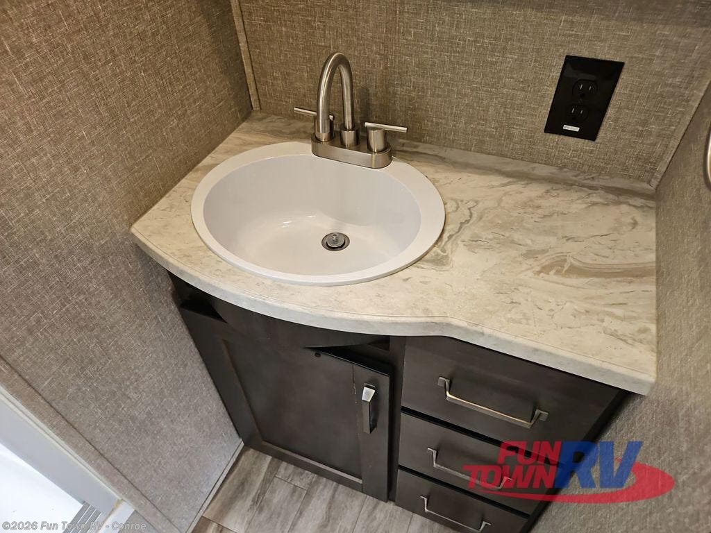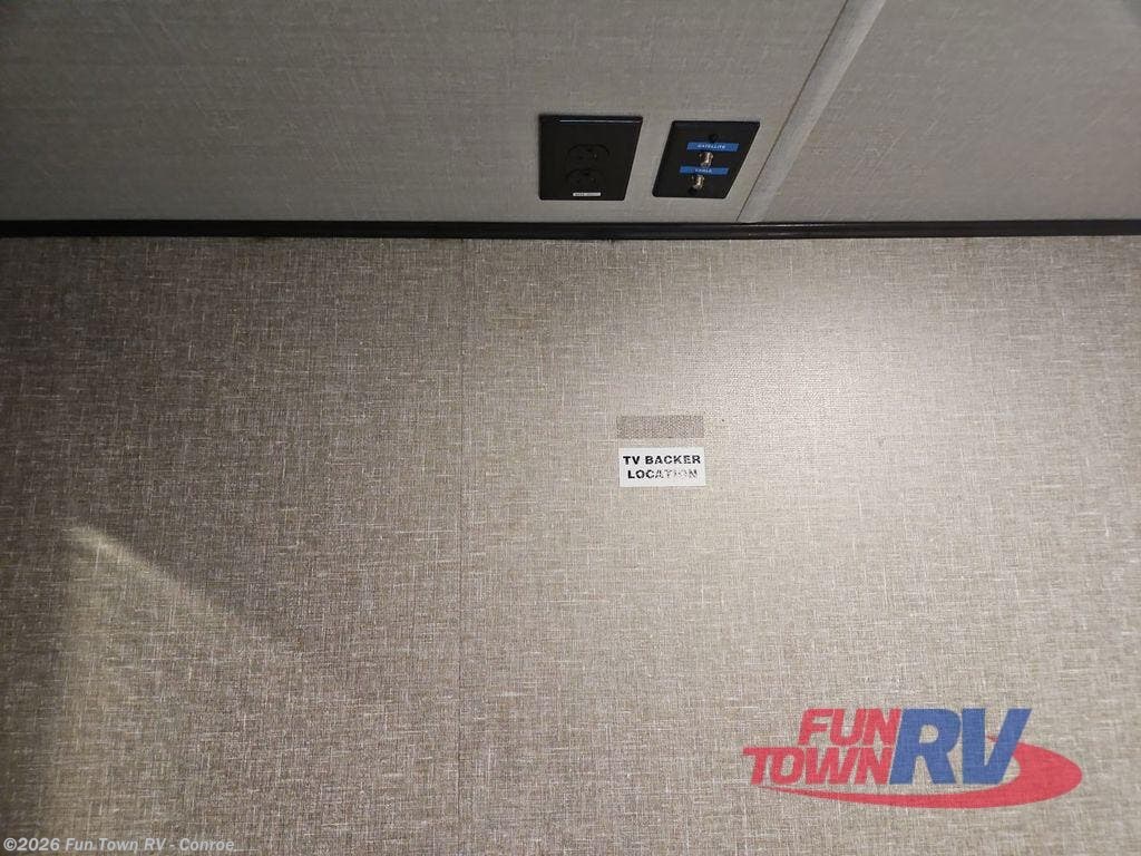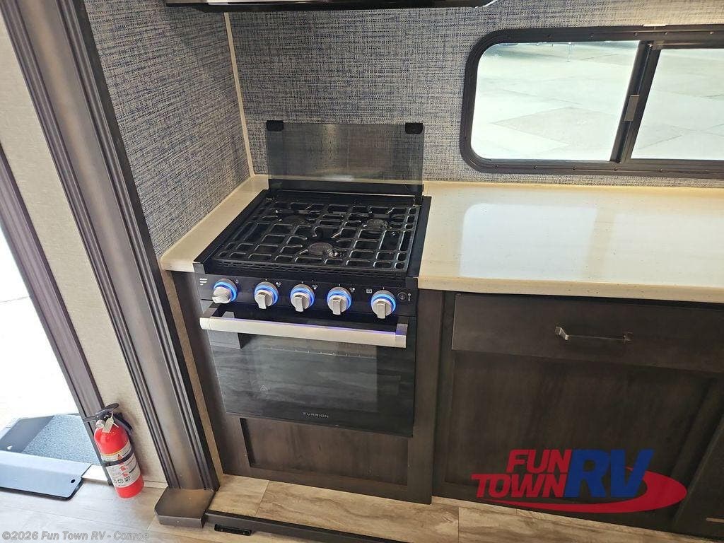 Whether you travel to explore or relax, this trailer will give you the choice depending where you park it! The outside kitchen provides another place to make meals when you want to be in the outdoors, and the inside kitchen amenities offer a gourmet kitchen including a 10 cu. ft. refrigerator, an island, and a hutch. You and your guests will find theatre seating with cupholders, a booth dinette or choose a free standing dinette option, and a tri-fold sofa to sit on and visit while you watch the 40" LED HDTV with fireplace below. The full bathroom includes a space saving sliding door and linen storage, and the bedroom gives you a front walk-around queen bed with storage for your clothes on each side, plus there is an additional wardrobe with drawers and the option to add a washer/dryer to the prepped space.