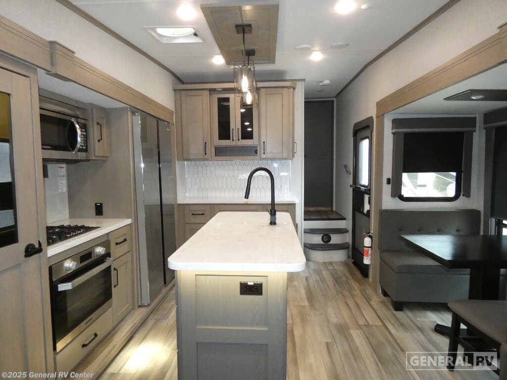 Step into the luxurious world of the 2023 Grand Design Reflection 303RLS, where comfort meets elegance in a beautifully crafted fifth wheel. This exquisite RV is designed for those who appreciate the finer things in life, offering a spacious living area that invites relaxation with its theater seating and tri-fold sofa, perfect for cozy evenings by the 40" TV and fireplace. The center kitchen is a culinary delight, featuring a full-size refrigerator and a three-burner cooktop, ensuring you have all the amenities needed to whip up your favorite meals while on the road. The Reflection 303RLS boasts a thoughtfully designed floorplan with three slides, providing ample space for up to six sleepers. The front bedroom features a plush queen bed, surrounded by overhead cabinets for extra storage. Enjoy the convenience of a center bath with a radius shower, complete with a skylight that brings in natural light. With two powered retractable awnings, you can extend your living space outdoors, creating the perfect setting for entertaining or simply soaking in the beauty of nature. Visit your nearest General RV dealership to explore this stunning model and start your adventure today!