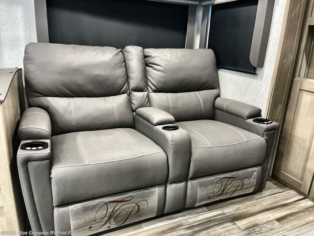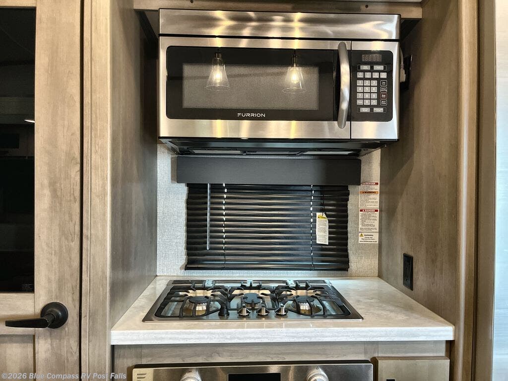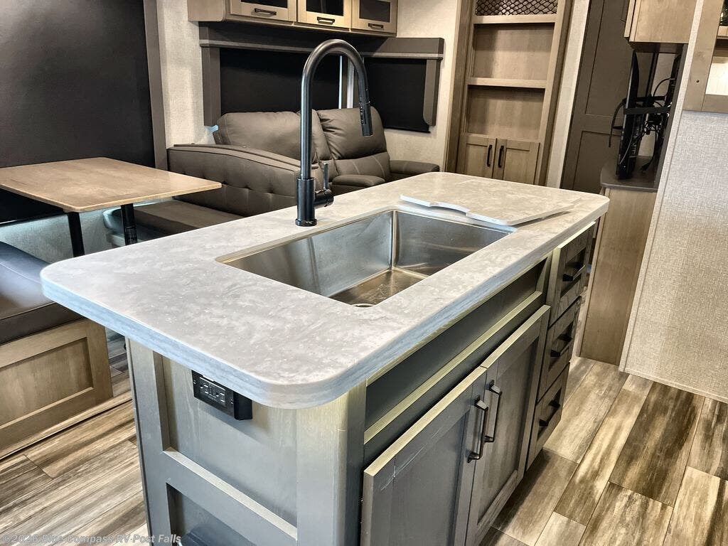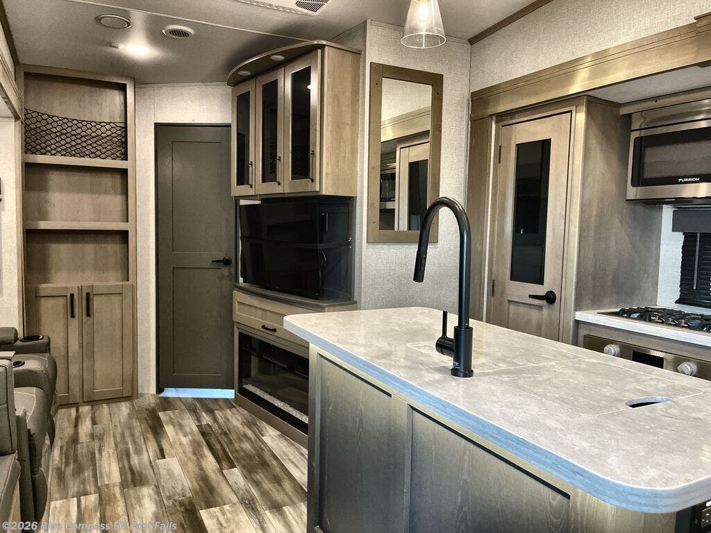 Are you looking to travel with your family and friends and want enough space for everyone to be comfortable? Step inside using the AXIStep, to find a private bunkhouse in the rear of this fifth wheel which offers a slide out flip bunk above a tri-fold sofa, a bunk bed and storage on the opposite side, its very own private half bathroom. The theater seating or tri-fold sofa option is a great place to unwind at night in front of the entertainment center with a 40" LED HDTV and fireplace below it. There is a booth dinette or you can choose a free standing dinette option to dine at, and the kitchen island will provide more counter space to prep meals. You will find full amenities including a 16 cu. ft. 12V refrigerator and a hutch. This fifth wheel also includes a double entry bathroom with a radius shower with a skylight, and you can wake up refreshed each morning after sleeping on your own queen bed.