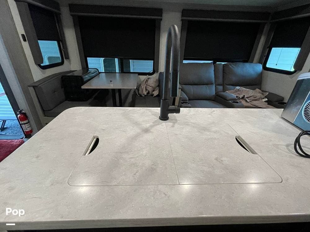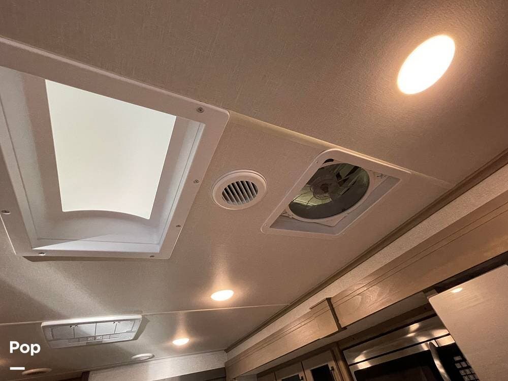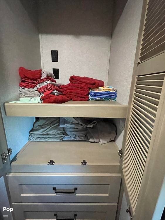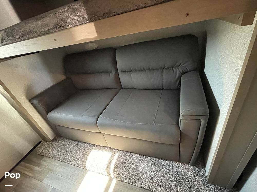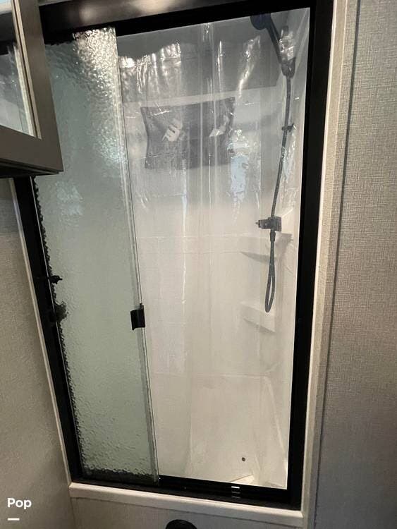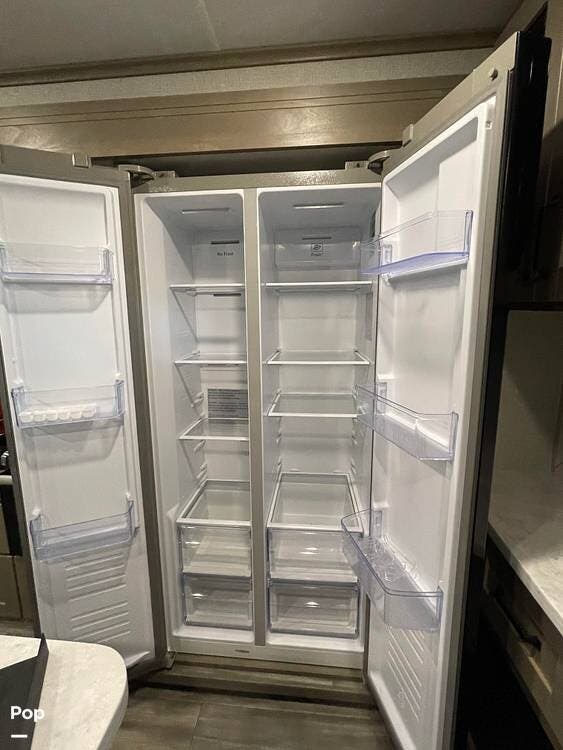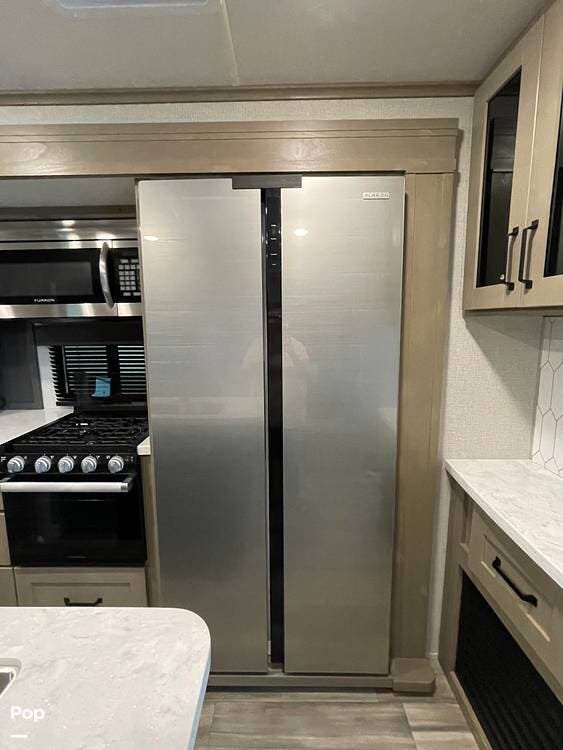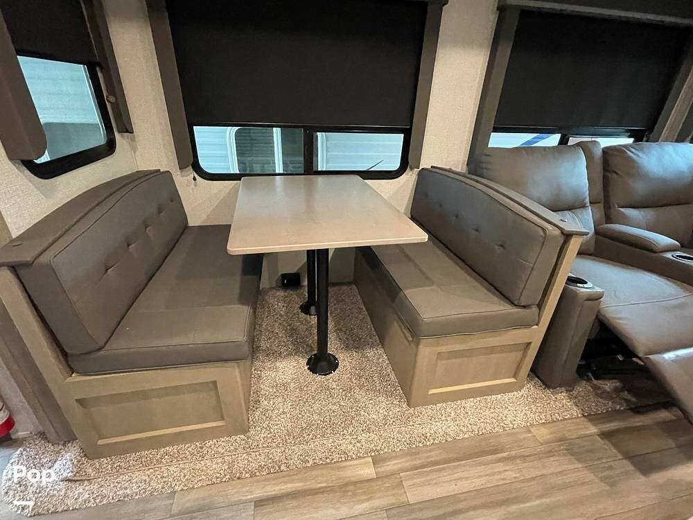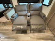 The interior layout is designed to maximize space and comfort. Upon entering, you're greeted by a spacious living area with theatre seating and a dinette booth that can convert to a bed, an Entertainment center with a fireplace, and a 40-inch TV.