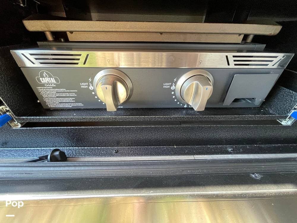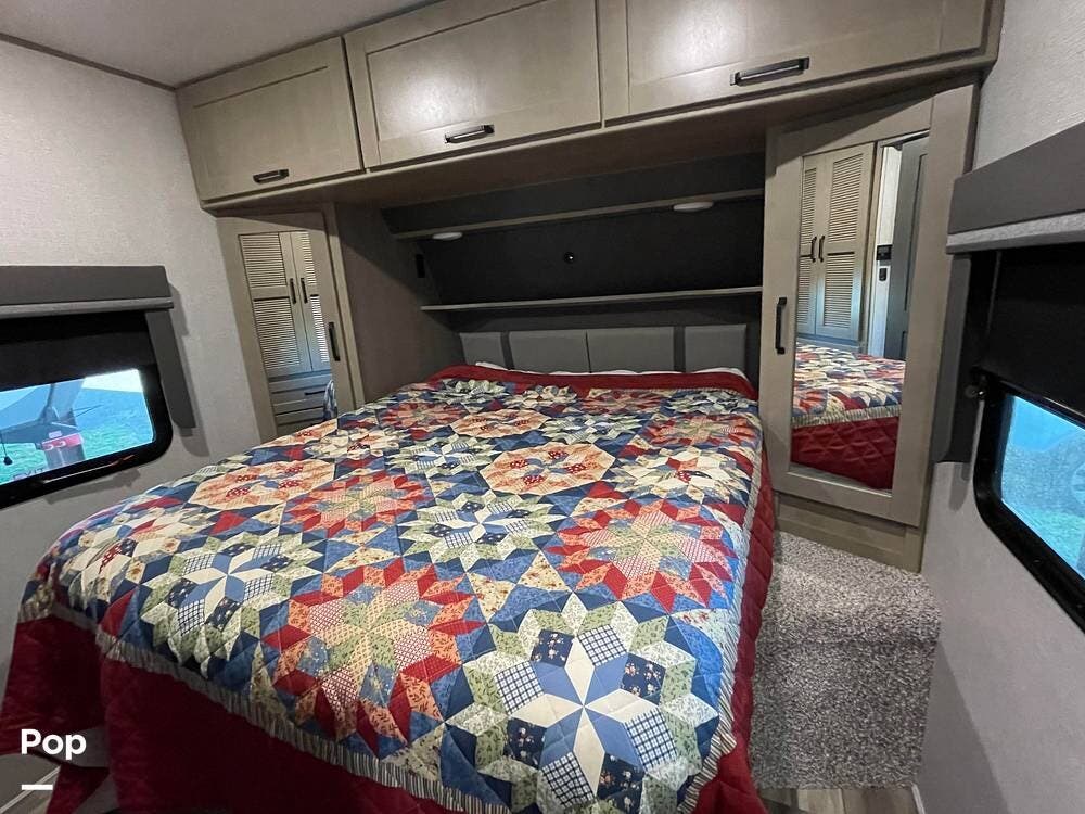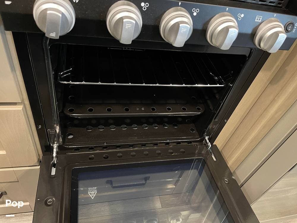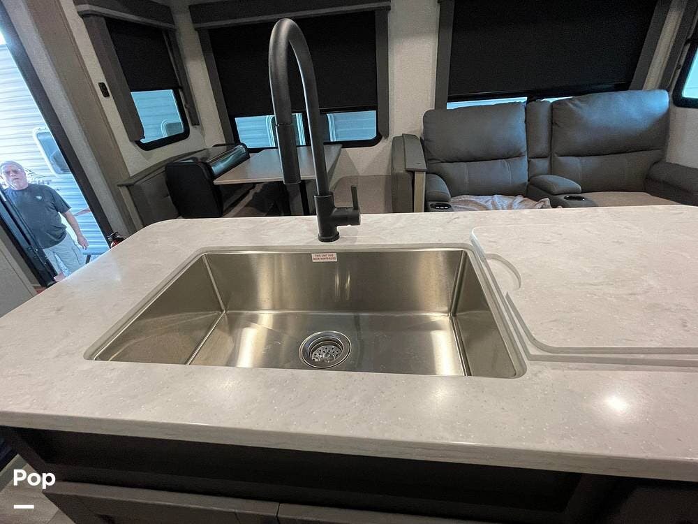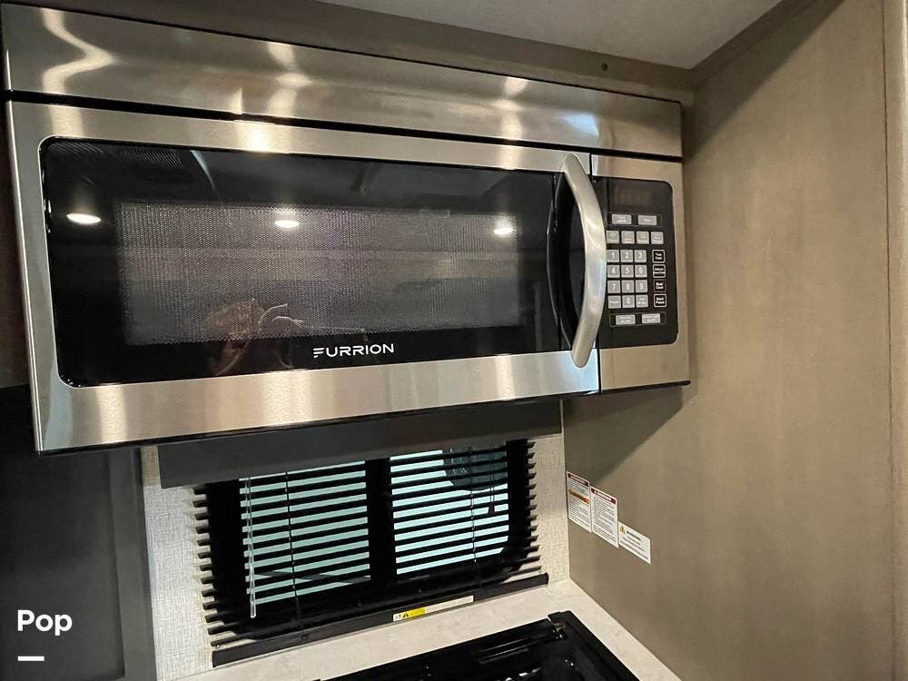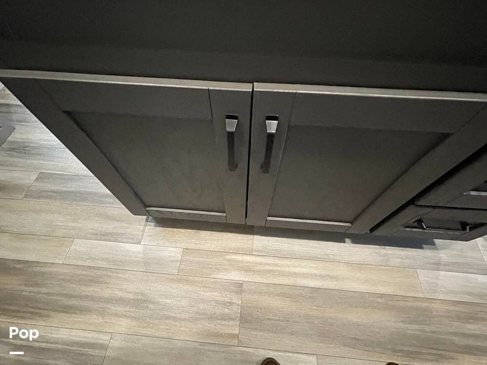 The interior layout is designed to maximize space and comfort. Upon entering, you're greeted by a spacious living area with theatre seating and a dinette booth that can convert to a bed, an Entertainment center with a fireplace, and a 40-inch TV.