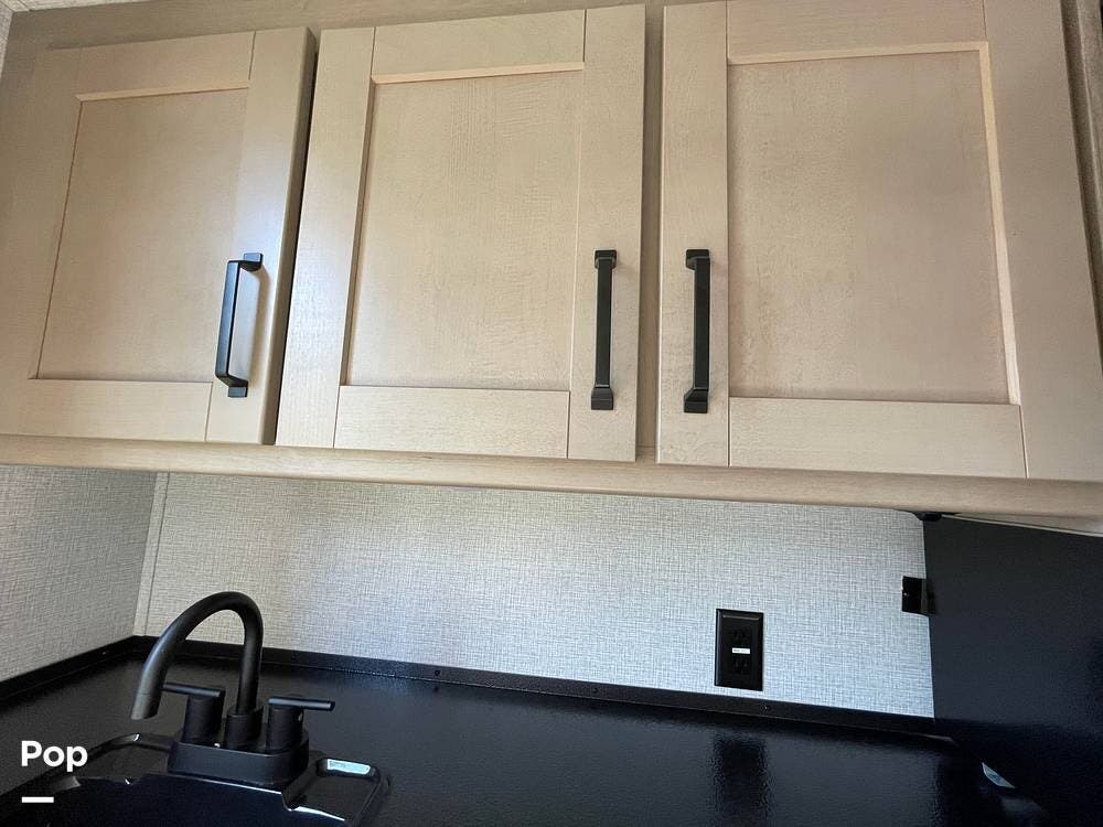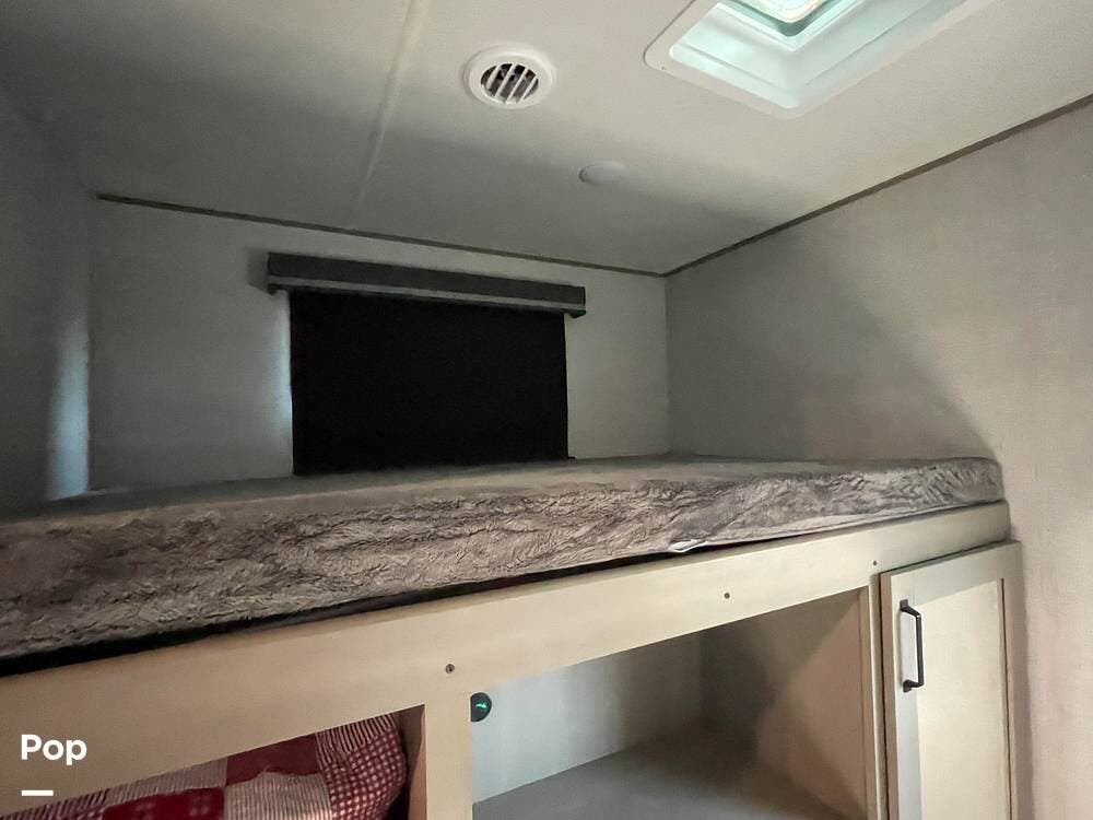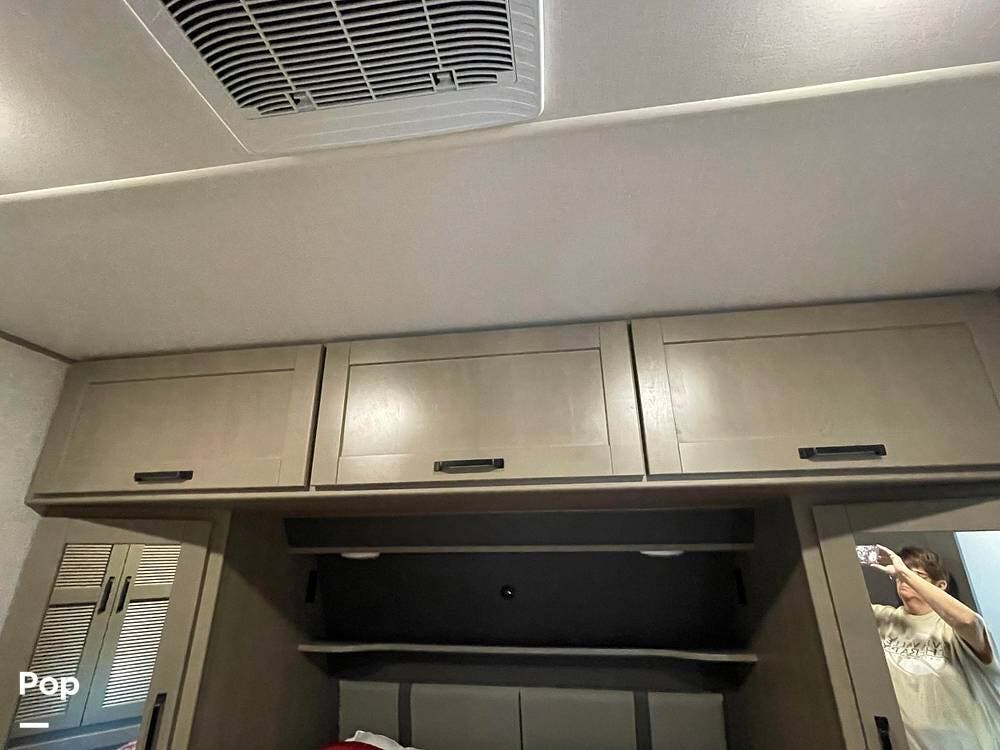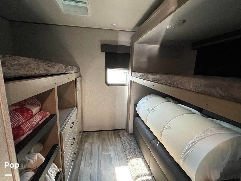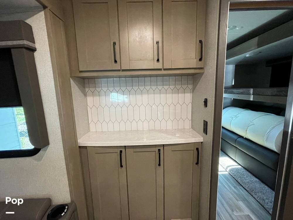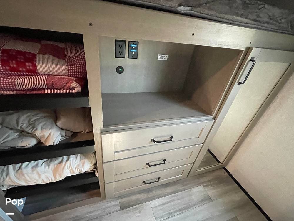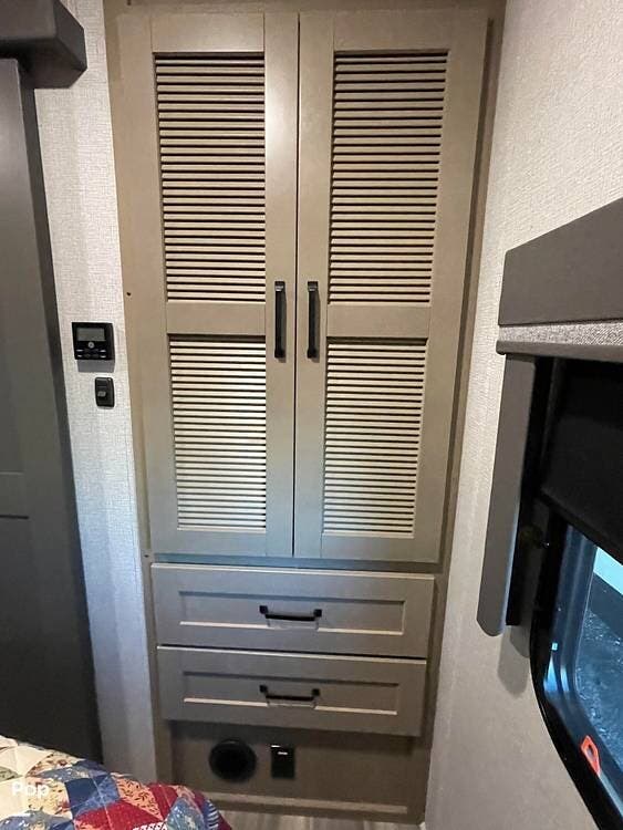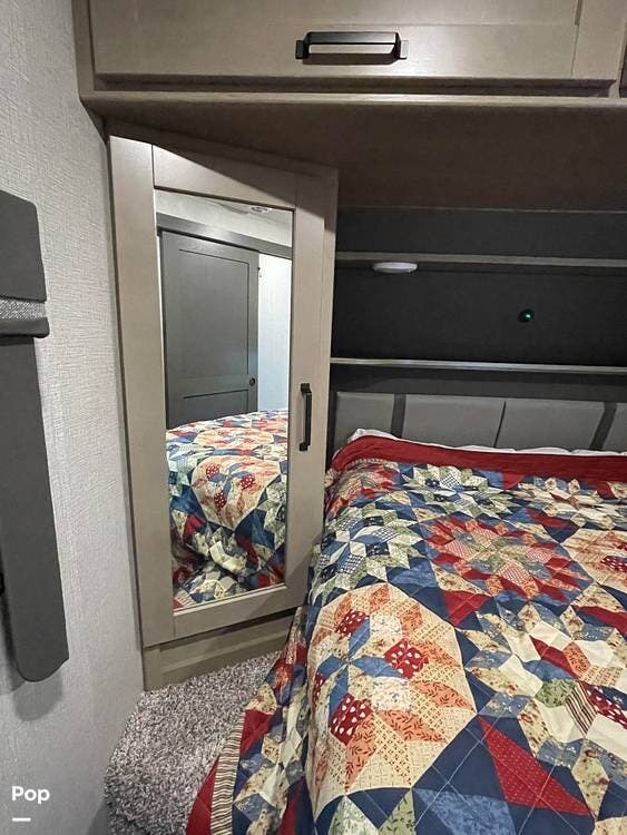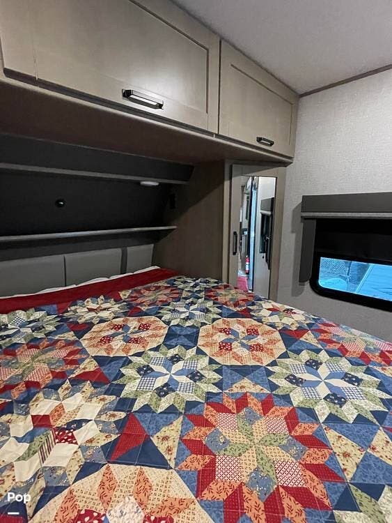 It offers two sleeping areas. The rear bunkhouse is kid-friendly, with multiple bunks and plenty of storage. The master bedroom at the front of the trailer features a comfortable queen-sized bed, wardrobes, and overhead cabinets for ample storage.