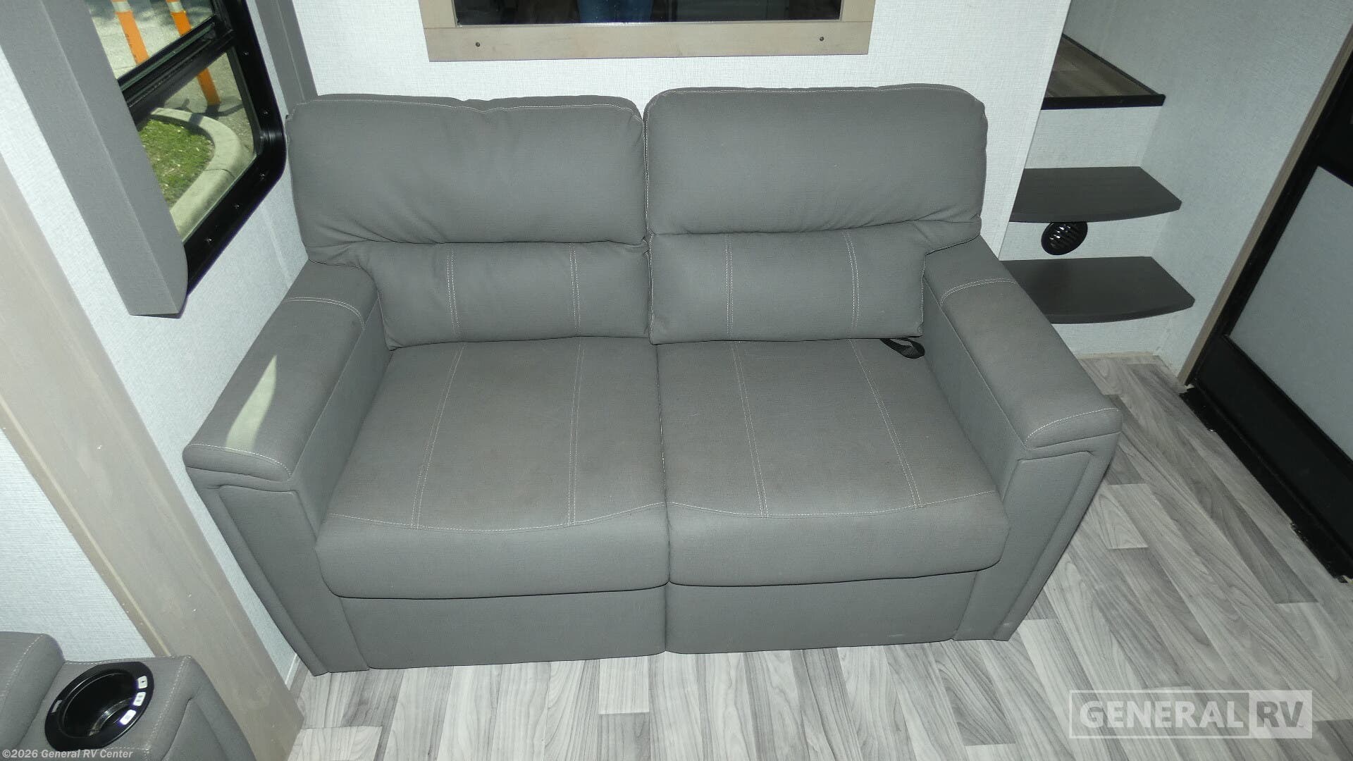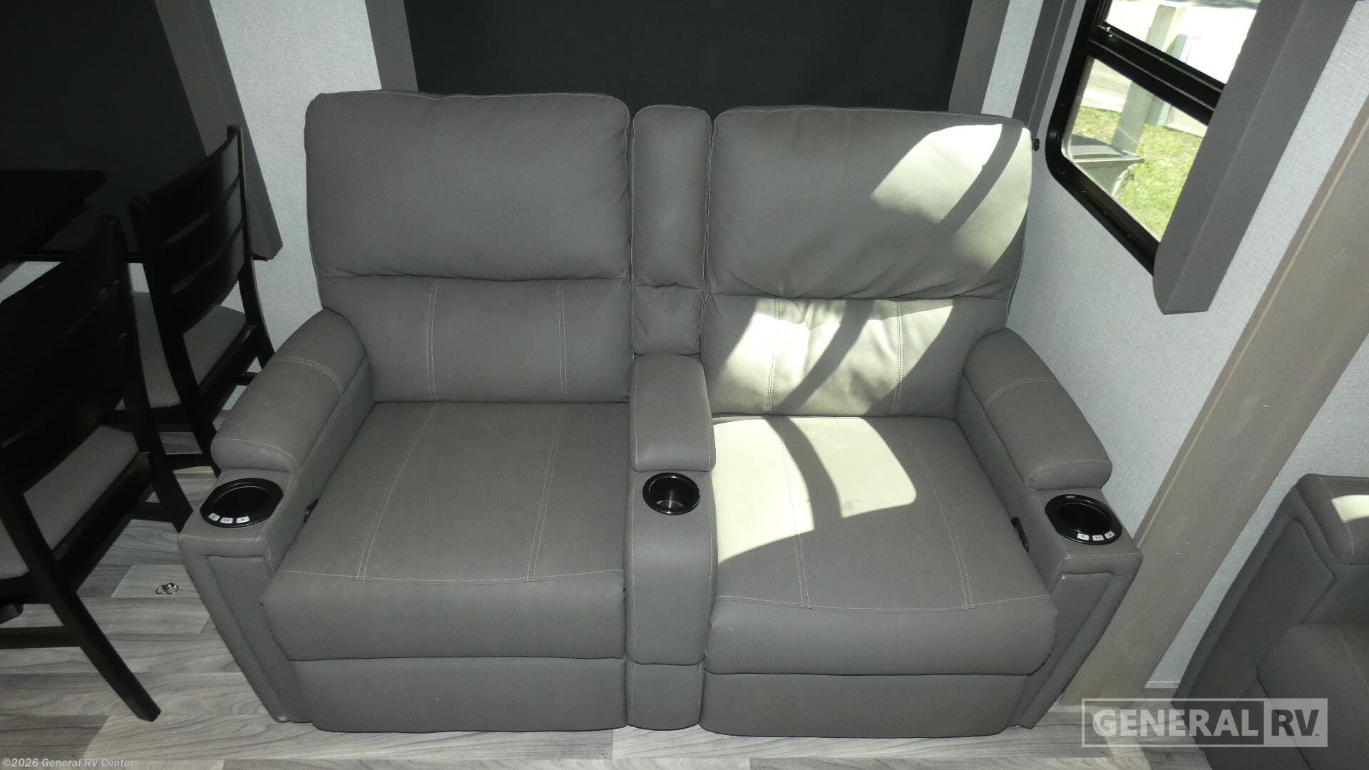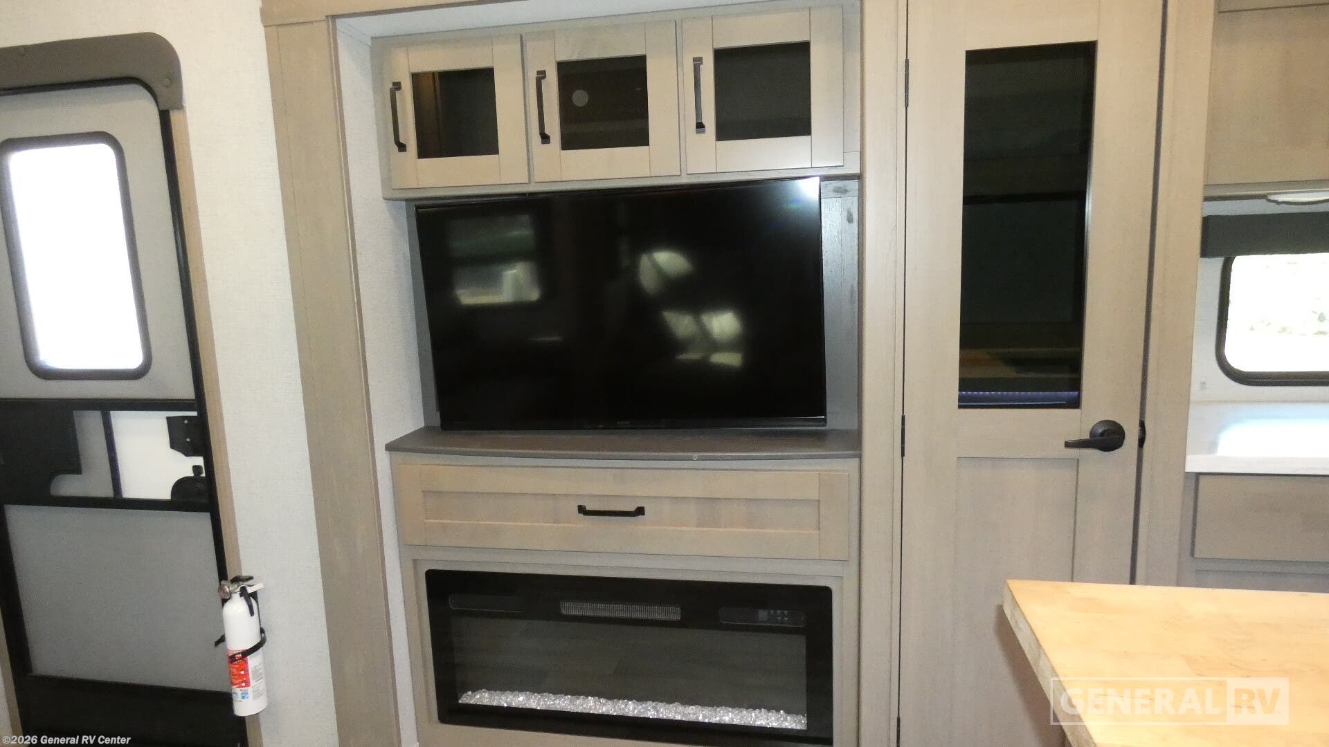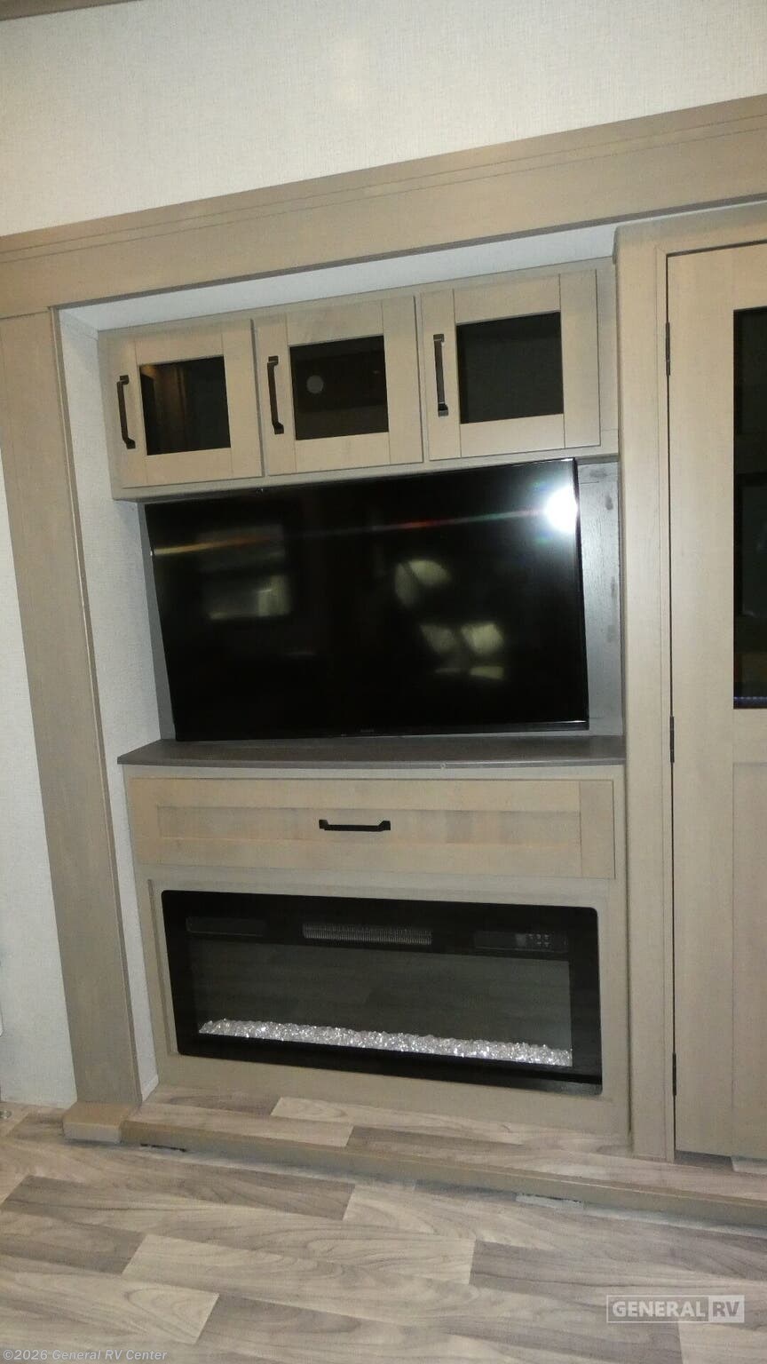 **Grand Design Reflection 320MKS Fifth Wheel — highlights:** - Rear Living Floorplan - Built-In Office / Desk Area - Residential Kitchen with Island - Triple Slide-Outs - Front Private Bedroom The 2023 Grand Design Reflection 320MKS is a rear-living fifth wheel designed for couples or travelers who want a comfortable, residential layout with functional space for extended stays. The rear living area offers theater seating and a sofa arranged around the entertainment center and fireplace, creating a relaxing environment that feels open and inviting. Triple slide-outs expand the living and kitchen areas, providing ample floor space and excellent natural light throughout. One of the standout features of the 320MKS is the dedicated mid-coach desk area, making it a popular choice for remote work or managing day-to-day tasks while traveling. The kitchen includes a large island, solid-surface countertops, ample storage, and a residential refrigerator for longer trips. Up front, the private bedroom features a queen bed and a spacious wardrobe with washer/dryer prep. With its blend of comfort, livability, and Grand Design build quality, the Reflection 320MKS is well suited for full-time living or extended travel.