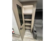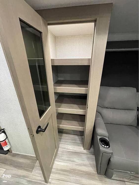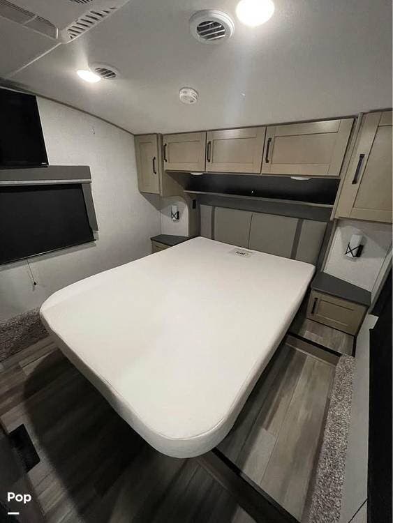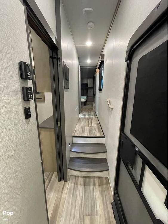 One of the best parts of this floor plan is the mid-bunk room. It's between the kitchen and the bedroom, making it perfect for kids or guests. The front bedroom has a walk-around queen bed and a wardrobe prepped for a washer/dryer.