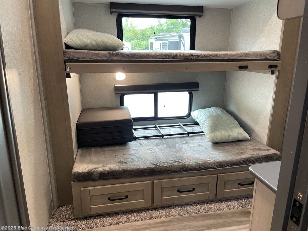 When you are looking for a versatile extra room for either a second bedroom or living area as well as an office, this middle bunkhouse might just work! There is a slide out with two bunks and drawers plus a full size dresser. You can sleep like a queen on the walk-around bed in the front private bedroom that offers more clothing storage and windows for views. The rear main living and kitchen area provides plenty of seating on the a 78" triple person theatre seats, and on the 92" U-shaped lounge with table with windows within the slide for natural lighting and great views. The kitchen island gives the cook more space to make and serve meals, and the gourmet kitchen includes a 16 cu. ft. refrigerator, plus a pantry for dry goods. There is an exterior outside kitchen with a griddle and a 1.6 cu. ft. refrigerator for beverages and such, plus you will find an LP quick connect, Coax TV hookup, and a spray port to wash off your dirty shoes.