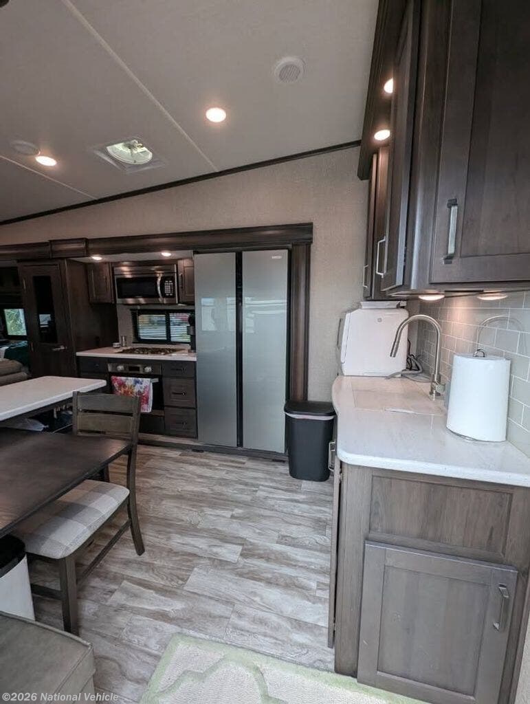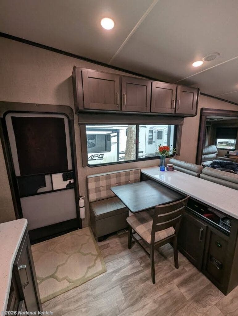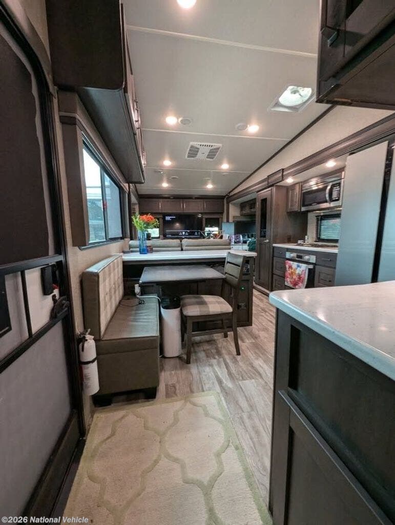 The kitchen is fully equipped with Corian solid-surface countertops, a large pantry, stovetop, oven, microwave, and refrigerator/freezer, along with a freestanding adjustable dining table with chairs and bench seating. A combo washer/dryer is also installed for extended travel convenience.
