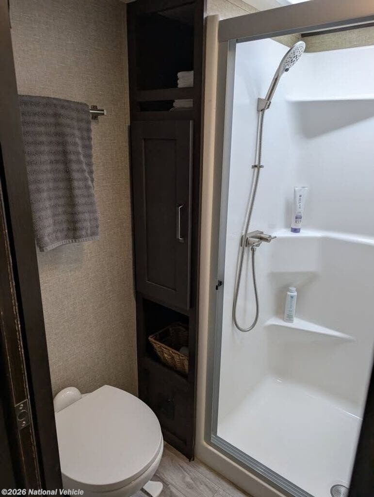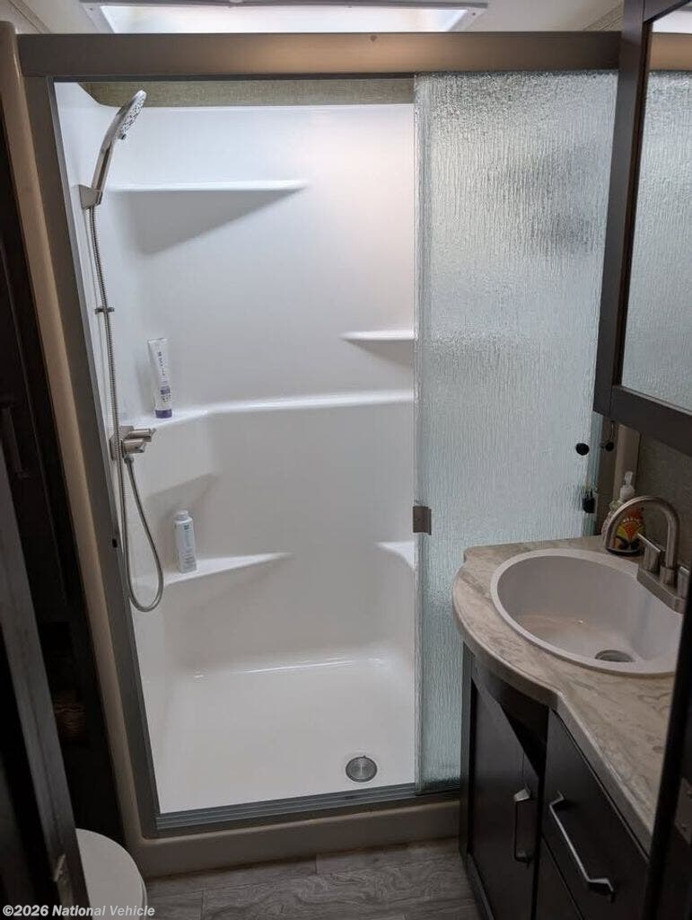 Up front, the private bedroom features a queen walk-around bed (with room to upgrade to a king), wardrobe storage, and the unit is prepped for a second TV. The seller has also replaced the second loveseat with a desk/workstation, making it ideal for remote work while traveling.