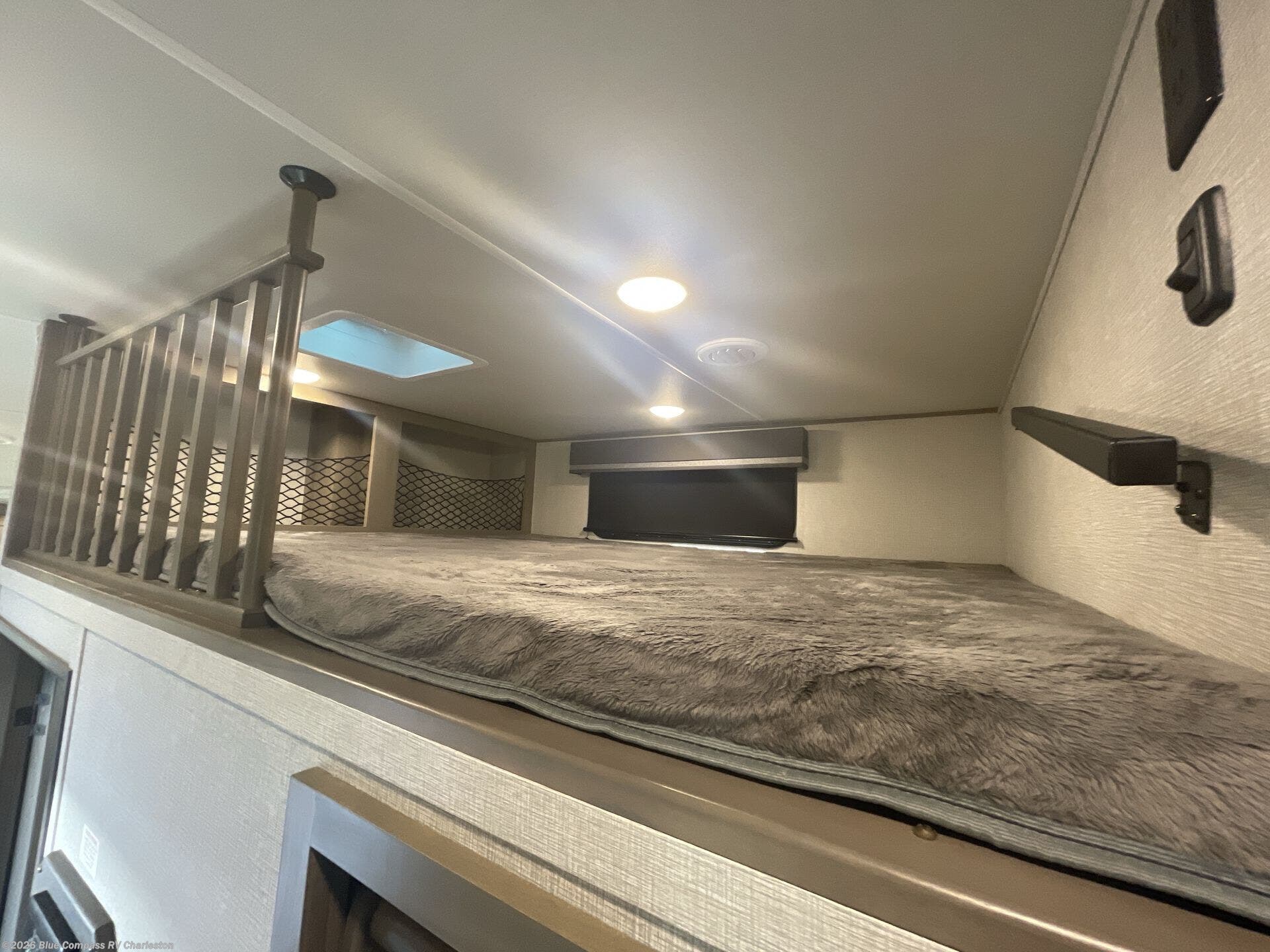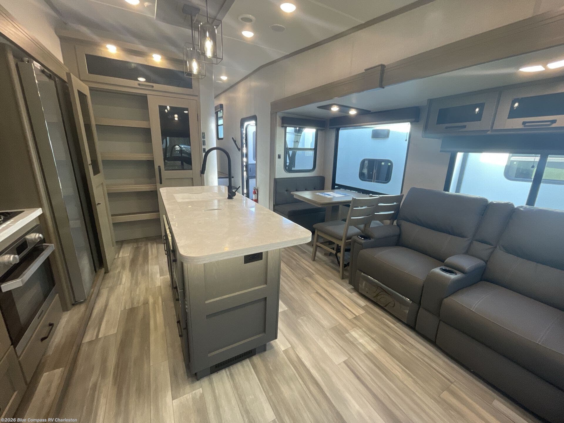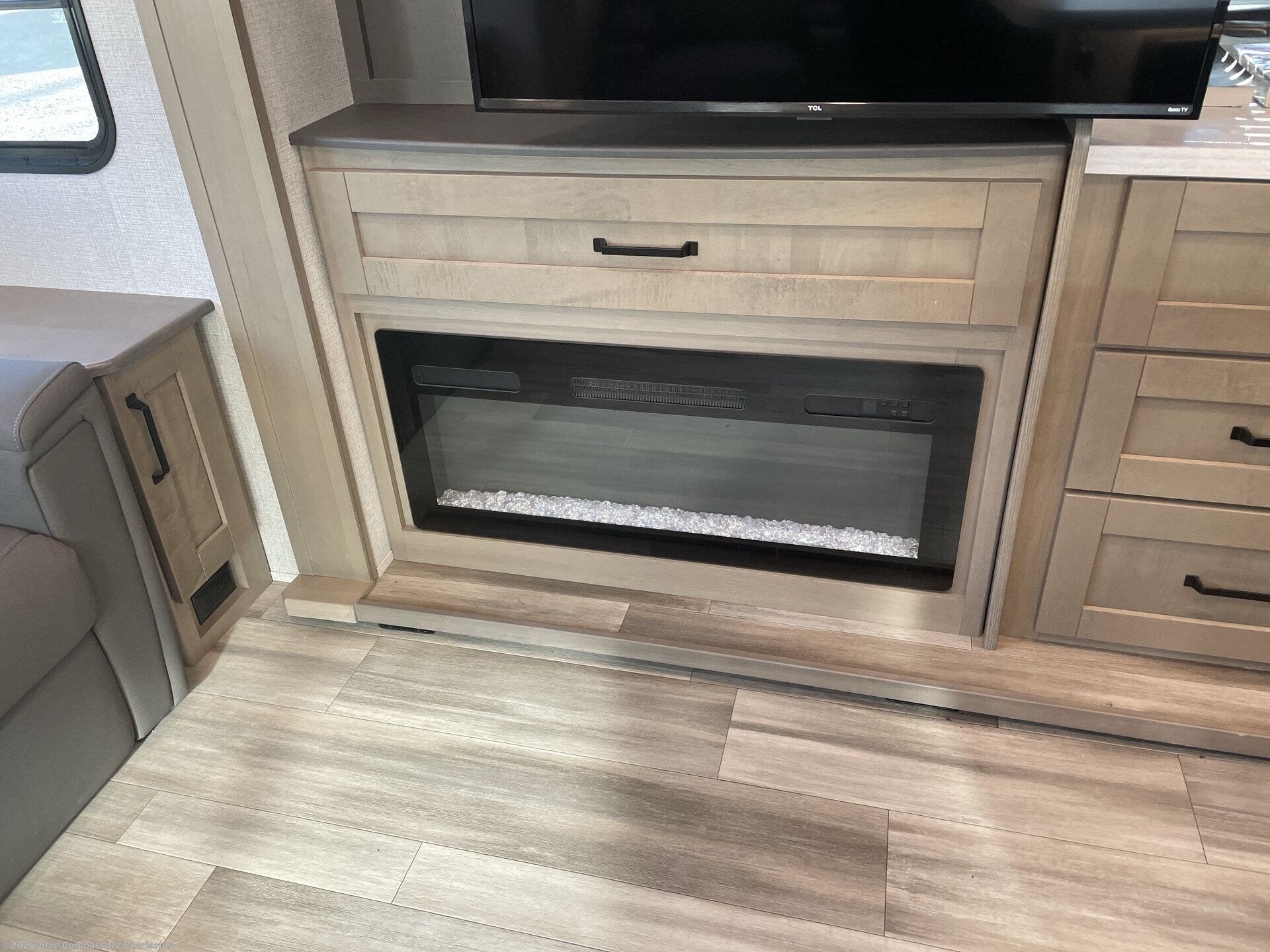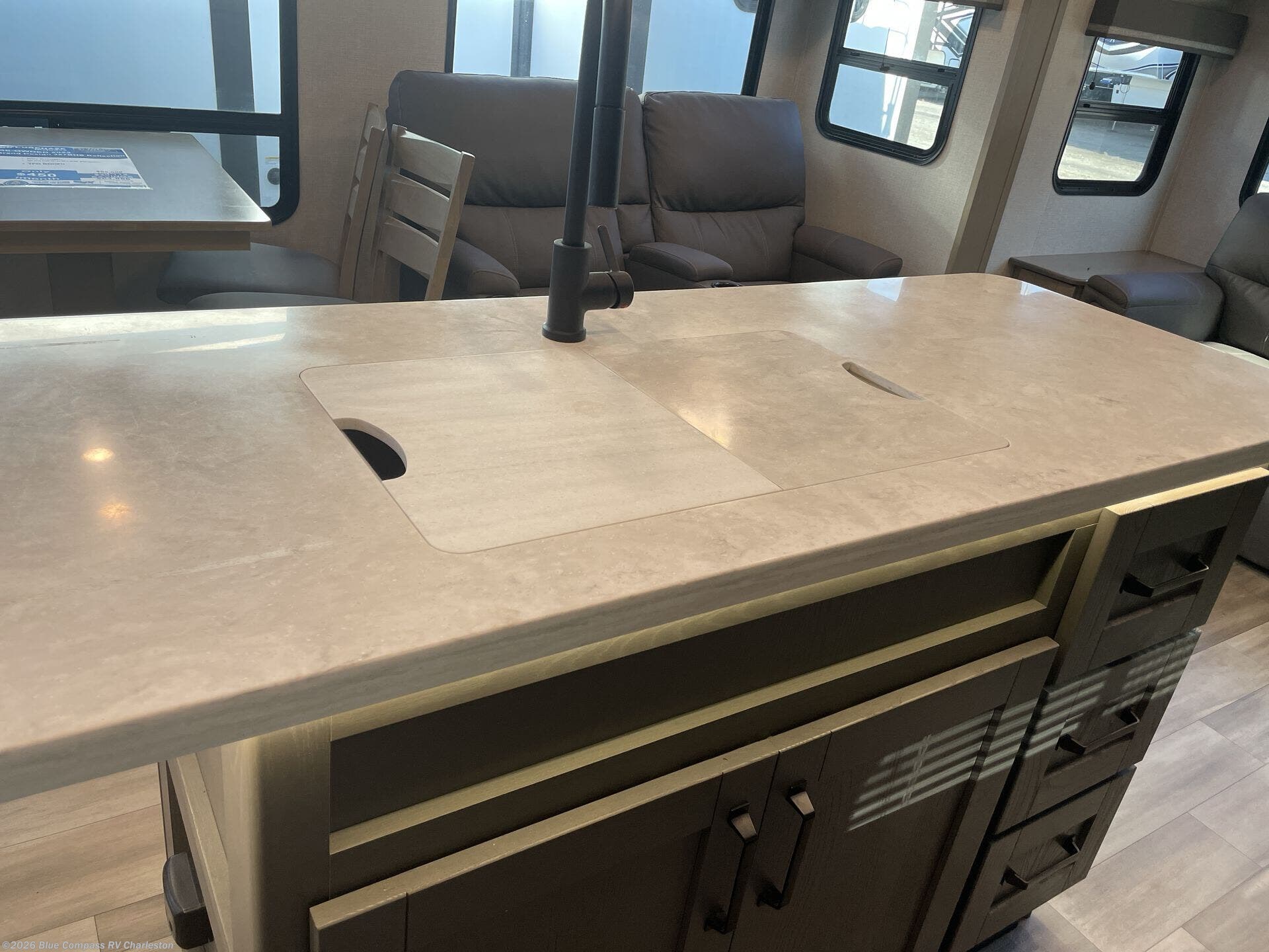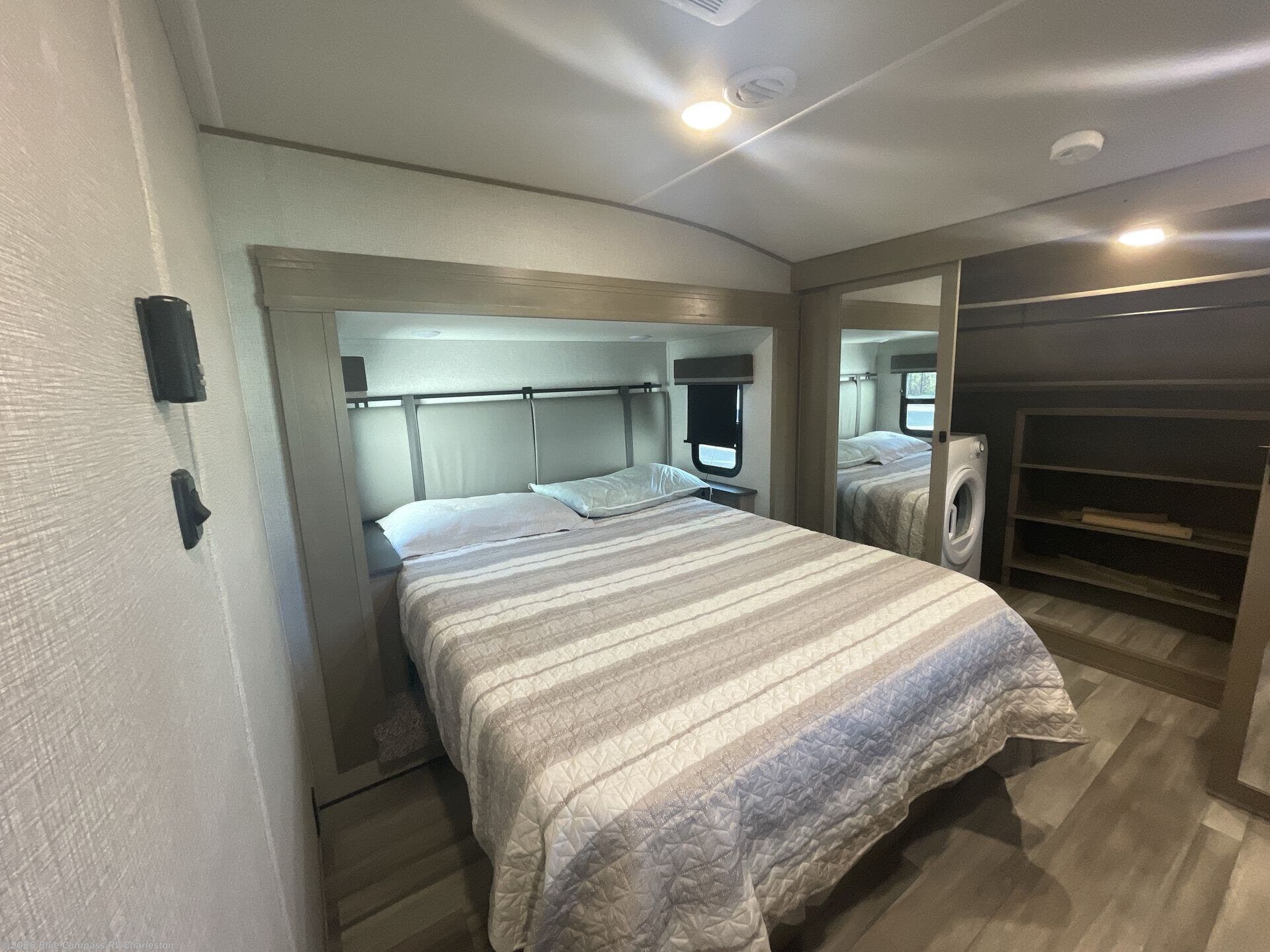 Travel to see new state parks, RV resorts or your family in other states as you tow this fifth wheel to each destination! You will enjoy comfort and convenience, plus a place to work, and be able to offer extra sleeping space for friends and family when they visit. The middle extra room provides a tri-fold sofa slide, a desk, a wardrobe, plus a 64" x 88" upper bed loft area with access from the hallway, which provides two different places to accommodate overnight guests. The full bathroom will keep everyone refreshed, and the front bedroom allows you to sleep on a queen bed slide or choose the king option. And you will love the front wardrobe, the dresser, and the option to add a washer/dryer. The main living and kitchen area provides plenty of seating from the rear tri-fold sofa, the booth dinette or choose the free standing dinette option, and the theatre seats with cupholders. And the kitchen island, the appliances, and the large pantry allow you to take everything you need with you.