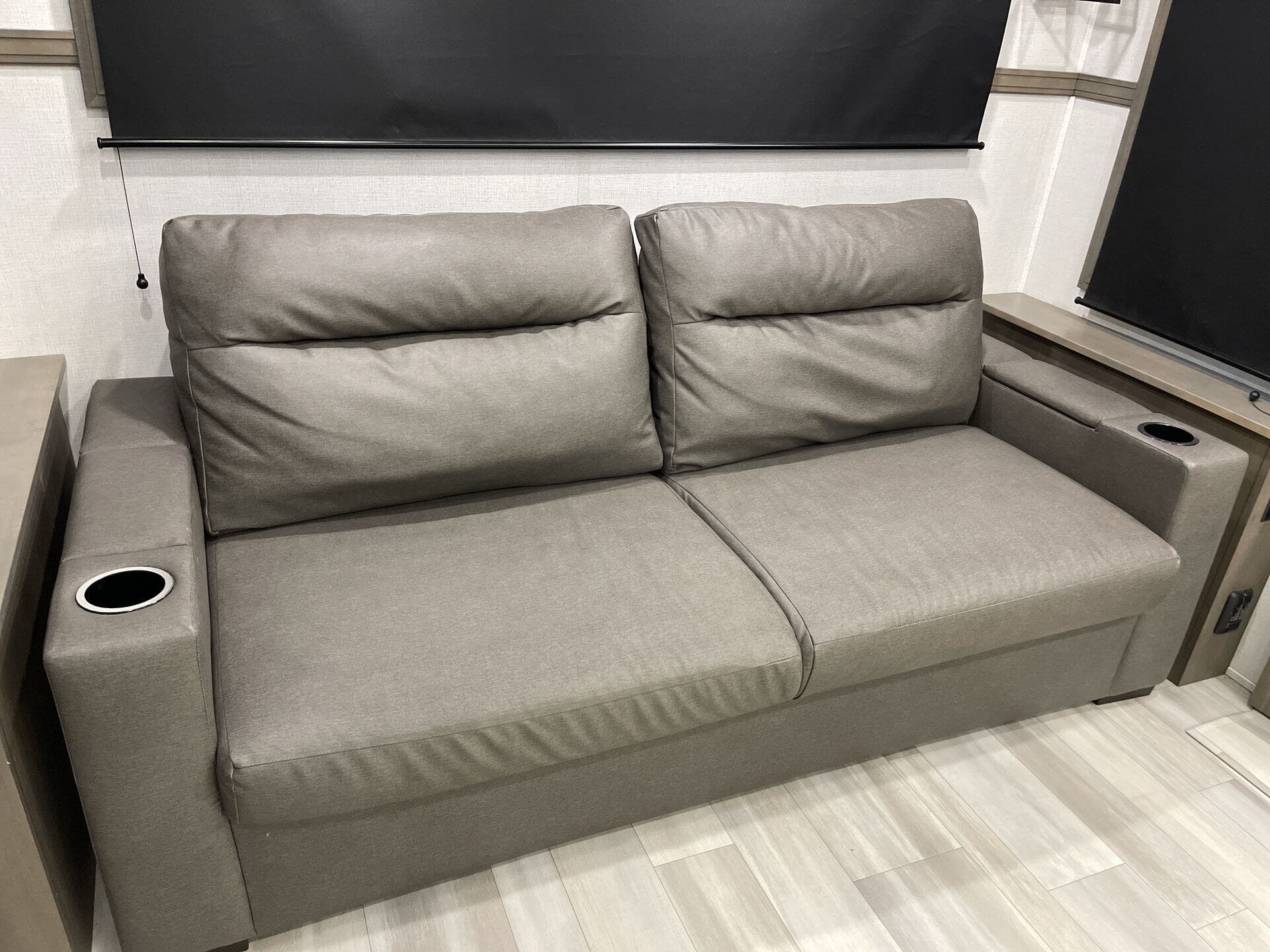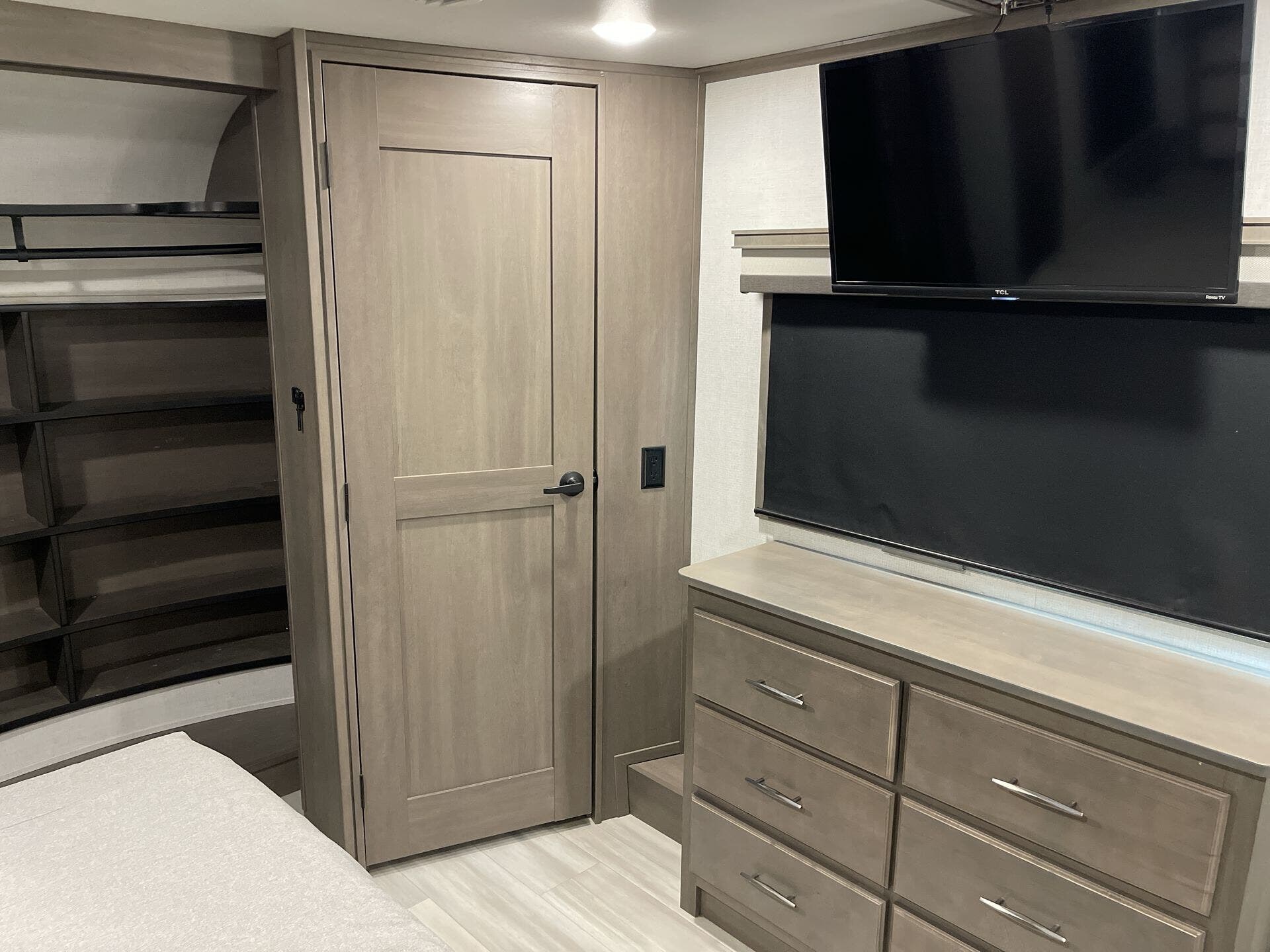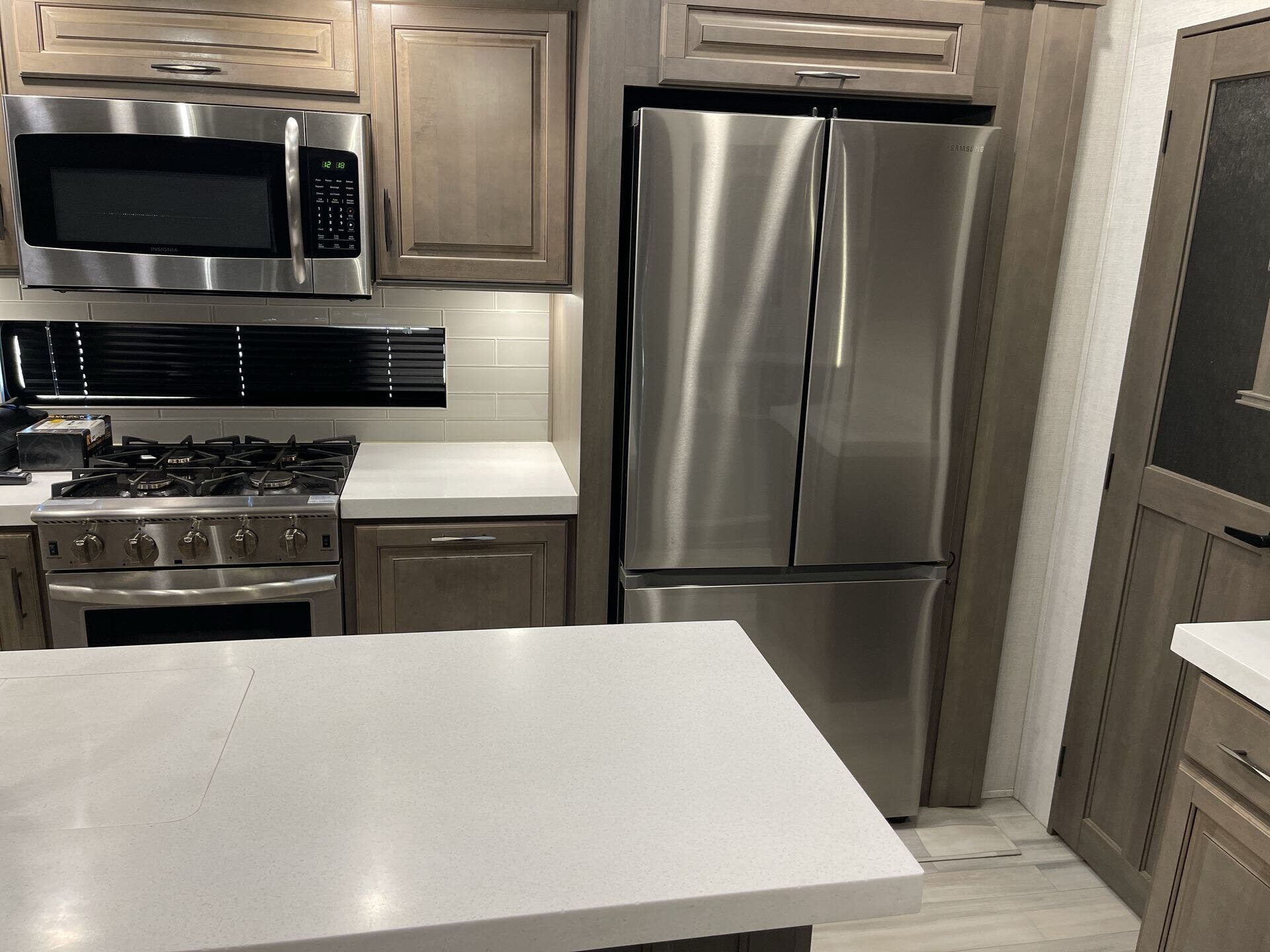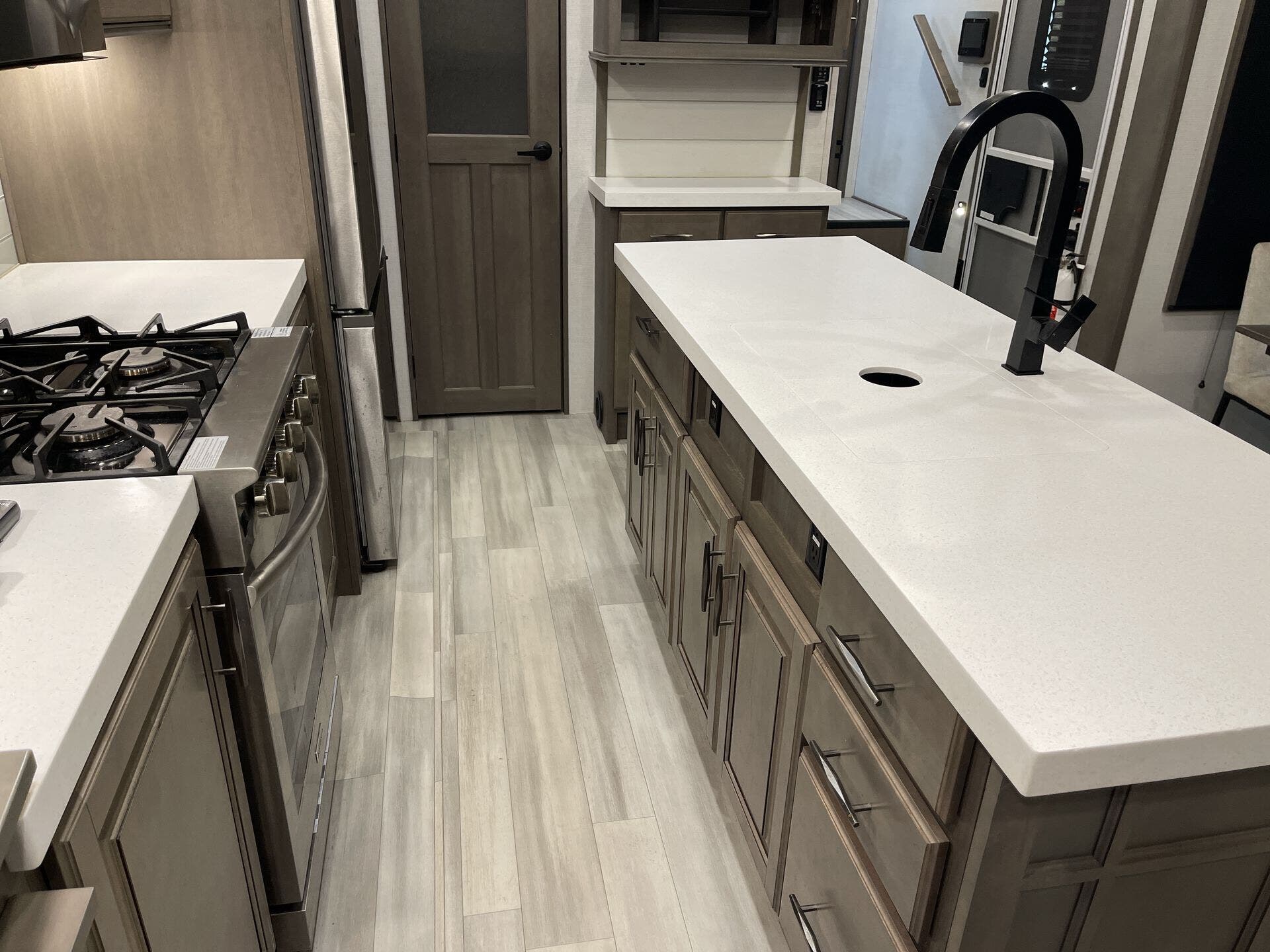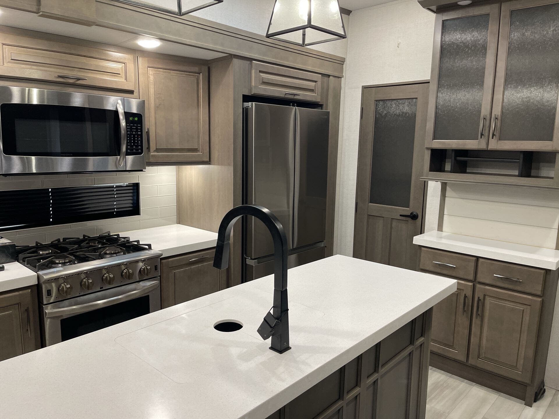 The 310 GK-R floorplan combines a front bedroom, a kitchen island, and a mid kitchen with a mid bath, plus rear entertainment and rear living areas. This layout maximizes social space without sacrificing privacy, making it ideal for entertaining guests or enjoying quiet nights in. Features like theater seating and a large living area provide comfort for movie nights, while the kitchen island offers ample prep and dining space for meals on the go.
