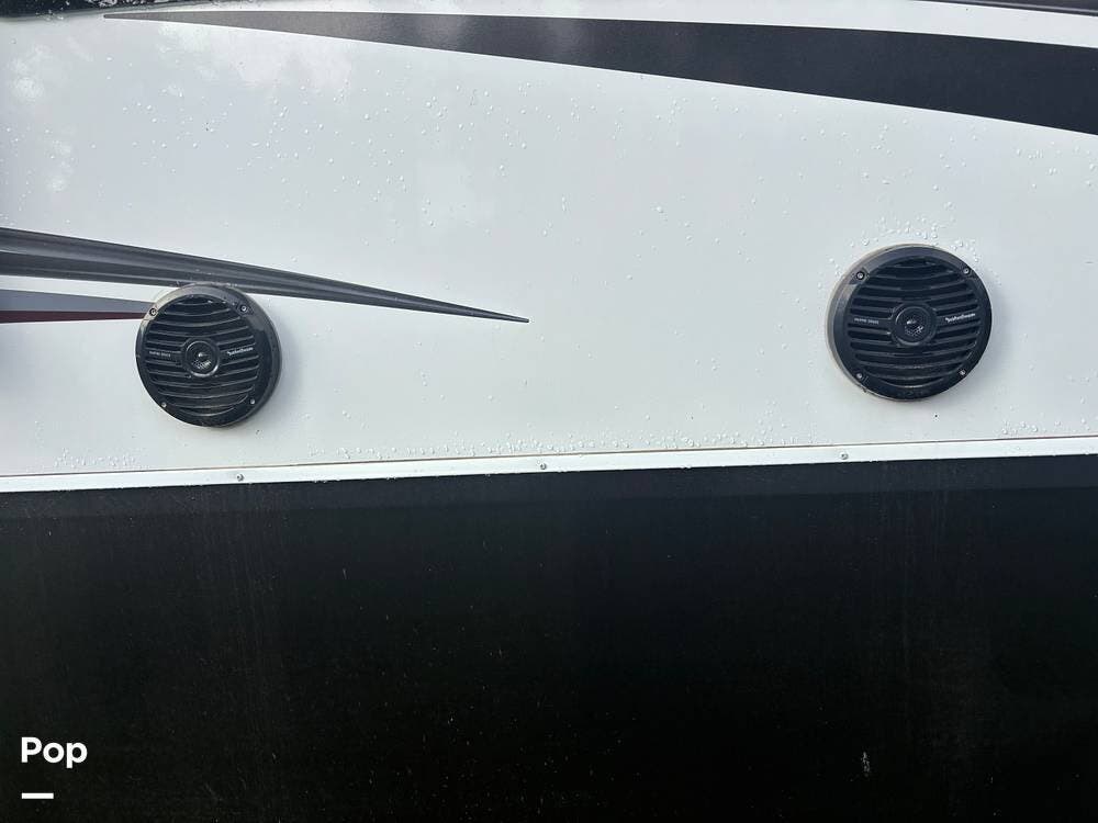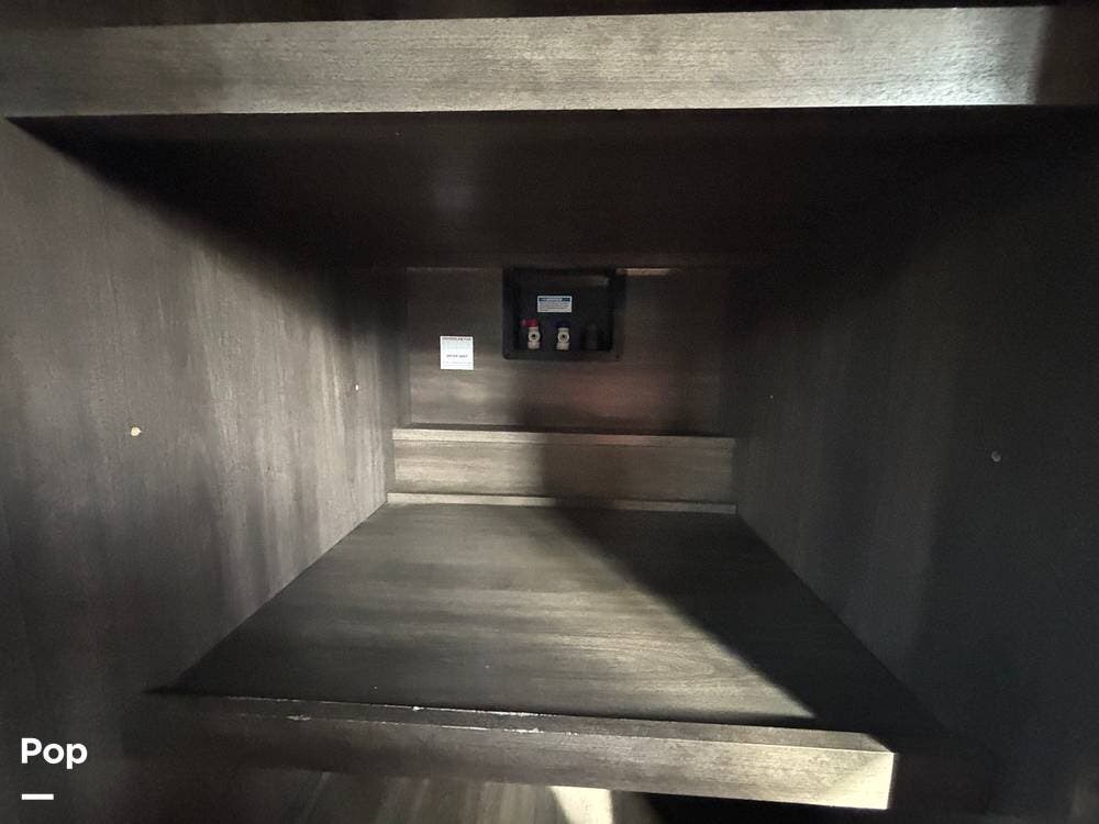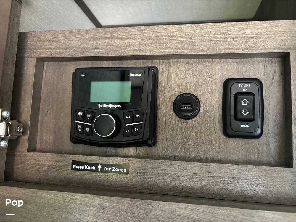 The main living area features a fireplace, sofa sleeper, and entertainment center with dual TVs and a stereo system with Bluetooth connectivity.
