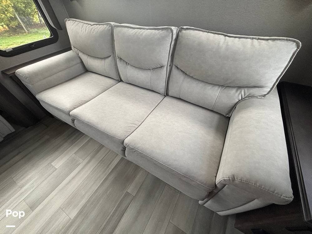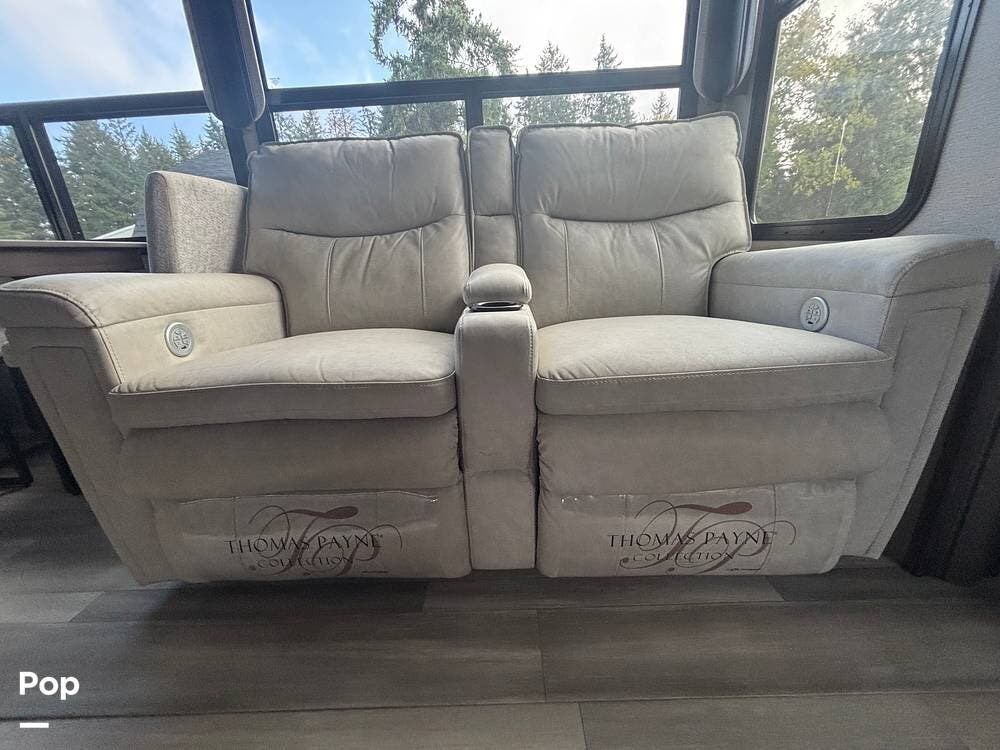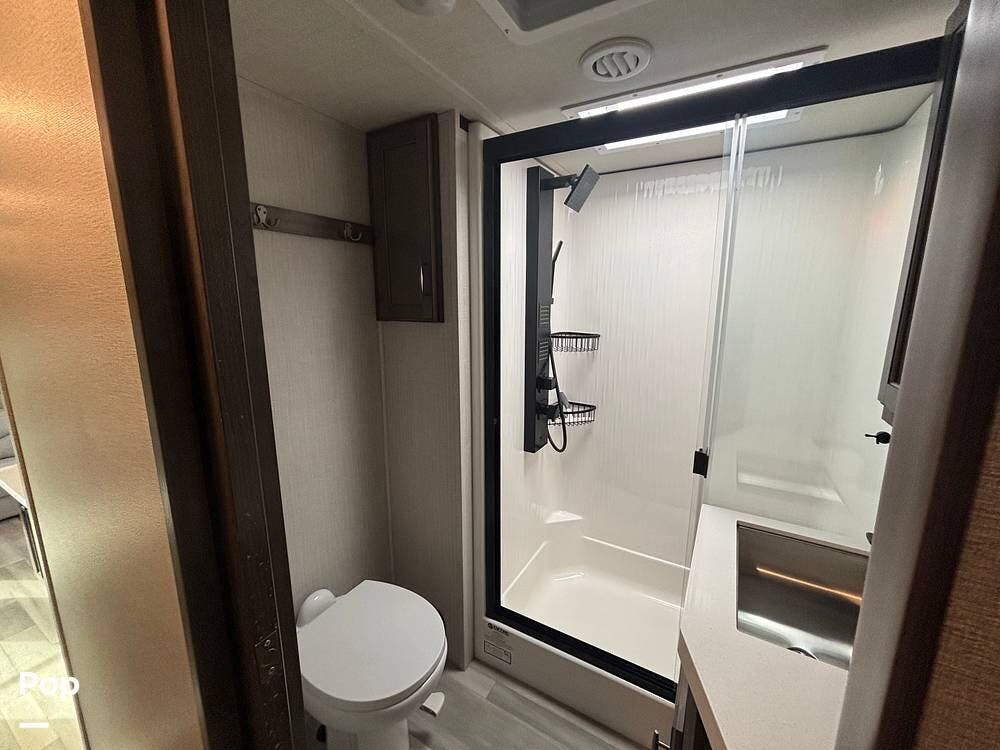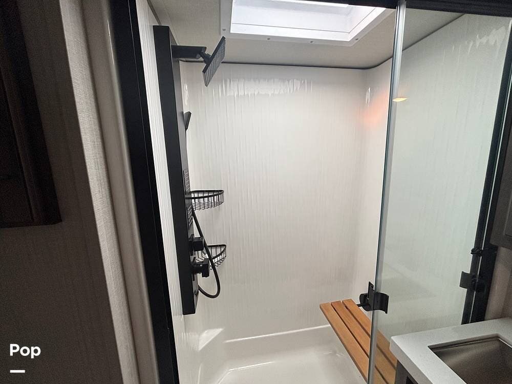 The full bathroom includes a skylight, shower, and medicine cabinet. The king bed, heated and massaging recliners, and tinted windows bring comfort to every trip. Powered by a 330W solar panel system and backed by automatic leveling jacks, this Solitude is ready for adventure.