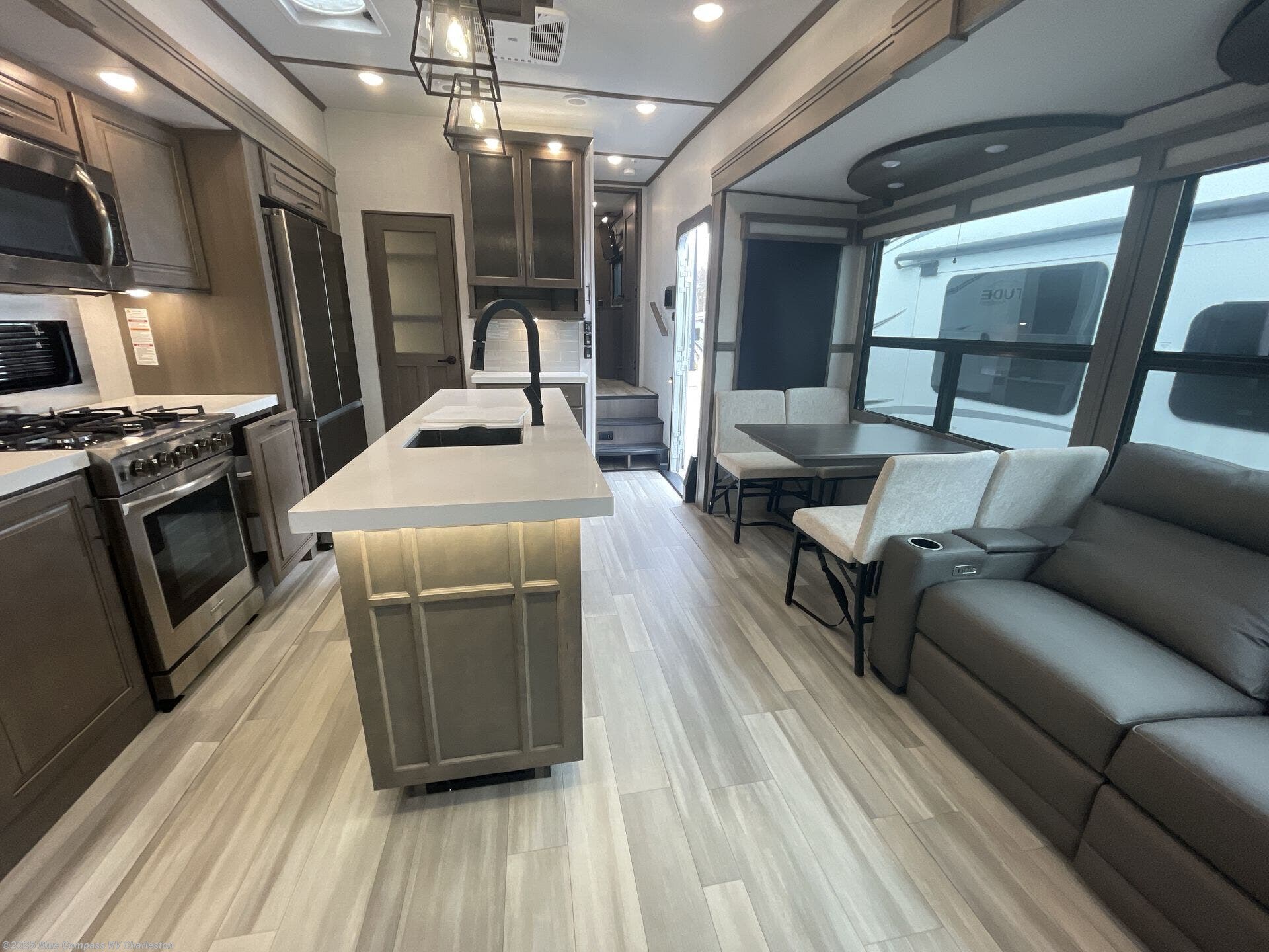 Each Solitude fifth wheel by Grand Design features a 101" wide-body construction, heavy duty 7,000 lb. axles, frameless tinted windows, and high-gloss gel coat sidewalls. You can camp year around thanks to the Weather-Tek Package that includes a 35K BTU high-capacity furnace, an all-in-one enclosed and heated utility center, and a fully enclosed underbelly with heated tanks and storage. Inside, you'll love the premium roller shades, hardwood cabinet doors, solid surface countertops and sinks, plus residential finishes throughout to make you truly feel at home. Each model also includes a MORryde CRE3000 suspension system, self adjusting brakes, and a MORryde pin box that will provide smooth towing from home to campground. Affordable luxury is possible with the Solitude fifth wheels; choose yours today!