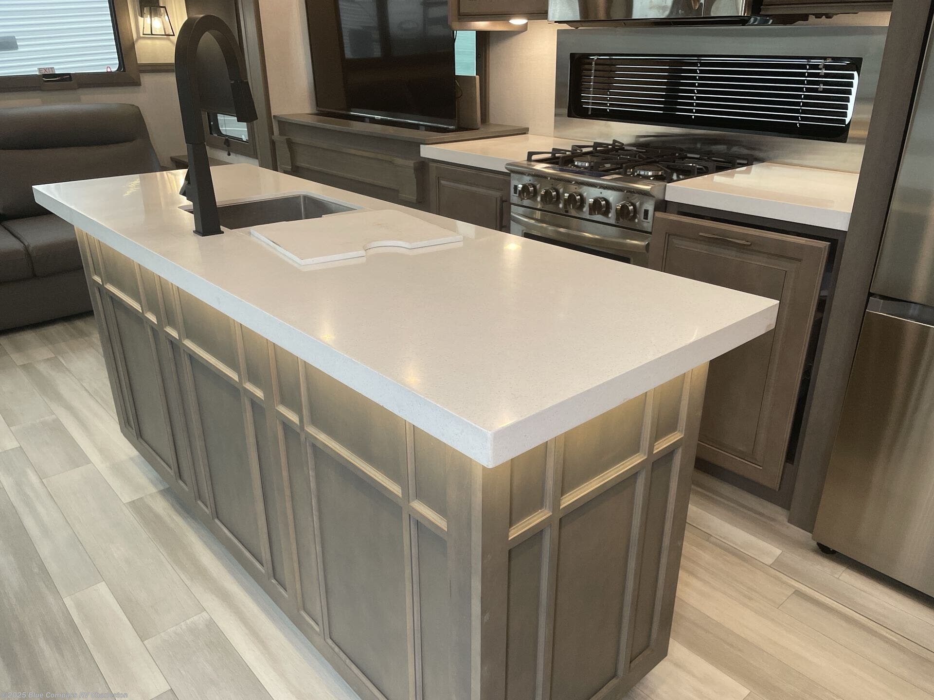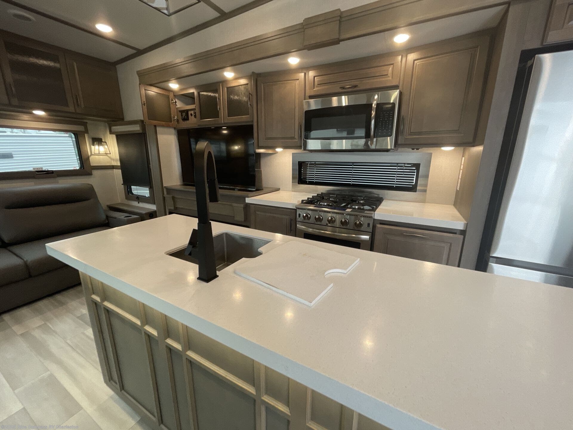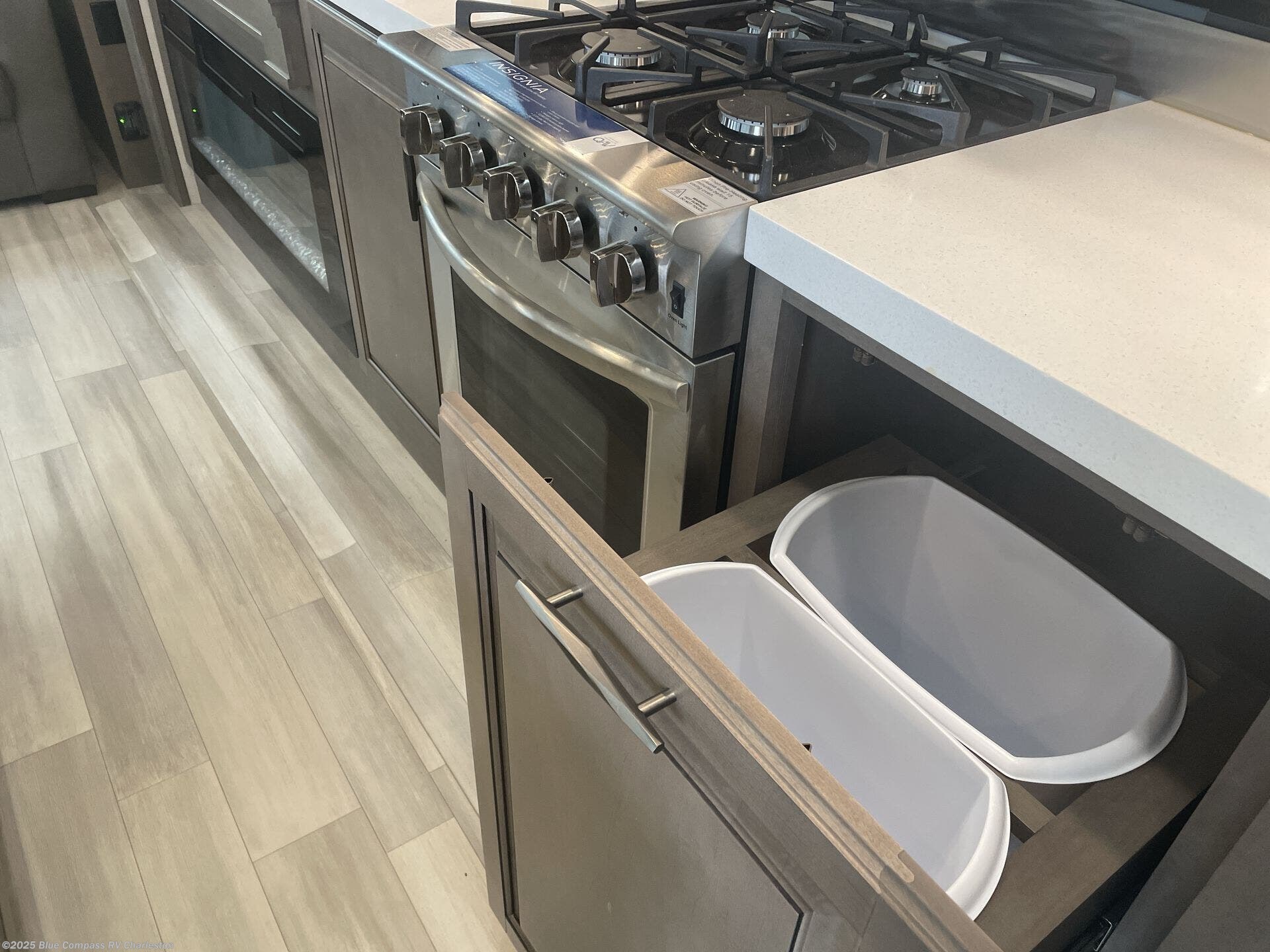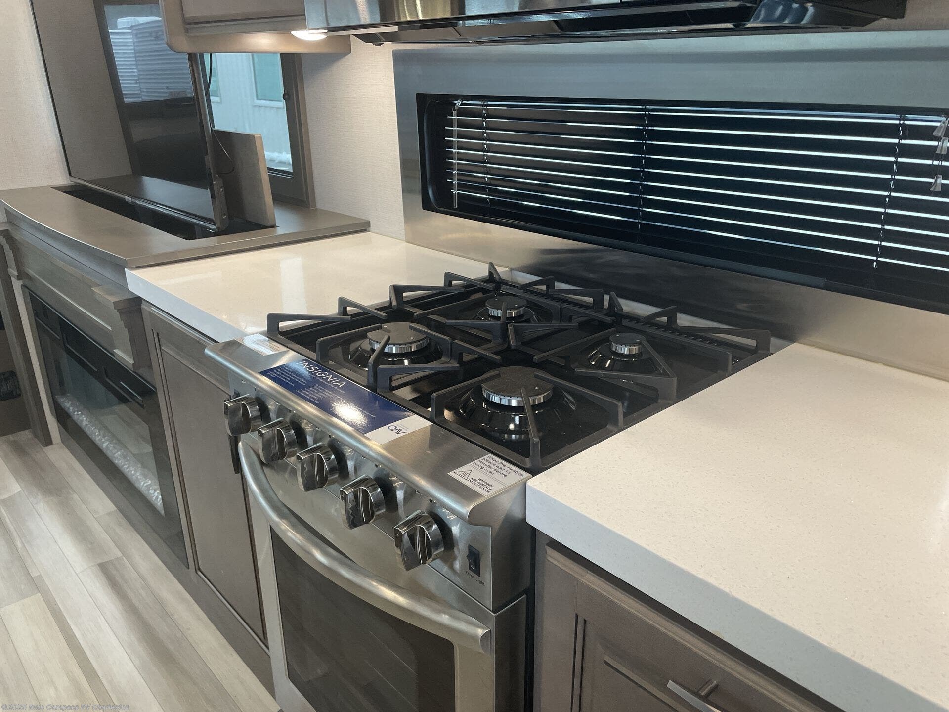 Traveling for long periods at a time is made easy with this gourmet kitchen that can feed your entire group a holiday meal! The professional-grade stainless steel cooktop with a built-in 24" residential oven, microwave, 12V 20 cu. ft. refrigerator, and a kitchen island offers everything you will need to enjoy cooking for your family and guests. There is abundant storage throughout multiple overhead cabinets, a kitchen pantry and hutch, show storage under the interior steps, a bath linen cabinet for your towels, and in the front master bedroom which features a large closet. In the bedroom there is also a queen bed on a slide for added space to sleep comfortable at night, or you may choose an optional king bed if you enjoy more space. You will also find a closet prepped for an optional washer/dryer, large wardrobe, plus a flip-top dresser with an LED TV above. In the bathroom, enjoy a hot shower with a flip-up teak seat and overhead skylight, plus a vanity with sink. Two nice awnings will provide outdoor living space keeping you protected from the sun and rain, and you can add an optional pull-out kitchen to enjoy convenient cooking outdoors as well.