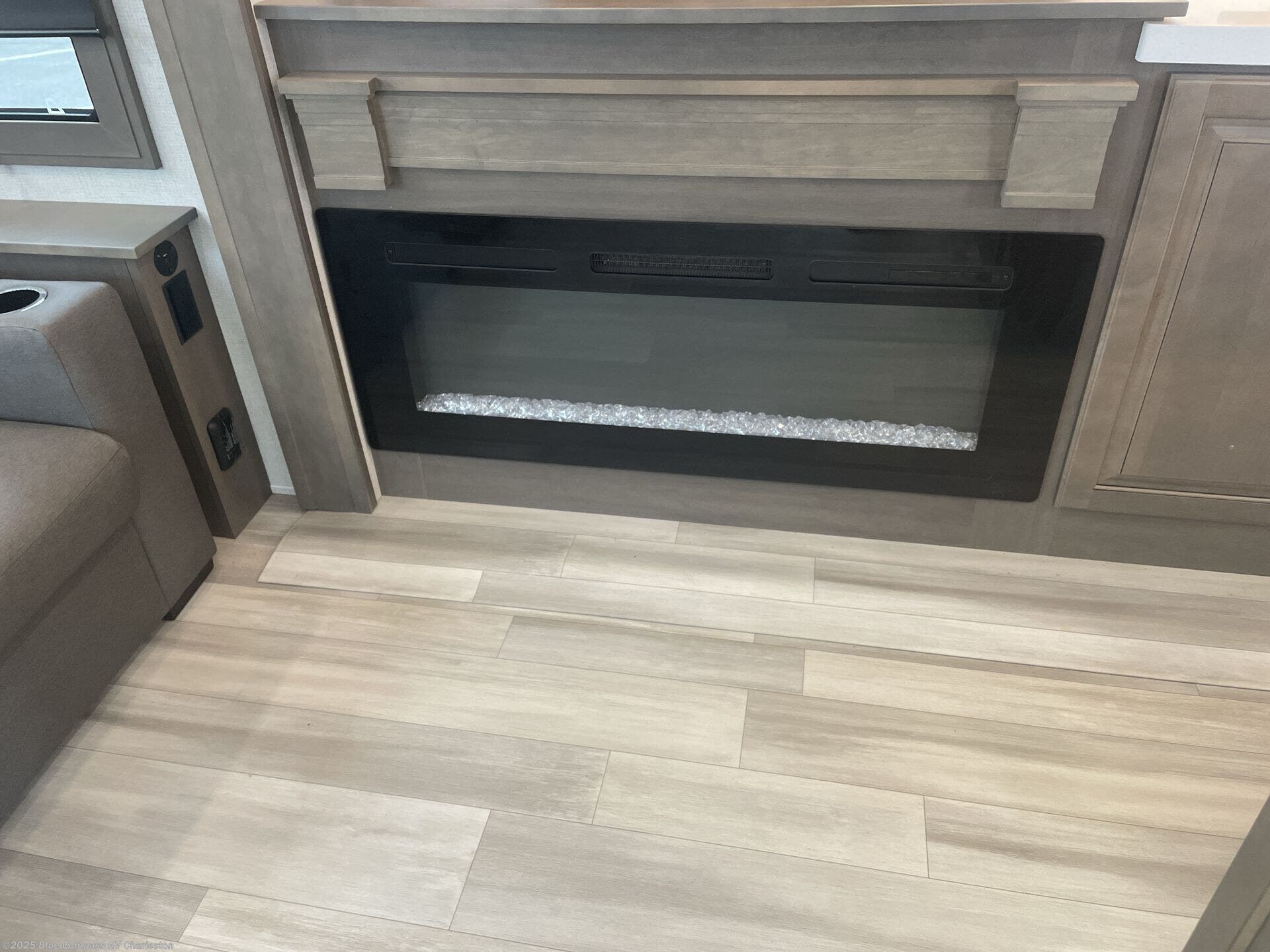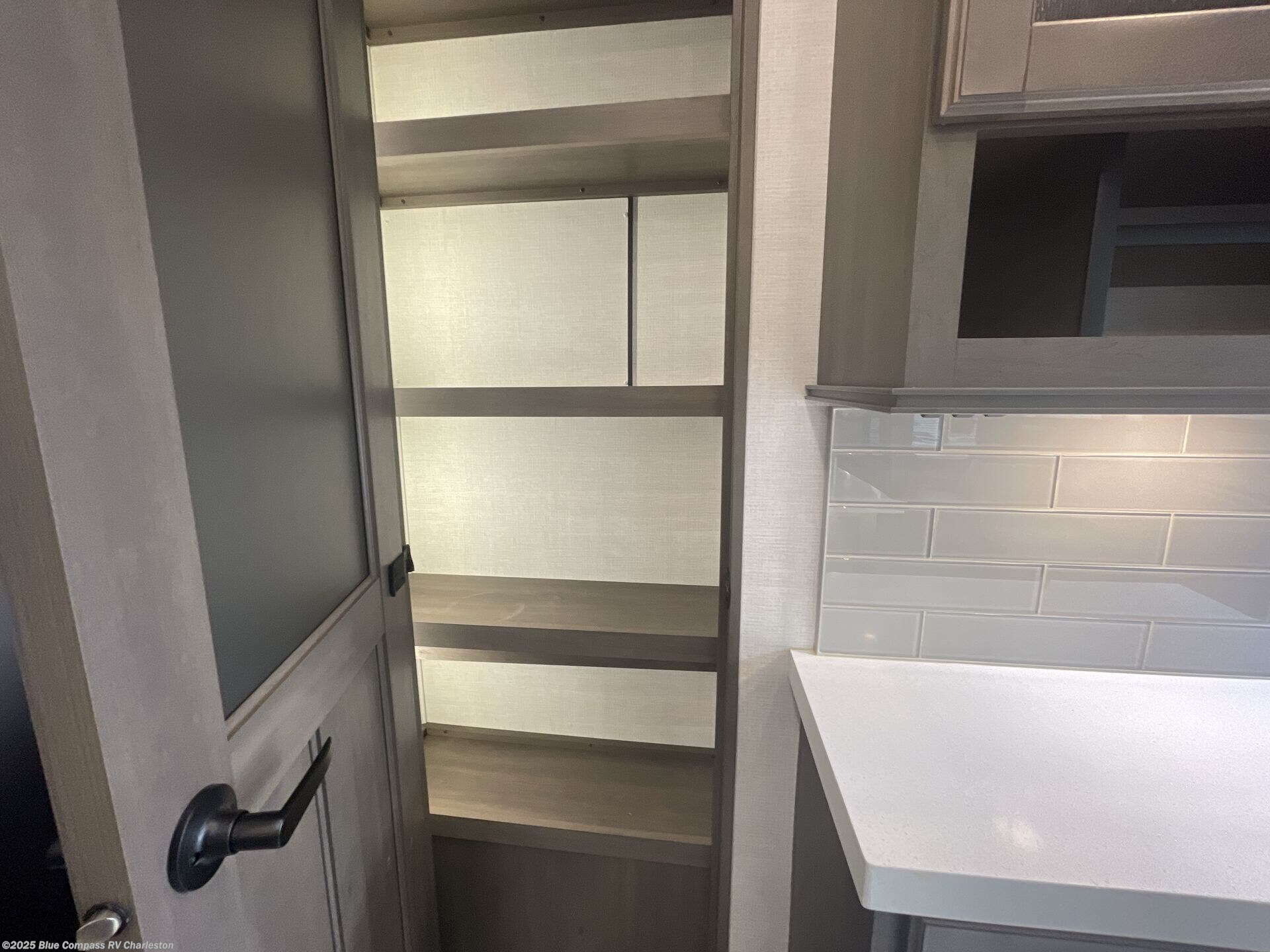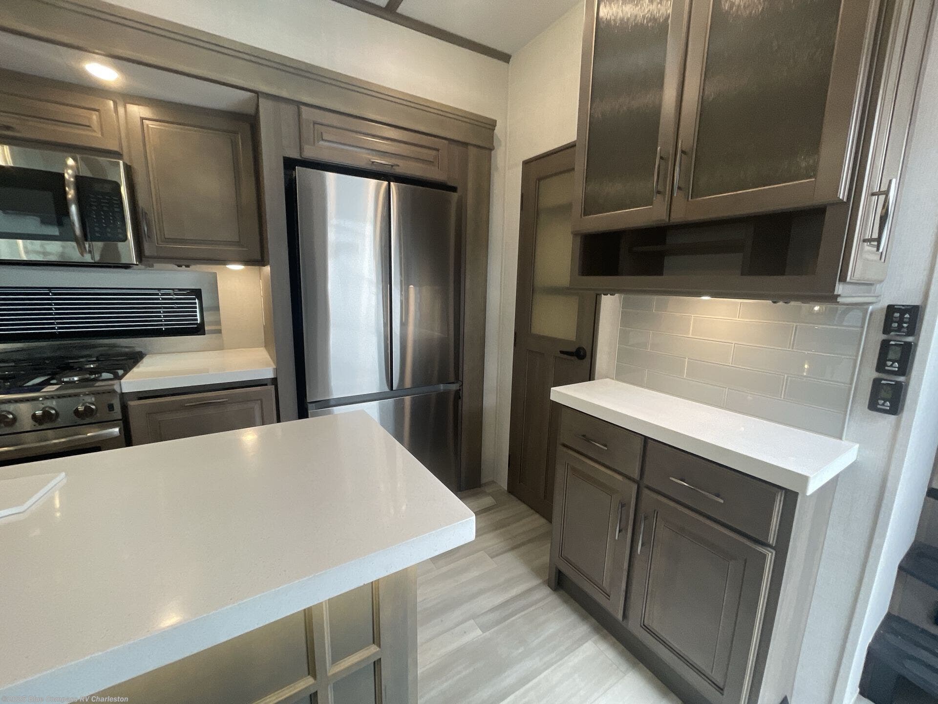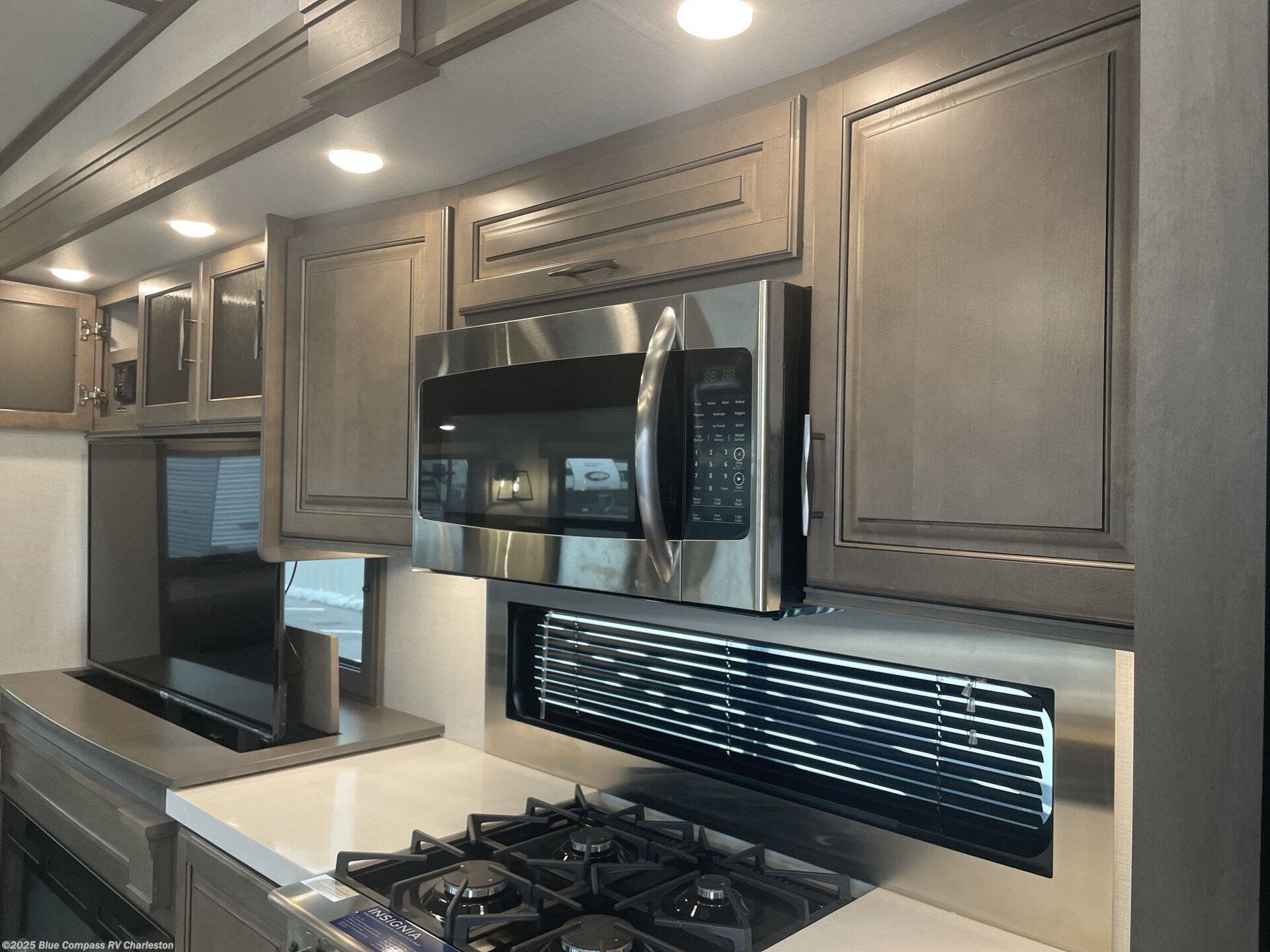 Traveling for long periods at a time is made easy with this gourmet kitchen that can feed your entire group a holiday meal! The professional-grade stainless steel cooktop with a built-in 24" residential oven, microwave, 12V 20 cu. ft. refrigerator, and a kitchen island offers everything you will need to enjoy cooking for your family and guests. There is abundant storage throughout multiple overhead cabinets, a kitchen pantry and hutch, show storage under the interior steps, a bath linen cabinet for your towels, and in the front master bedroom which features a large closet. In the bedroom there is also a queen bed on a slide for added space to sleep comfortable at night, or you may choose an optional king bed if you enjoy more space. You will also find a closet prepped for an optional washer/dryer, large wardrobe, plus a flip-top dresser with an LED TV above. In the bathroom, enjoy a hot shower with a flip-up teak seat and overhead skylight, plus a vanity with sink. Two nice awnings will provide outdoor living space keeping you protected from the sun and rain, and you can add an optional pull-out kitchen to enjoy convenient cooking outdoors as well.