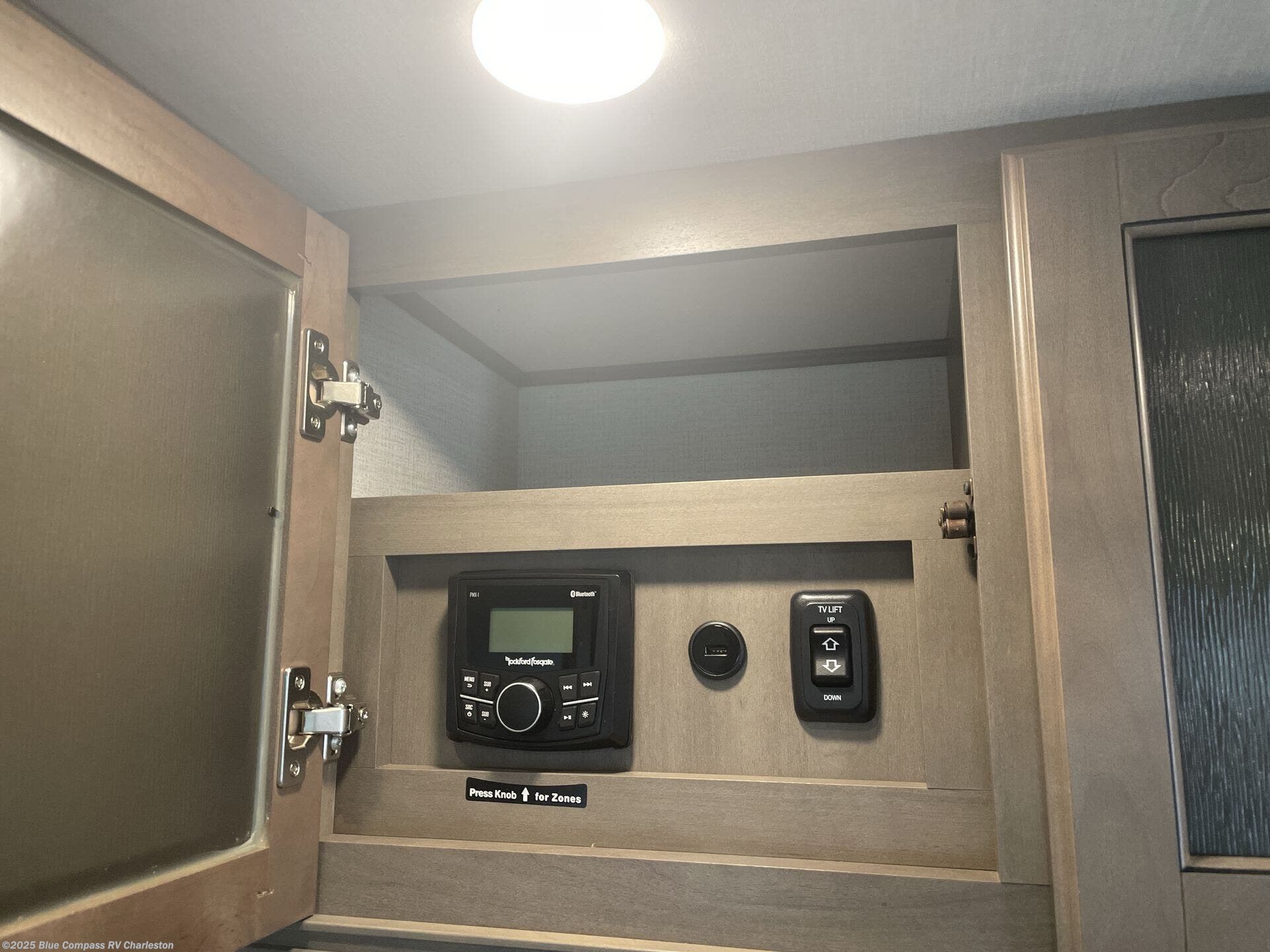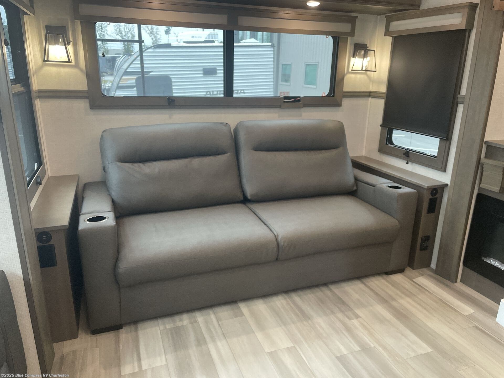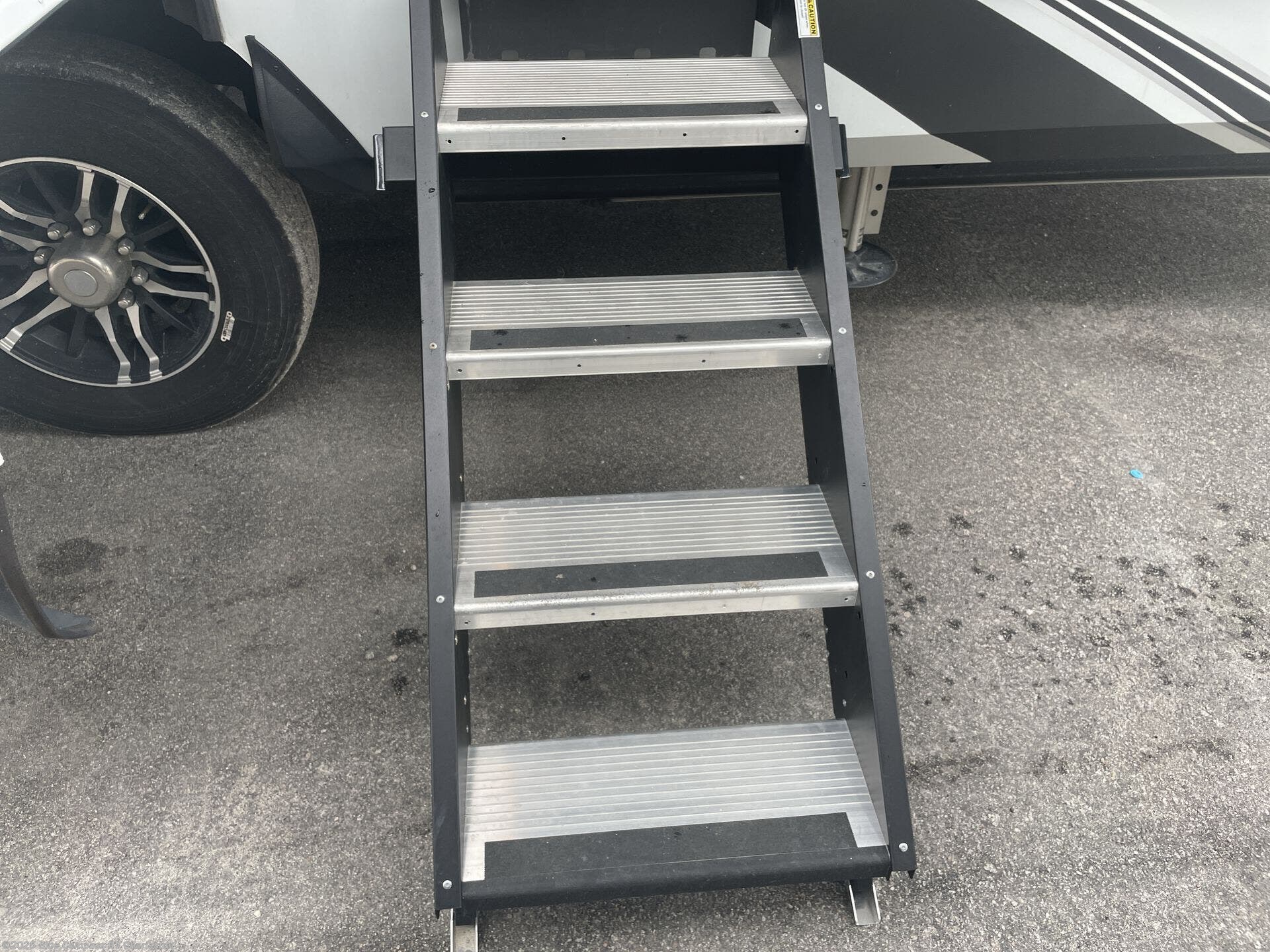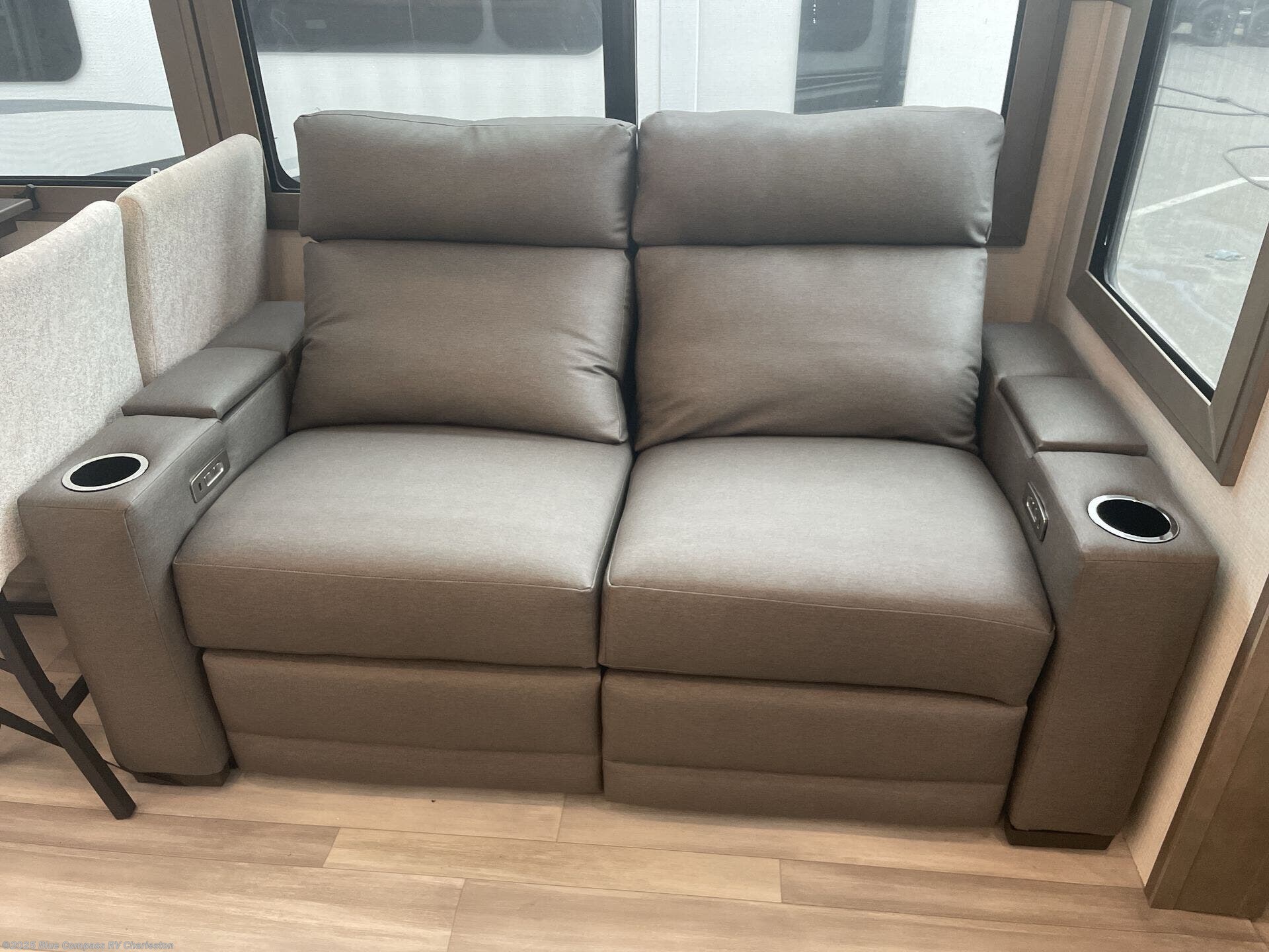 Traveling for long periods at a time is made easy with this gourmet kitchen that can feed your entire group a holiday meal! The professional-grade stainless steel cooktop with a built-in 24" residential oven, microwave, 12V 20 cu. ft. refrigerator, and a kitchen island offers everything you will need to enjoy cooking for your family and guests. There is abundant storage throughout multiple overhead cabinets, a kitchen pantry and hutch, show storage under the interior steps, a bath linen cabinet for your towels, and in the front master bedroom which features a large closet. In the bedroom there is also a queen bed on a slide for added space to sleep comfortable at night, or you may choose an optional king bed if you enjoy more space. You will also find a closet prepped for an optional washer/dryer, large wardrobe, plus a flip-top dresser with an LED TV above. In the bathroom, enjoy a hot shower with a flip-up teak seat and overhead skylight, plus a vanity with sink. Two nice awnings will provide outdoor living space keeping you protected from the sun and rain, and you can add an optional pull-out kitchen to enjoy convenient cooking outdoors as well.