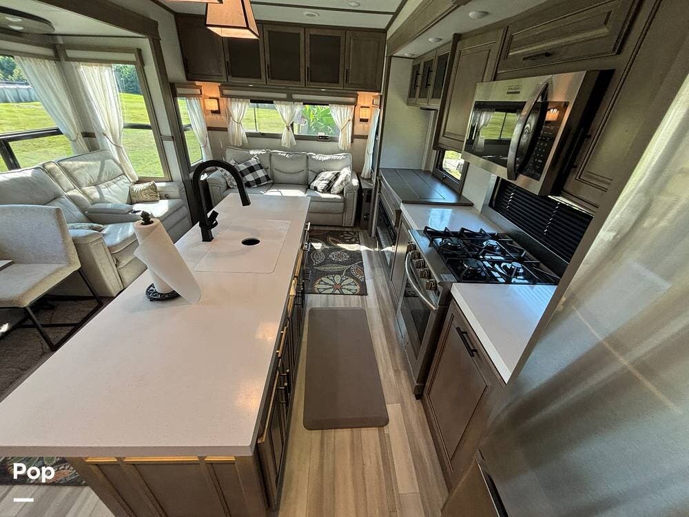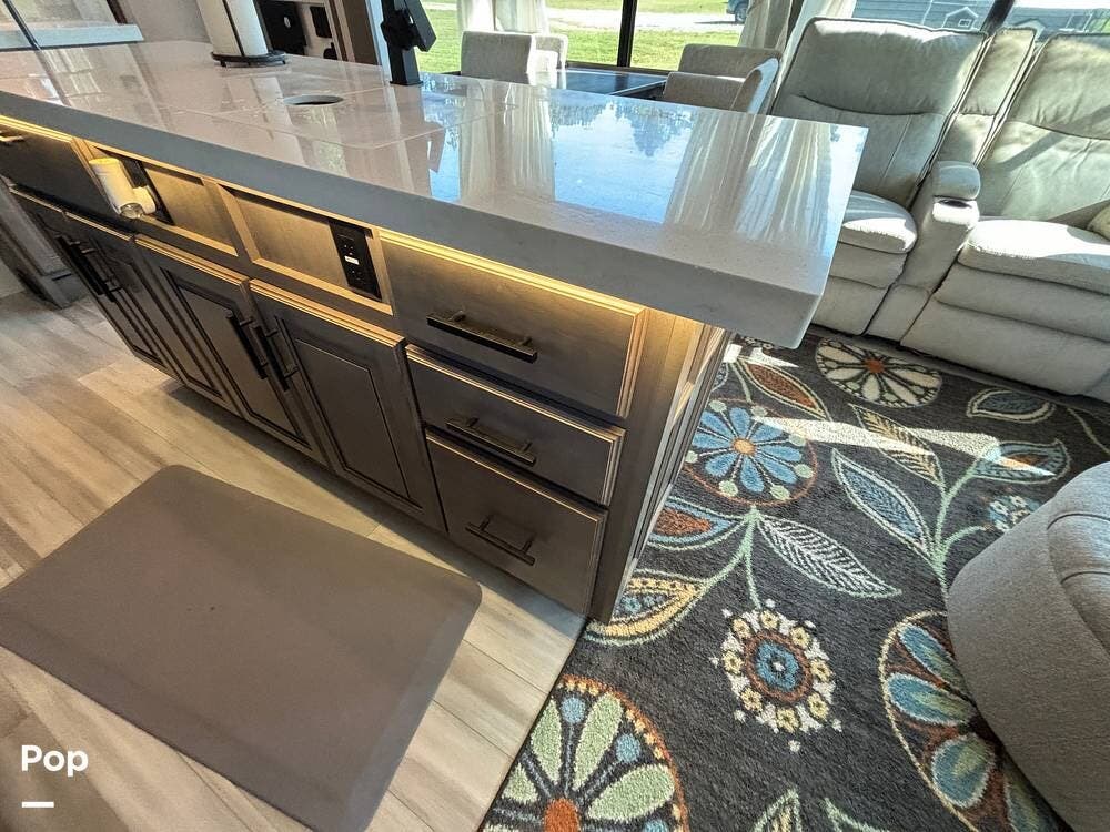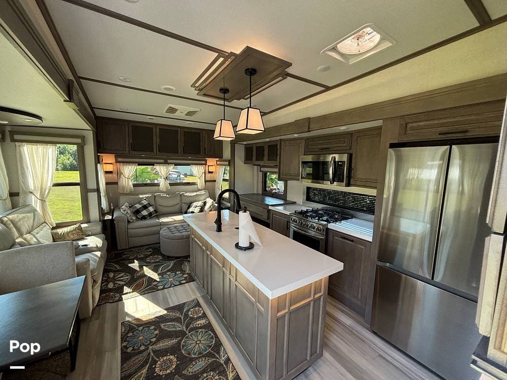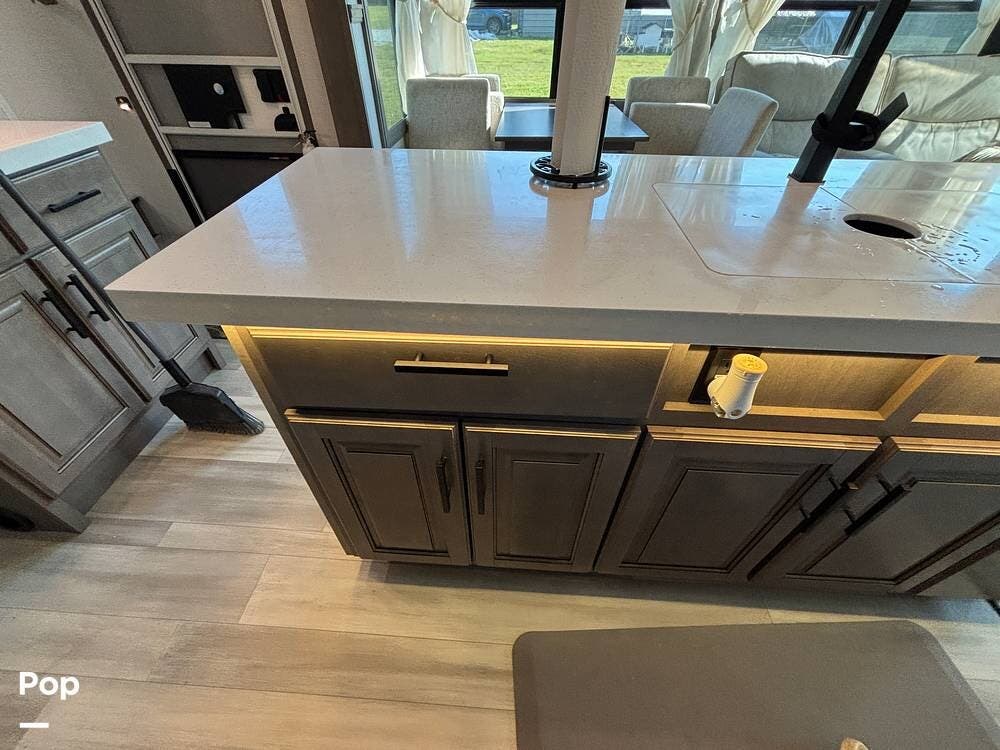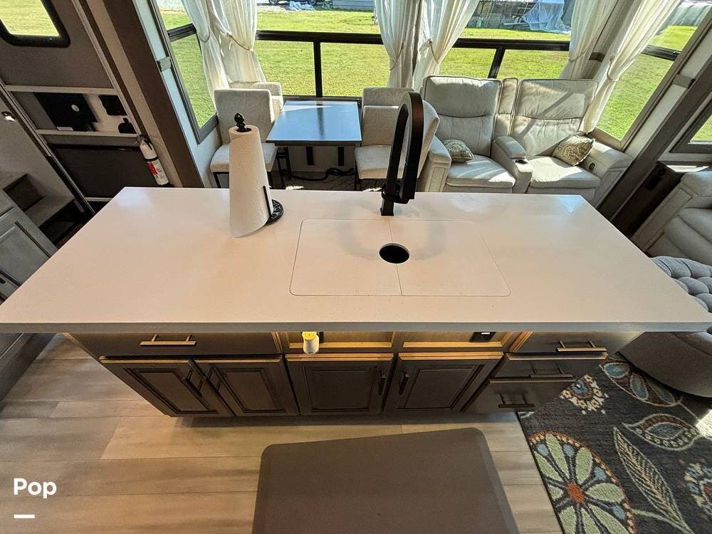 The kitchen is outfitted for full-time living or extended trips. It features a large center island with a deep sink and storage space below, along with ample counter space for meal preparation. Residential appliances, including a full-size refrigerator, microwave, and oven, make cooking easy. The overhead cabinets and large pantry provide ample space for storing dry goods and kitchenware. A freestanding dinette is situated to the side, offering a comfortable spot to enjoy meals or work while on the road.