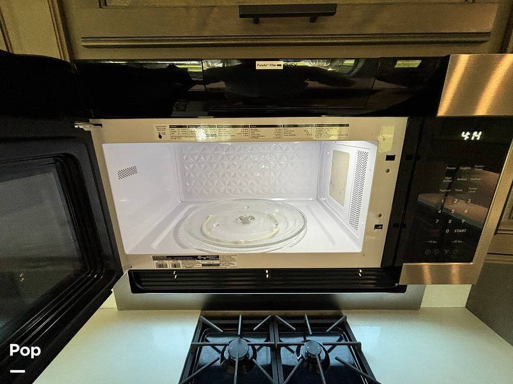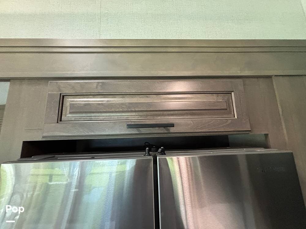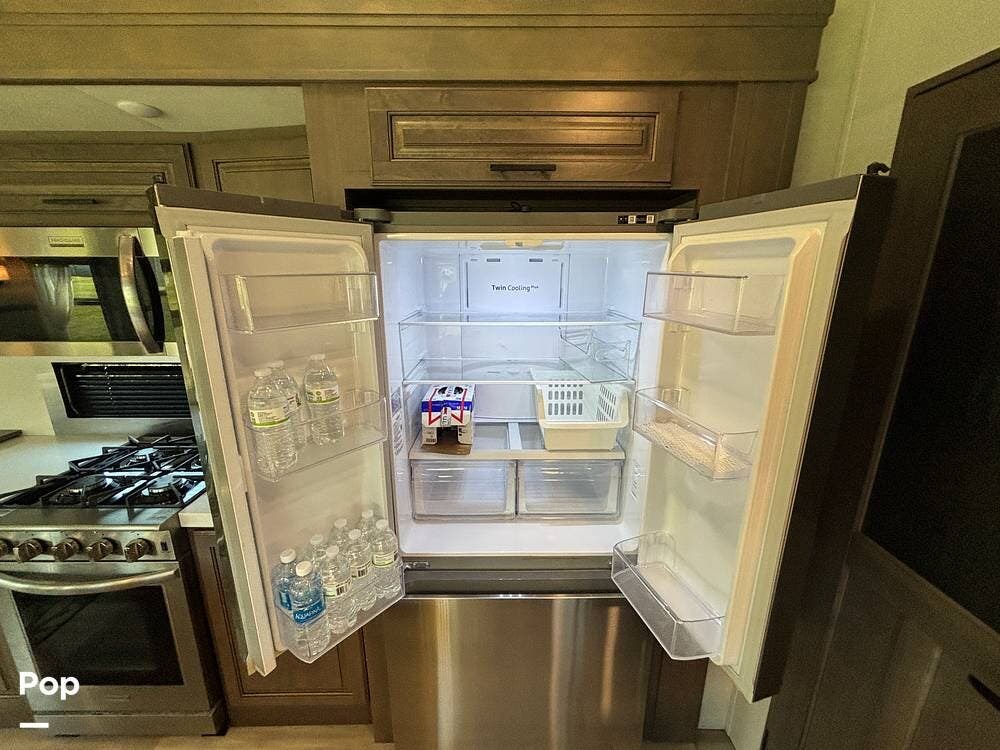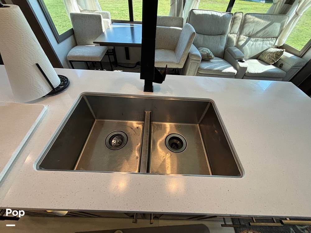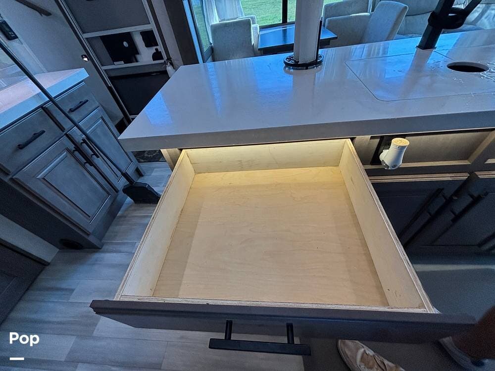 The kitchen is outfitted for full-time living or extended trips. It features a large center island with a deep sink and storage space below, along with ample counter space for meal preparation. Residential appliances, including a full-size refrigerator, microwave, and oven, make cooking easy. The overhead cabinets and large pantry provide ample space for storing dry goods and kitchenware. A freestanding dinette is situated to the side, offering a comfortable spot to enjoy meals or work while on the road.