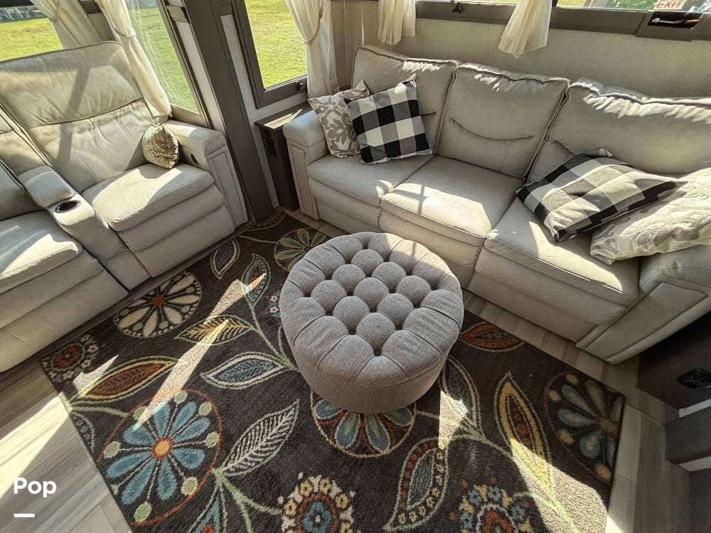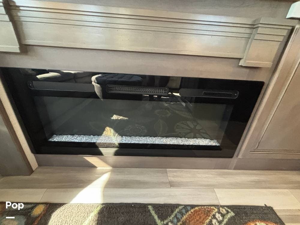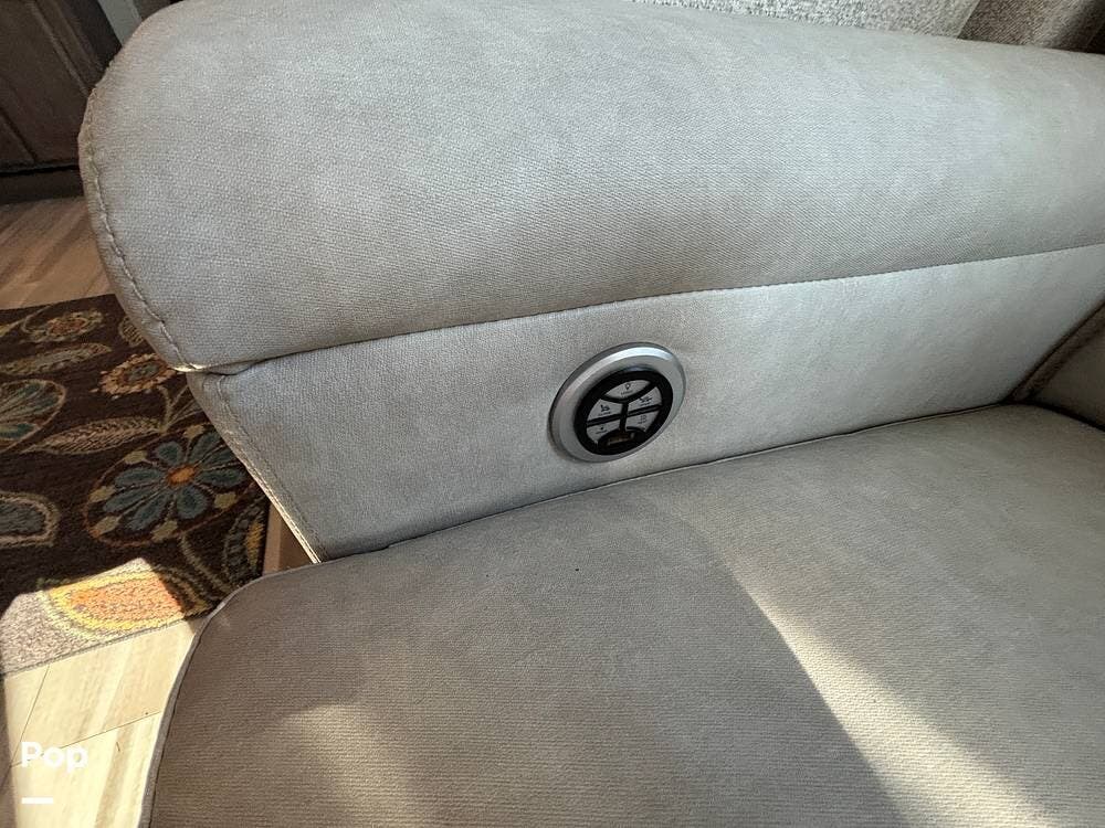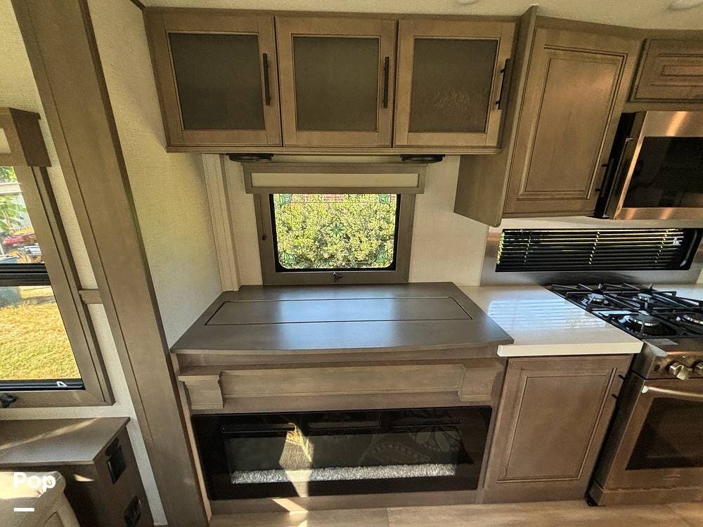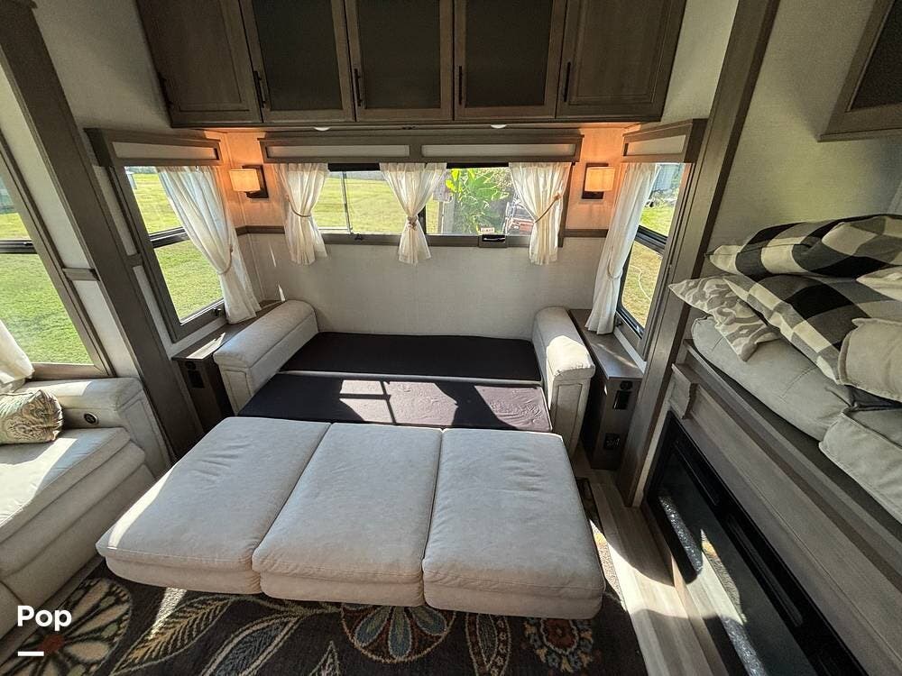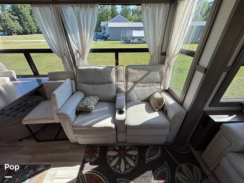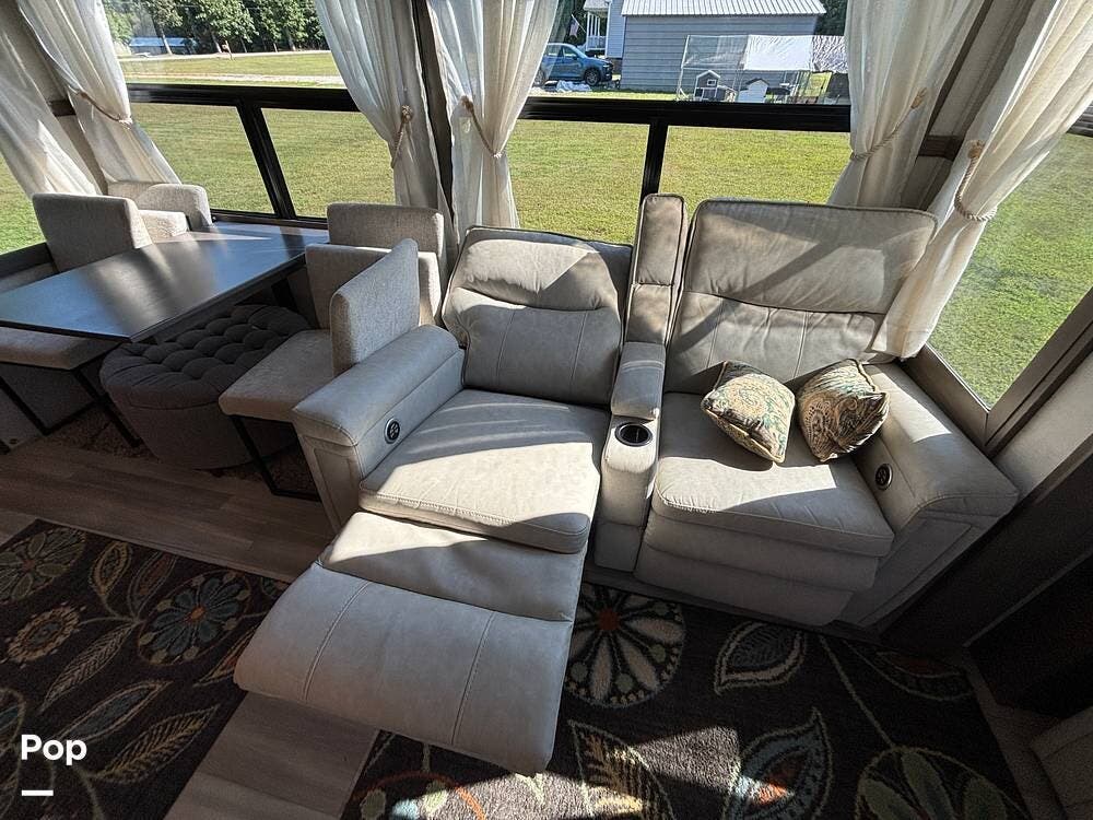 Inside, the main living space is designed with relaxation in mind. Opposing slides open the area to create a roomy feel, and large panoramic windows bring in natural light. A pair of theater seats faces the entertainment center, which features a fireplace and TV, and there's also a sofa at the rear that can be converted into extra sleeping space if needed. The high ceilings and residential-style finishes throughout create a spacious, home-like atmosphere.