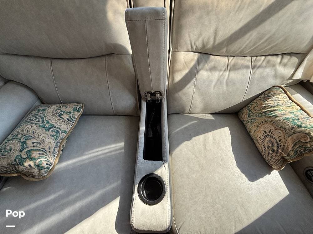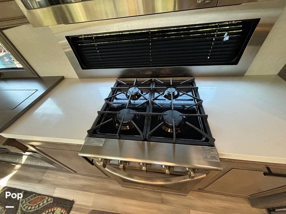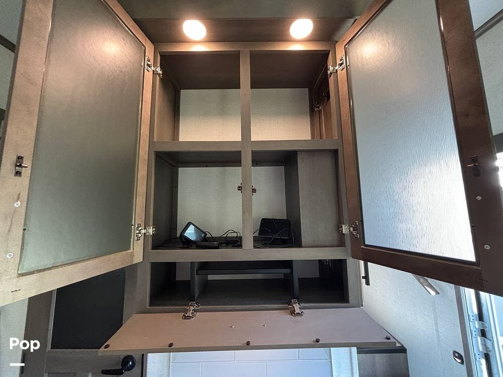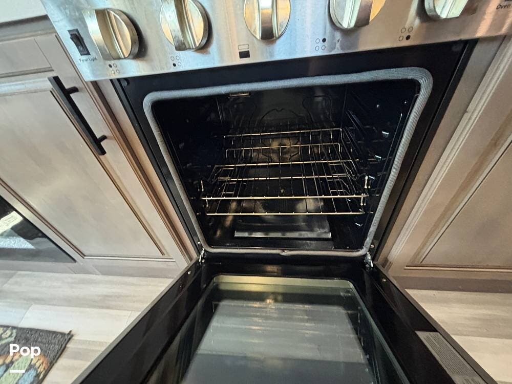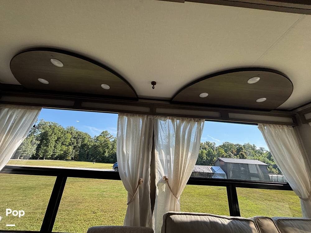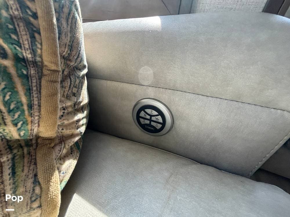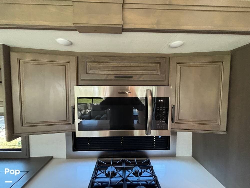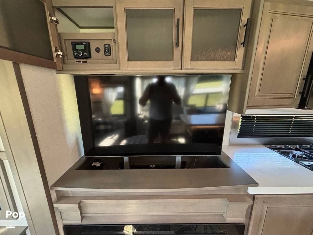Inside, the main living space is designed with relaxation in mind. Opposing slides open the area to create a roomy feel, and large panoramic windows bring in natural light. A pair of theater seats faces the entertainment center, which features a fireplace and TV, and there's also a sofa at the rear that can be converted into extra sleeping space if needed. The high ceilings and residential-style finishes throughout create a spacious, home-like atmosphere.