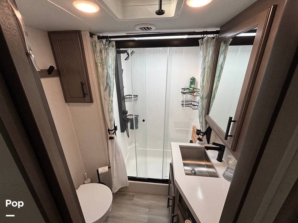 The bathroom is located just off the bedroom and is designed with residential touches. It features a spacious shower with glass doors and a built-in seat, complemented by a skylight that allows natural light to enter. The vanity has a solid-surface countertop, sink, and medicine cabinet for storage, and the porcelain toilet provides durability. Additional shelving and storage areas help keep toiletries and linens organized, making the bathroom both functional and comfortable.