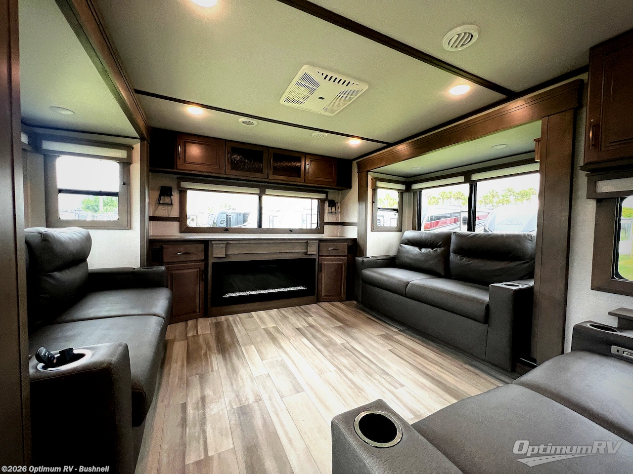 Each minute spent in this spacious fifth wheel will feel just like home! The rear living area includes a rear entertainment center with an LED Smart TV and fireplace, overhead cabinets, theater seating, plus two tri-fold sofas for your guests to sleep on. You will have the front private bedroom all to yourselves with a queen bed slide out that can be switched out for an optional king bed, and the front closet provides all the space you need to store your belongings. This model includes a spacious full bath with a flip-up teak seat, a shower skylight, plus dual bath sinks for ultimate convenience. The chef of your group will love the middle kitchen with its convenient island including double sink, residential cooktop and 24" oven, 20 cu. ft. refrigerator, and free-standing dinette plus a hutch and buffet for storage. Head outdoors to find a 16' power awning with LED lights and middle pass through along with rear storage including a sliding tray, and you might want to add the optional pull-out kitchen.
