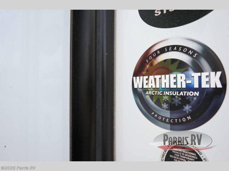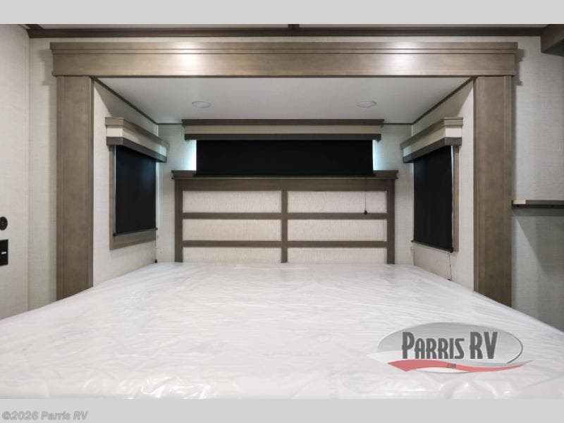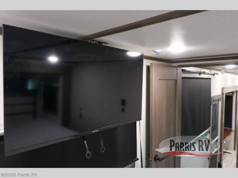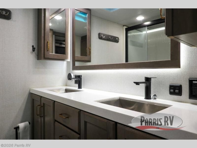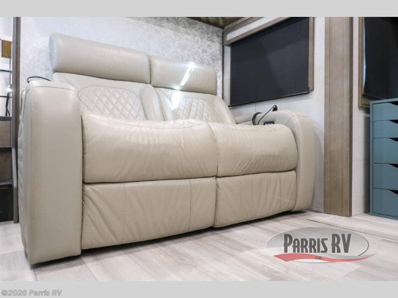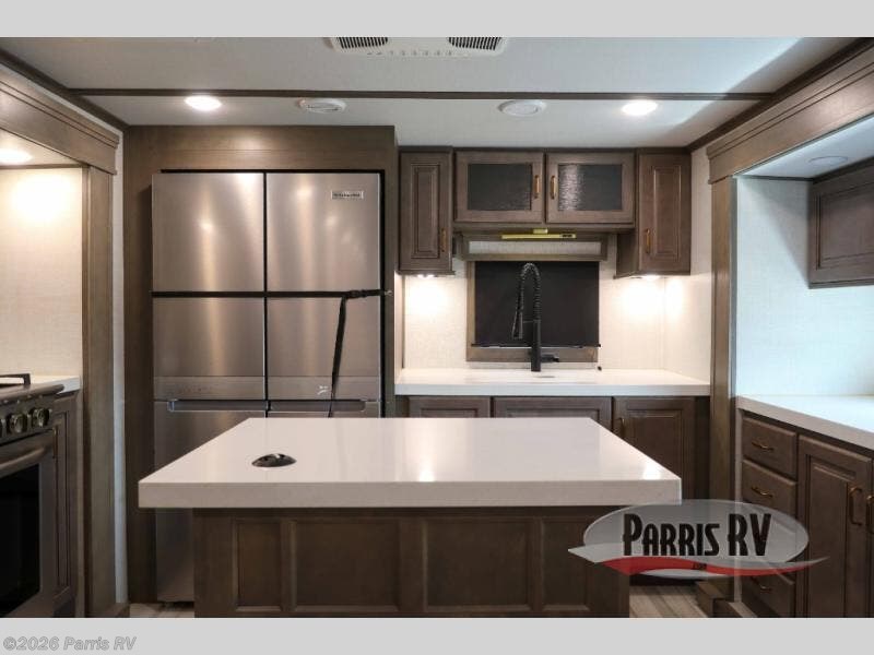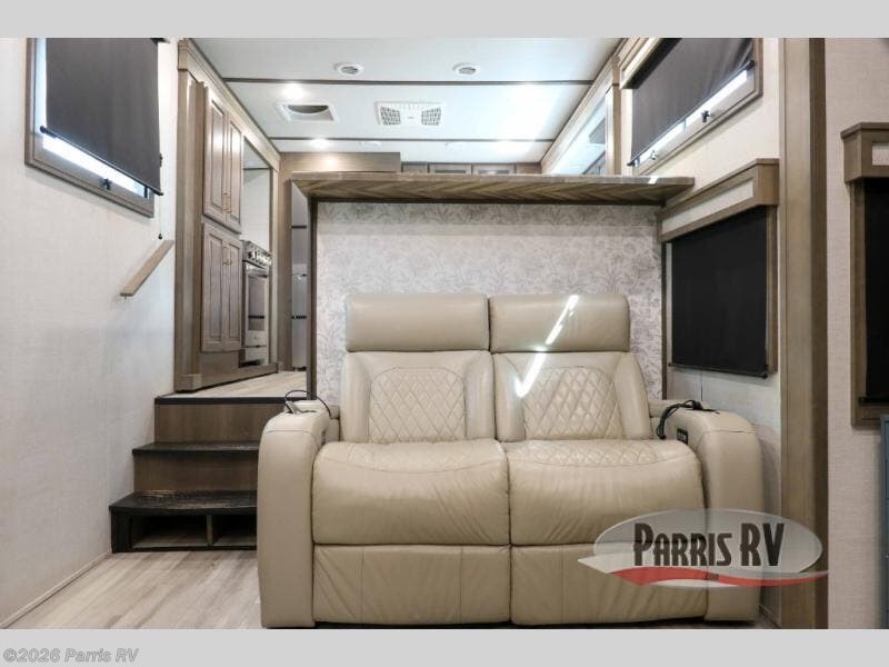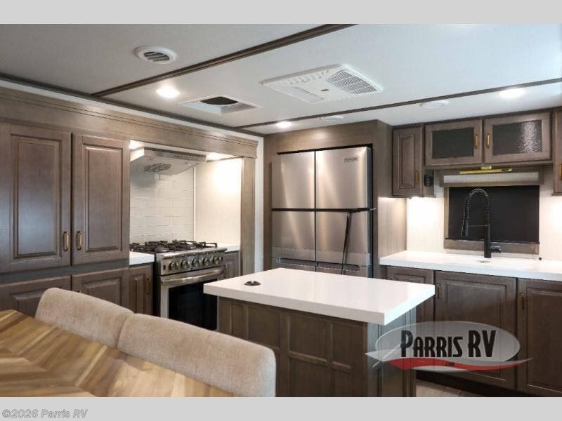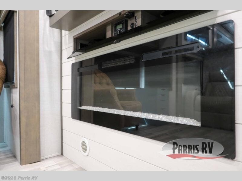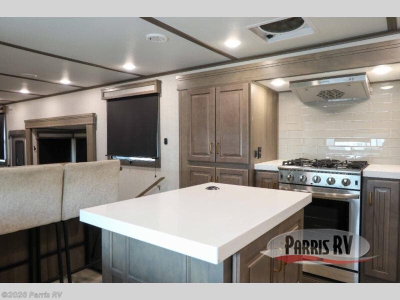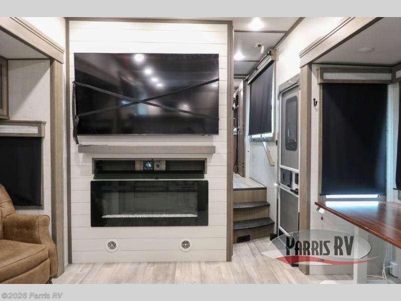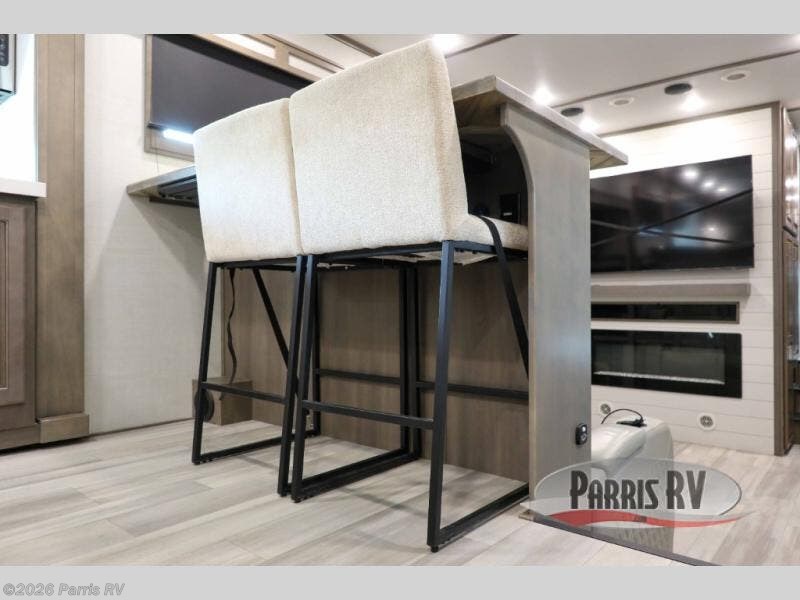Enjoy each and every vacation, month-long trips, or even extended stays at an RV park in this spacious fifth wheel! The raise rear kitchen gives the cook plenty of room to whip up any type of meal using the stainless steel appliances including a 24" residential oven, an oversized pantry, and the raised bar top will provide you even more counter space on top of dining with two chairs that overlook the middle living area. Relaxing is made easy thanks to two tri-fold sofas and theatre seating while watching the big game on the LED Smart TV and enjoying the fireplace below. Dual sinks in the full bathroom allow two people to easily get ready at once, and the flip up teak seat in the shower is a nice convenience. At night, retire to your own queen bed which slides out to provide more floor space, and enjoy a show on the LED TV above the flip-top dresser once in bed.