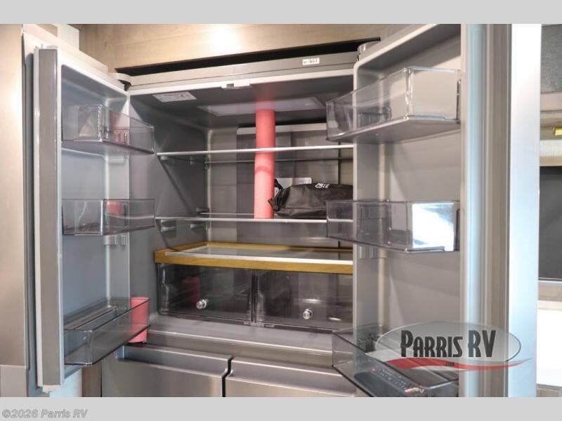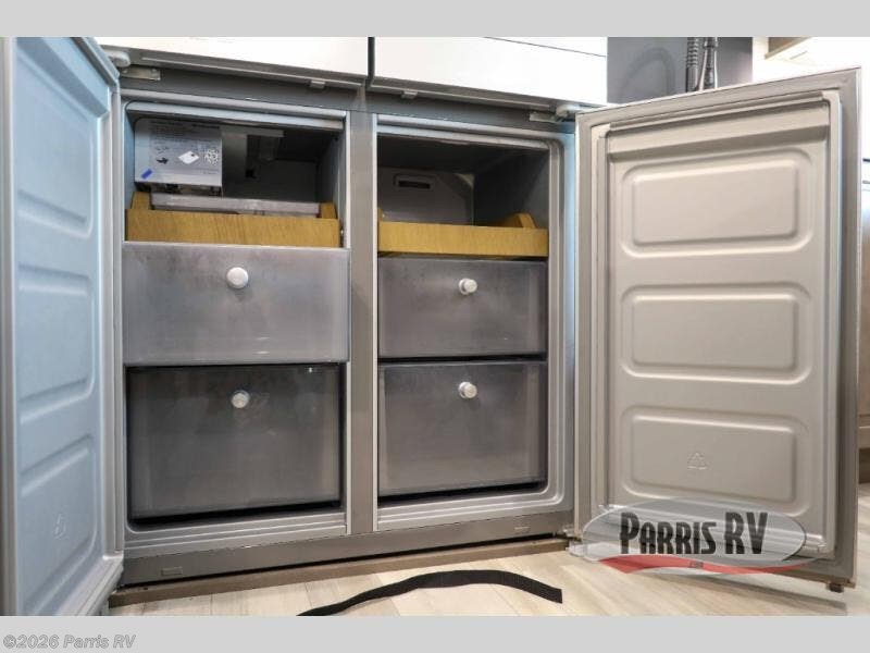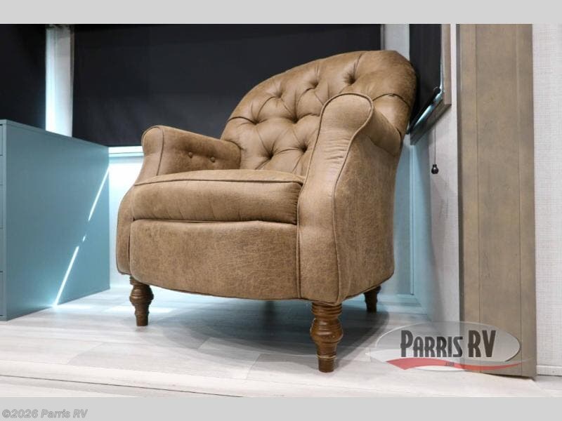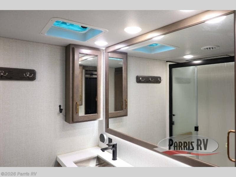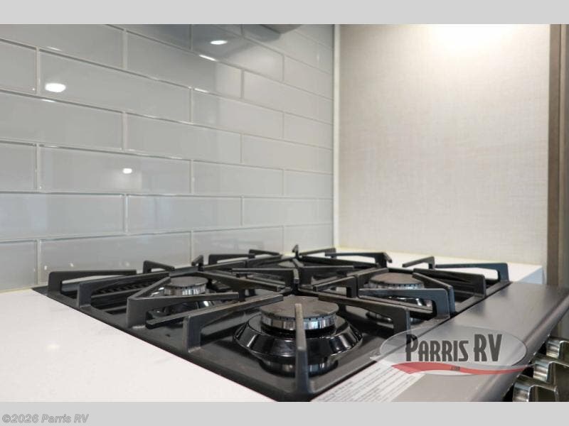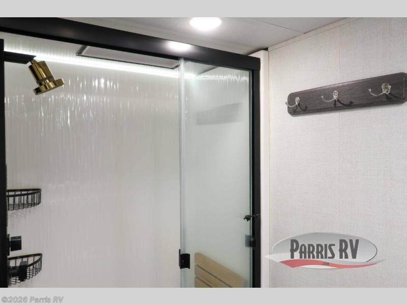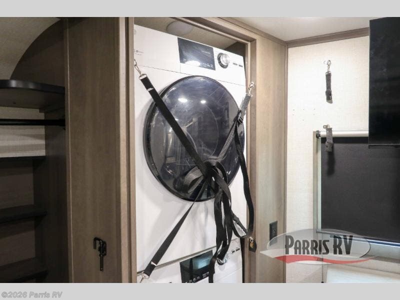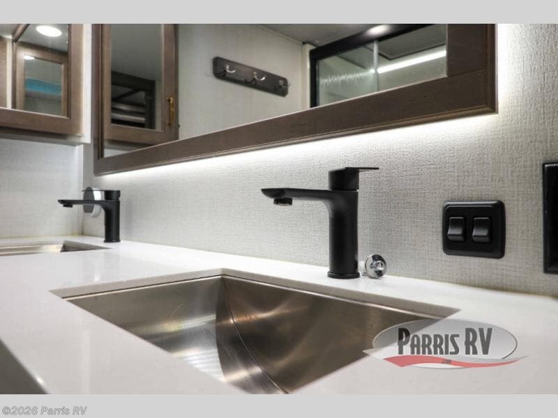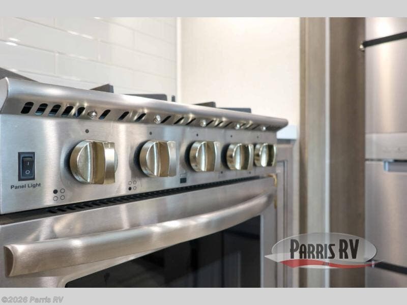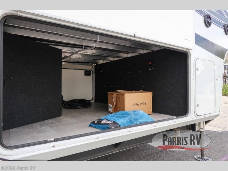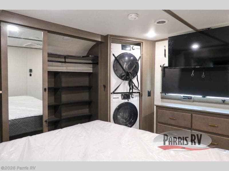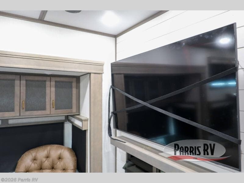 Enjoy each and every vacation, month-long trips, or even extended stays at an RV park in this spacious fifth wheel! The raise rear kitchen gives the cook plenty of room to whip up any type of meal using the stainless steel appliances including a 24" residential oven, an oversized pantry, and the raised bar top will provide you even more counter space on top of dining with two chairs that overlook the middle living area. Relaxing is made easy thanks to two tri-fold sofas and theatre seating while watching the big game on the LED Smart TV and enjoying the fireplace below. Dual sinks in the full bathroom allow two people to easily get ready at once, and the flip up teak seat in the shower is a nice convenience. At night, retire to your own queen bed which slides out to provide more floor space, and enjoy a show on the LED TV above the flip-top dresser once in bed.