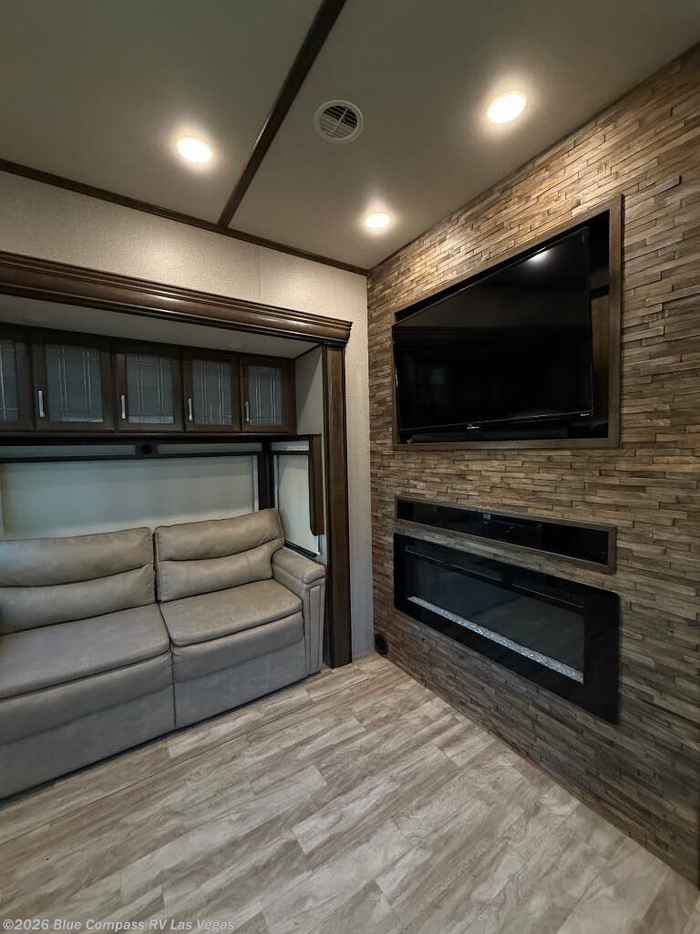 Enjoy each and every vacation, month-long trips, or even extended stays at an RV park in this spacious fifth wheel! The raise rear kitchen gives the cook plenty of room to whip up any type of meal using the stainless steel appliances including a 24" residential oven, an oversized pantry, and the raised bar top will provide you even more counter space on top of dining with two chairs that overlook the middle living area. Relaxing is made easy thanks to two tri-fold sofas and theatre seating while watching the big game on the LED Smart TV and enjoying the fireplace below. Dual sinks in the full bathroom allow two people to easily get ready at once, and the flip up teak seat in the shower is a nice convenience. At night, retire to your own queen bed which slides out to provide more floor space, and enjoy a show on the LED TV above the flip-top dresser once in bed.