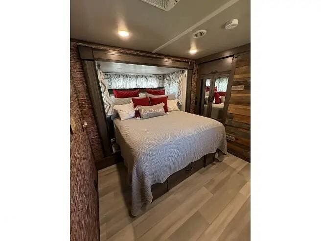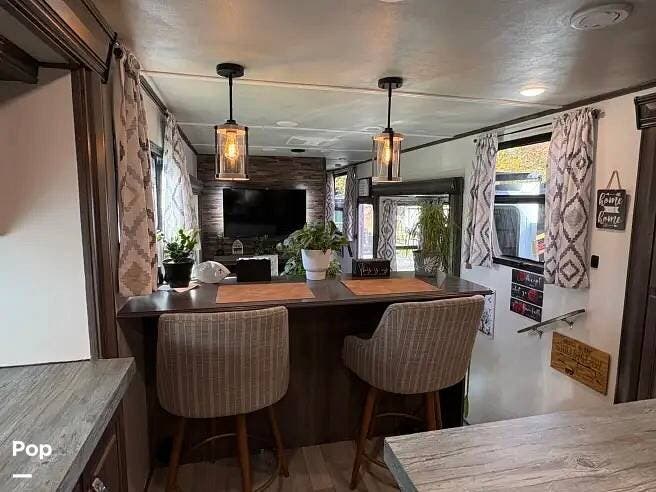 Internally, it features dual recliners, dual sleeper sofas, an entertainment center, a fireplace, LED interior and exterior lighting, washer/dryer connections, and modern, stylish overhead lighting. It also has a pub-style dining area, a residential stove, and a refrigerator in the kitchen. Towards the front, you'll find a full-size bath with dual sinks, and then the master B/R with a queen bed and a flip-top dresser with a wall-mounted flat-panel TV.