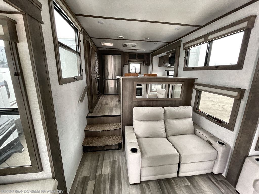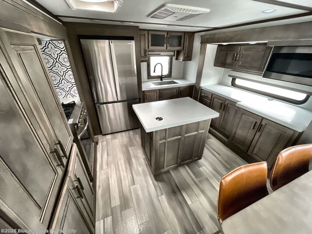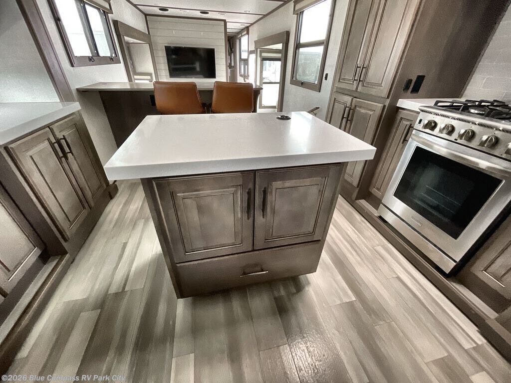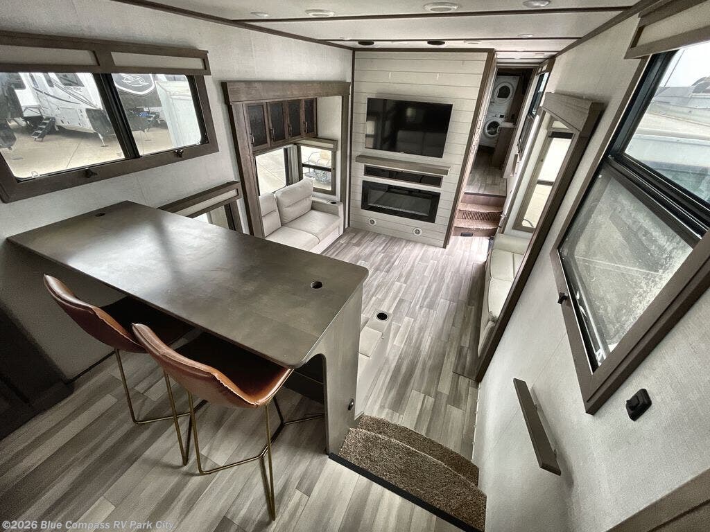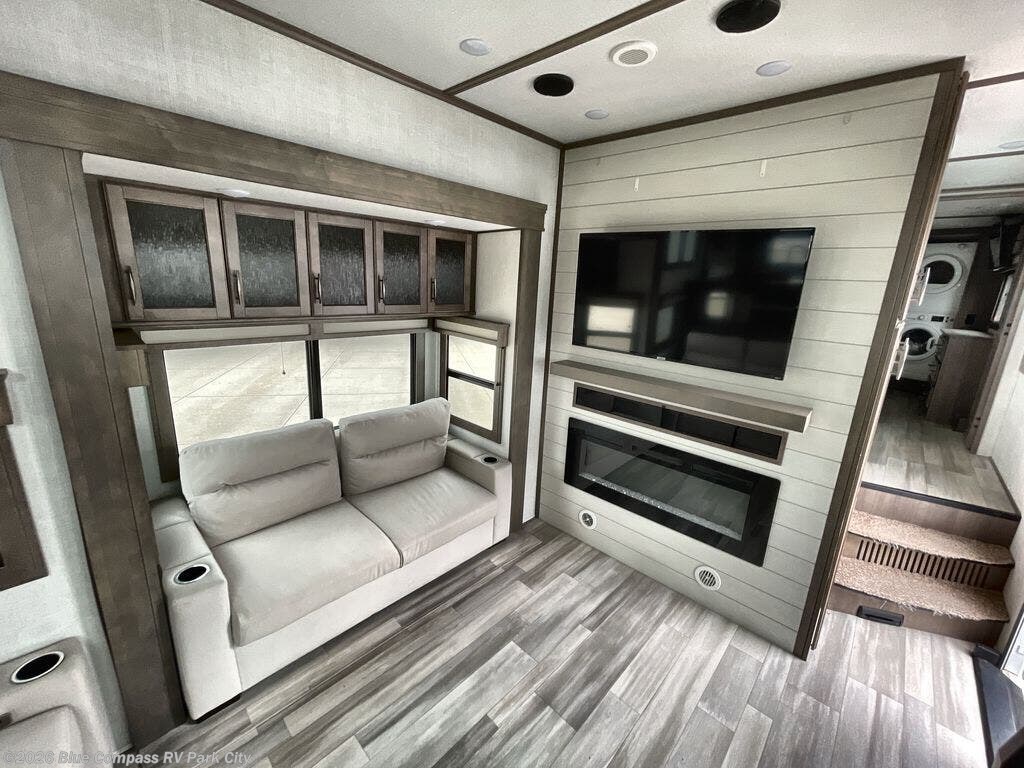 Enjoy each and every vacation, month-long trip or even extended stay at an RV park in this fifth wheel that is spacious from the front to the rear! The raised kitchen gives the cook plenty of room to whip up any type of meal using the stainless steel appliances including the 24" residential oven, the oversized pantry and the raised bar top will provide you even more counter space on top of dining with two chairs that overlook the middle living area. Relaxing is made easy with the two tri-fold sofas and theatre seating while watching the big game on the LED Smart TV and enjoying the fireplace below. Dual sinks in the full bathroom allow two people to easily get ready at once, and the seat in the shower is a nice convenience. At night, retire to your own king bed slide after sitting on the pull-out ottoman to take your shoes off, and enjoy a show on the LED TV above the flip-top dresser, or wash some linens in the closet with a washer/dryer if you added that option.