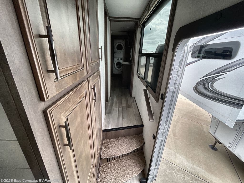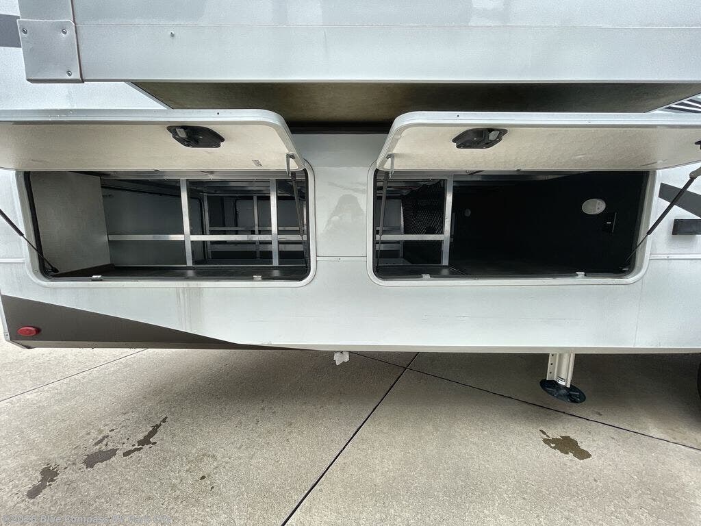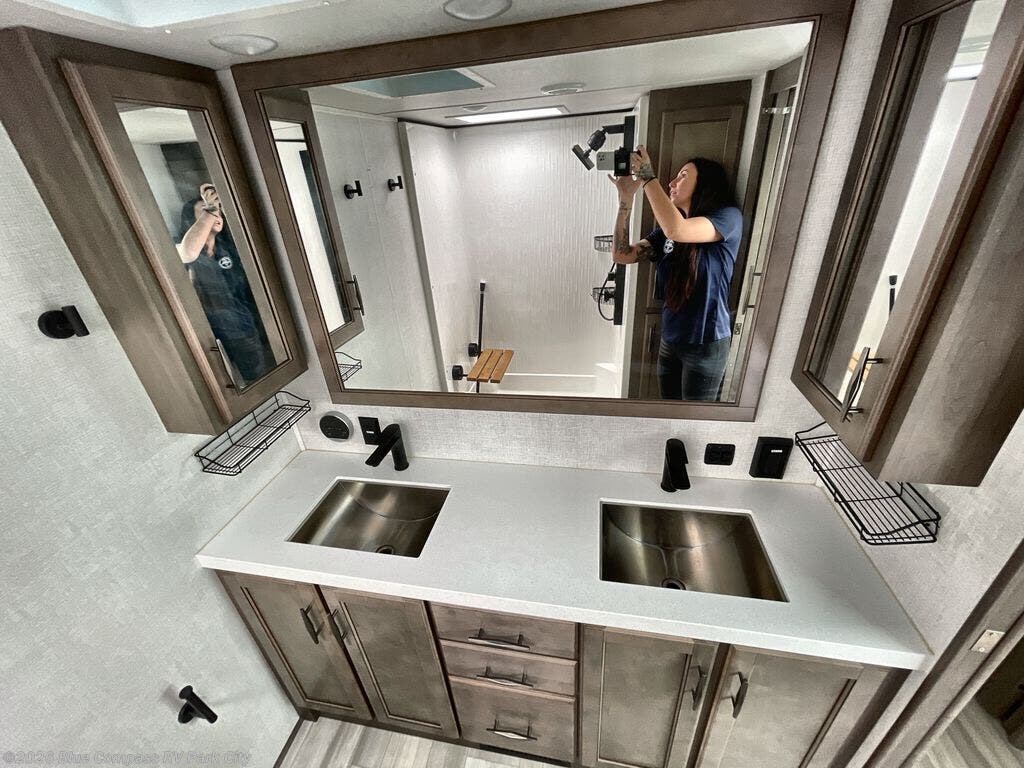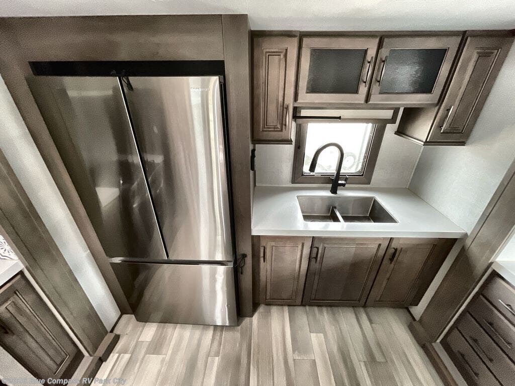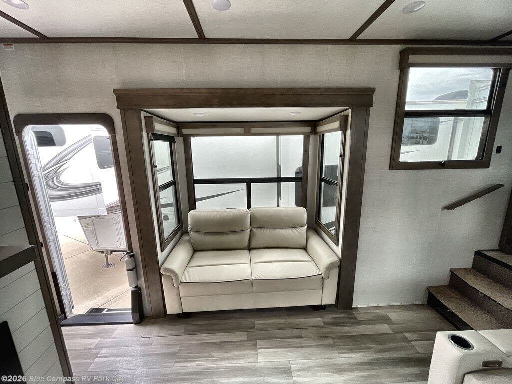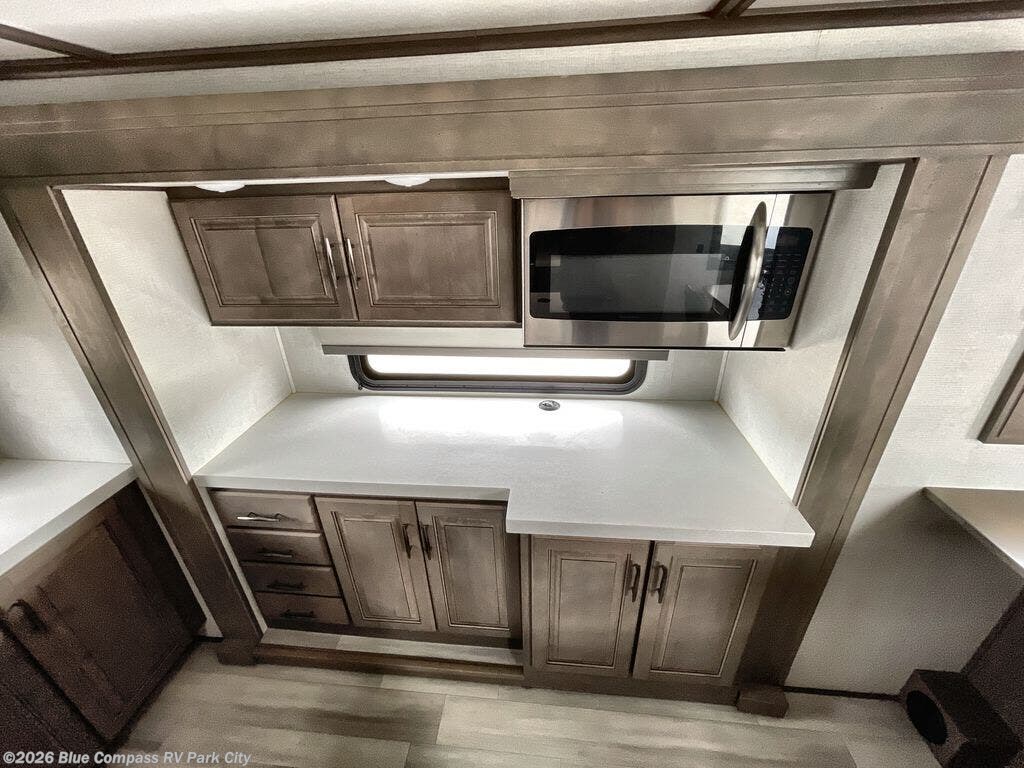 Enjoy each and every vacation, month-long trip or even extended stay at an RV park in this fifth wheel that is spacious from the front to the rear! The raised kitchen gives the cook plenty of room to whip up any type of meal using the stainless steel appliances including the 24" residential oven, the oversized pantry and the raised bar top will provide you even more counter space on top of dining with two chairs that overlook the middle living area. Relaxing is made easy with the two tri-fold sofas and theatre seating while watching the big game on the LED Smart TV and enjoying the fireplace below. Dual sinks in the full bathroom allow two people to easily get ready at once, and the seat in the shower is a nice convenience. At night, retire to your own king bed slide after sitting on the pull-out ottoman to take your shoes off, and enjoy a show on the LED TV above the flip-top dresser, or wash some linens in the closet with a washer/dryer if you added that option.