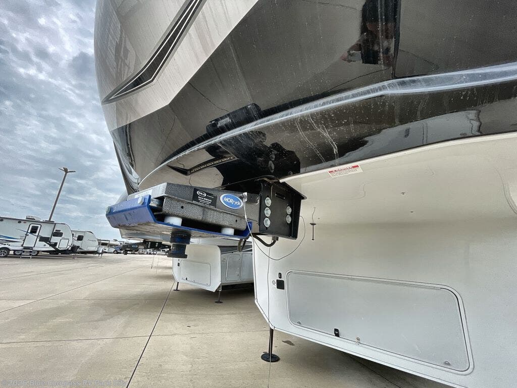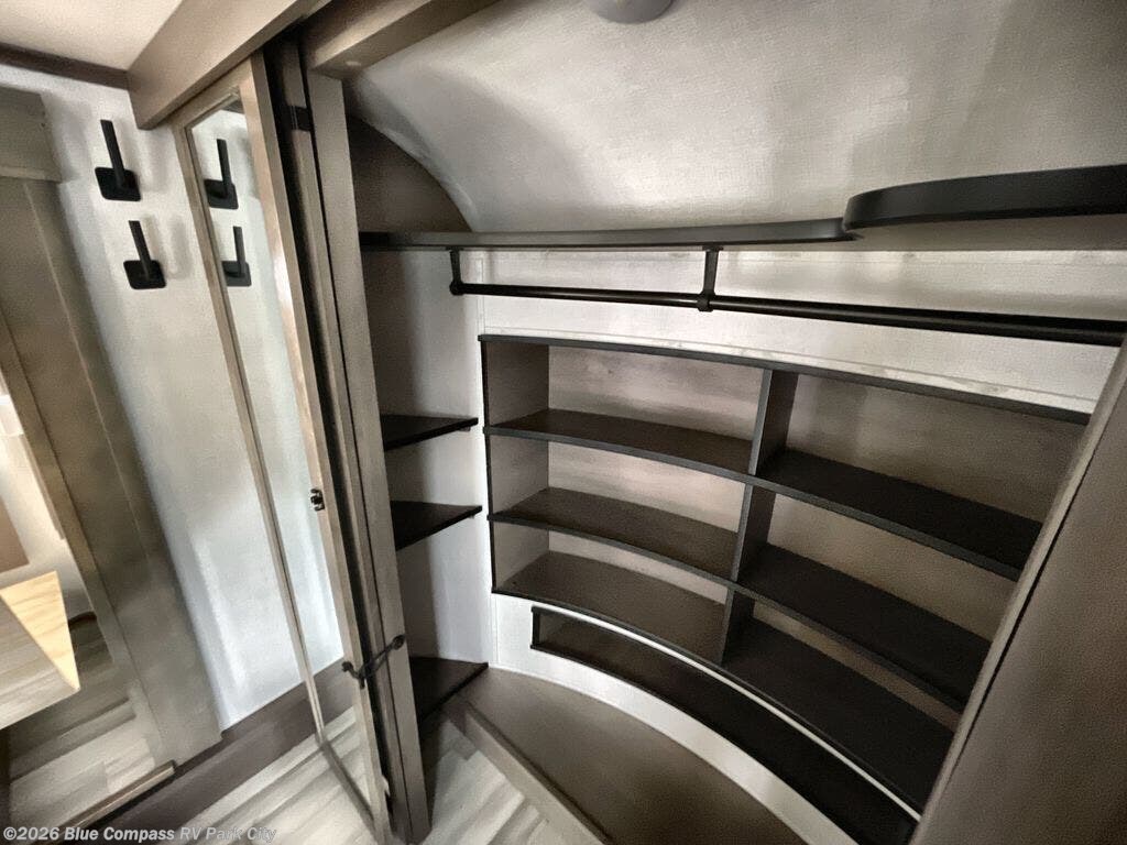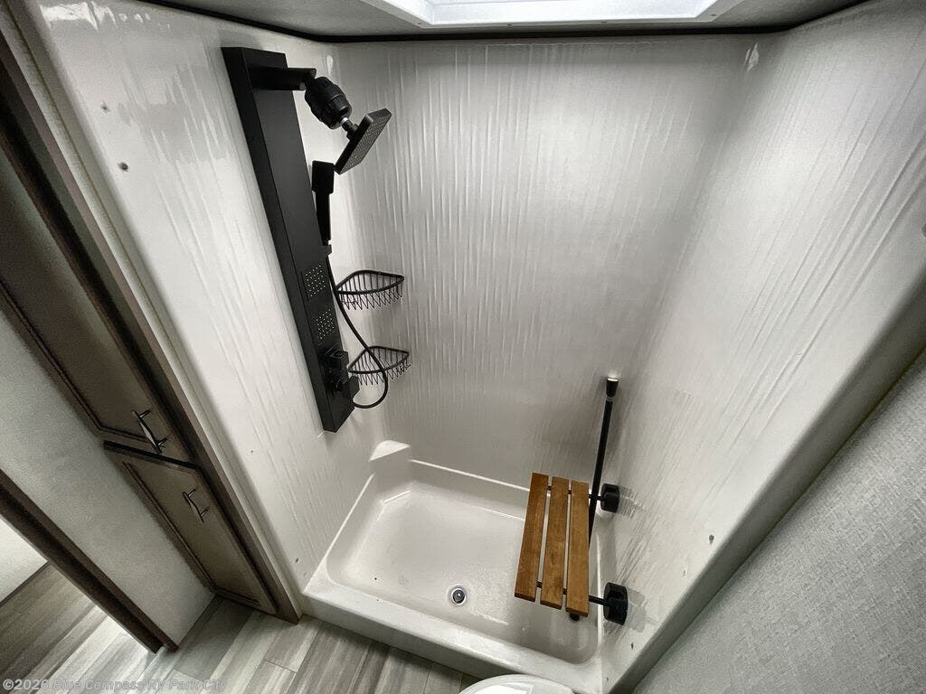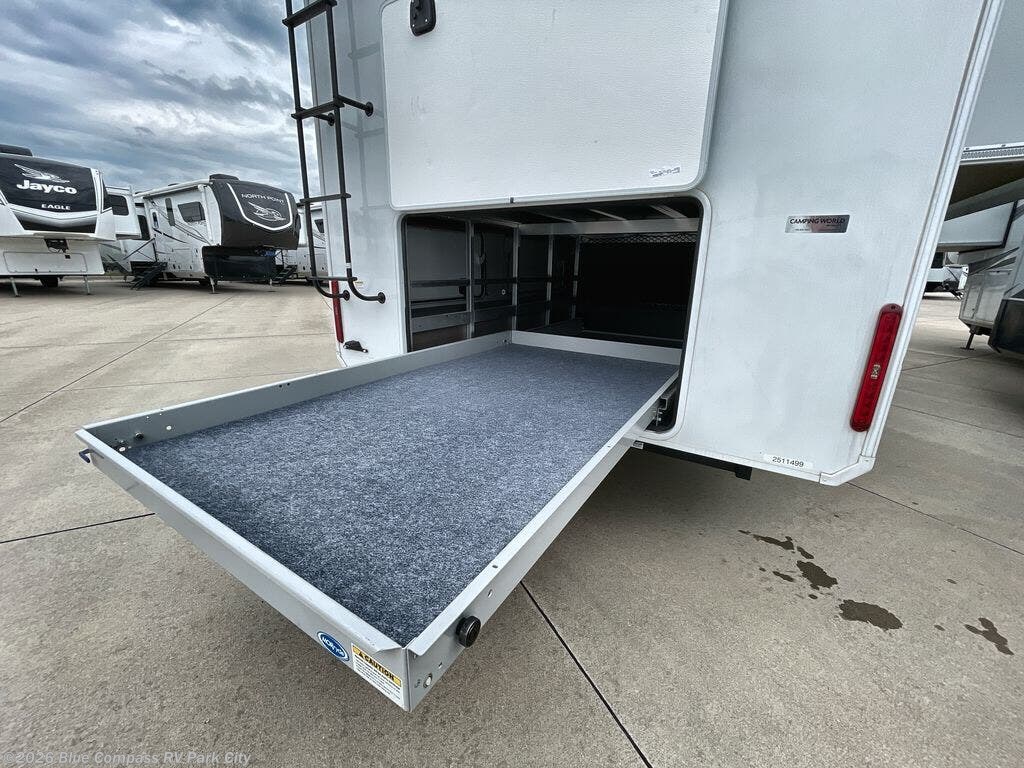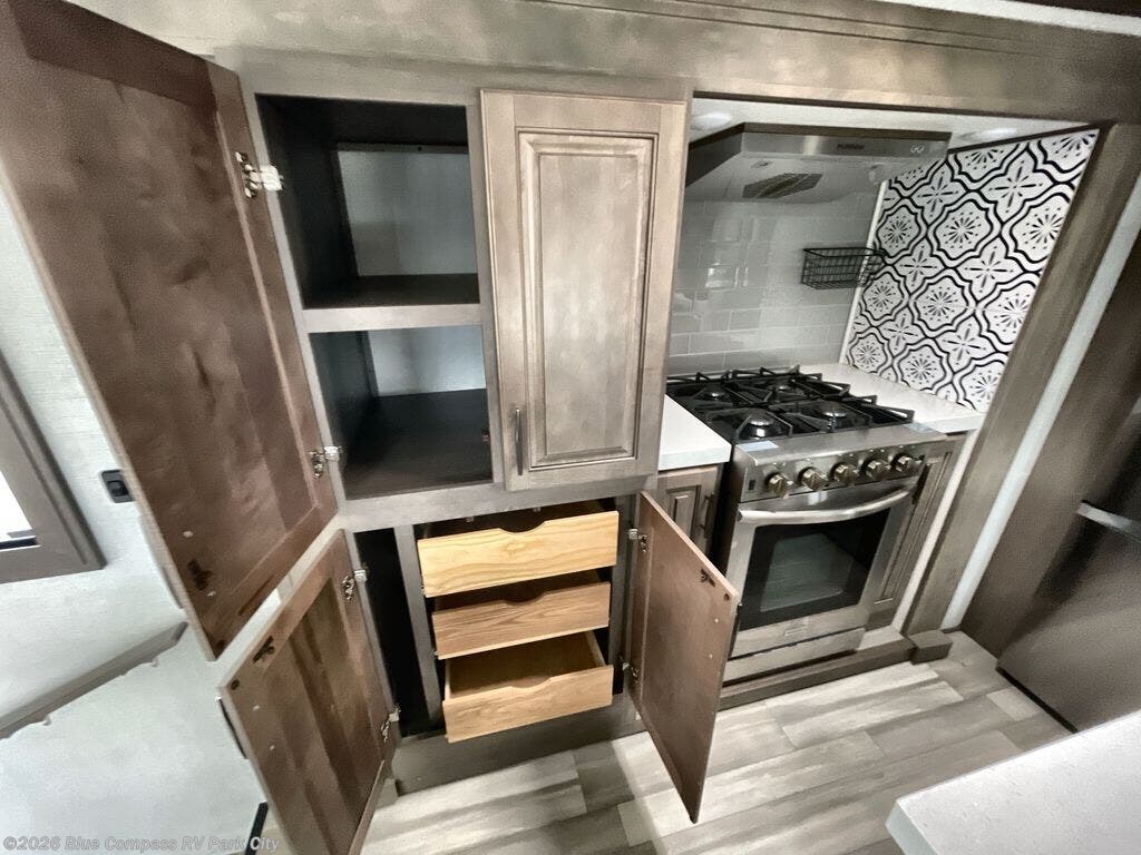 Enjoy each and every vacation, month-long trip or even extended stay at an RV park in this fifth wheel that is spacious from the front to the rear! The raised kitchen gives the cook plenty of room to whip up any type of meal using the stainless steel appliances including the 24" residential oven, the oversized pantry and the raised bar top will provide you even more counter space on top of dining with two chairs that overlook the middle living area. Relaxing is made easy with the two tri-fold sofas and theatre seating while watching the big game on the LED Smart TV and enjoying the fireplace below. Dual sinks in the full bathroom allow two people to easily get ready at once, and the seat in the shower is a nice convenience. At night, retire to your own king bed slide after sitting on the pull-out ottoman to take your shoes off, and enjoy a show on the LED TV above the flip-top dresser, or wash some linens in the closet with a washer/dryer if you added that option.