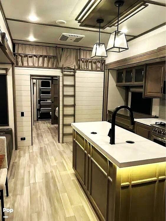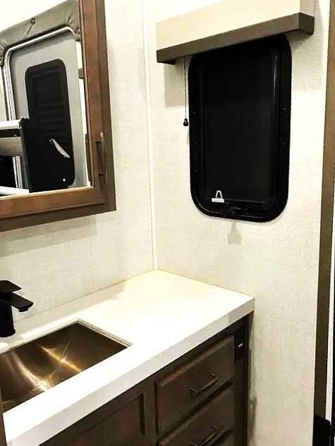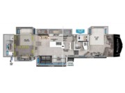 This spacious fifth wheel features a beautifully designed dual-living layout with two full bedrooms and two full baths, perfect for families or guests.