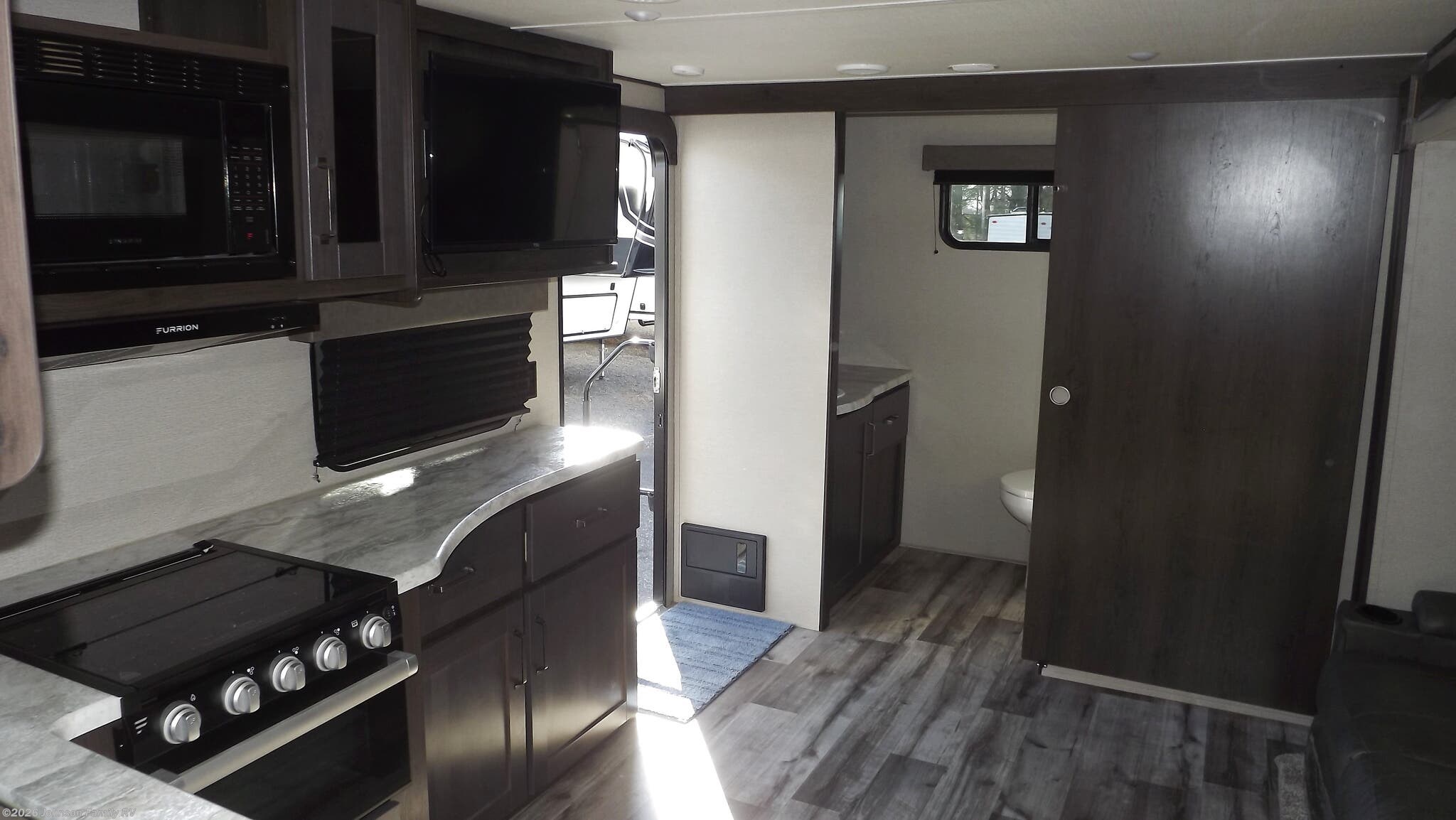 Floorplan 221RB places a front bedroom, mid kitchen, mid living area, and rear bath to maximize living space. The front bedroom offers privacy, while the mid kitchen and living area benefit from the slideout, expanding dining and seating options. A well-appointed bath at the rear keeps the layout practical for frequent travelers and guests.